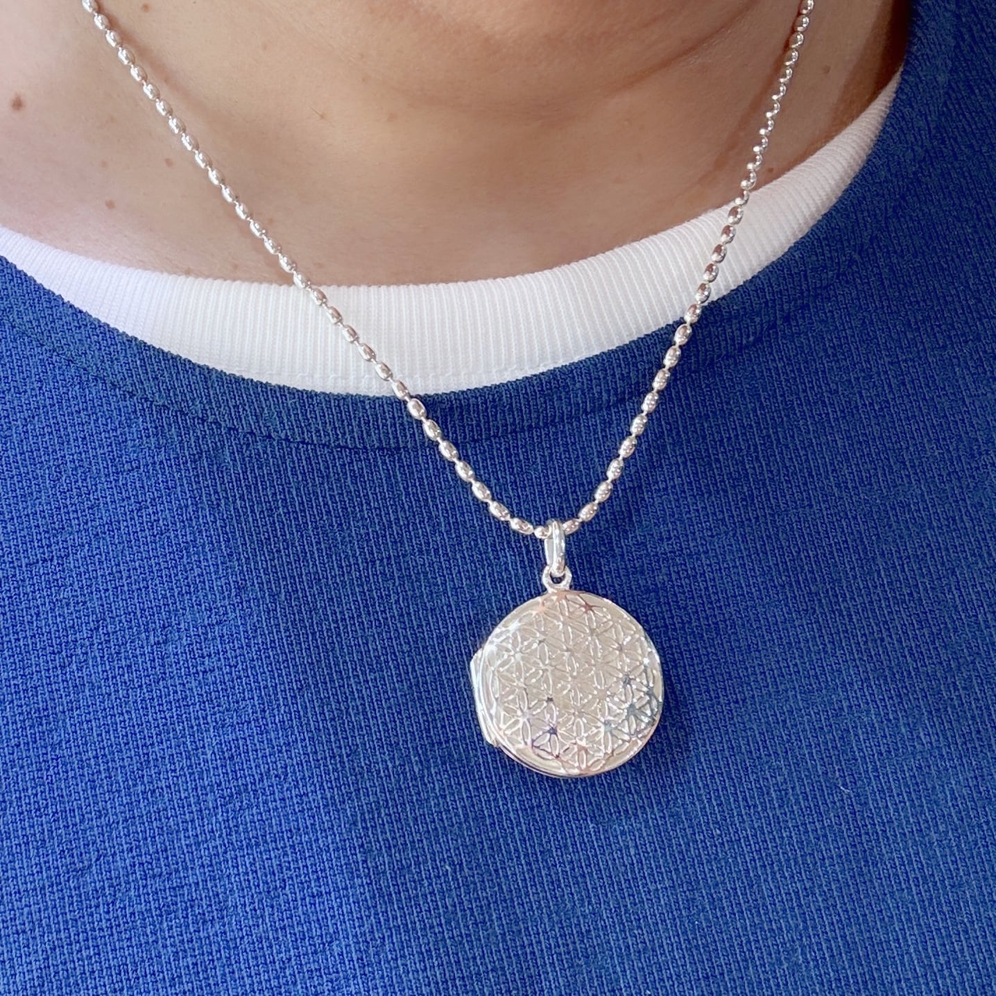 丸いロケットに幾何学模様のフラワーが一面スカシとなった美しいデザインです。