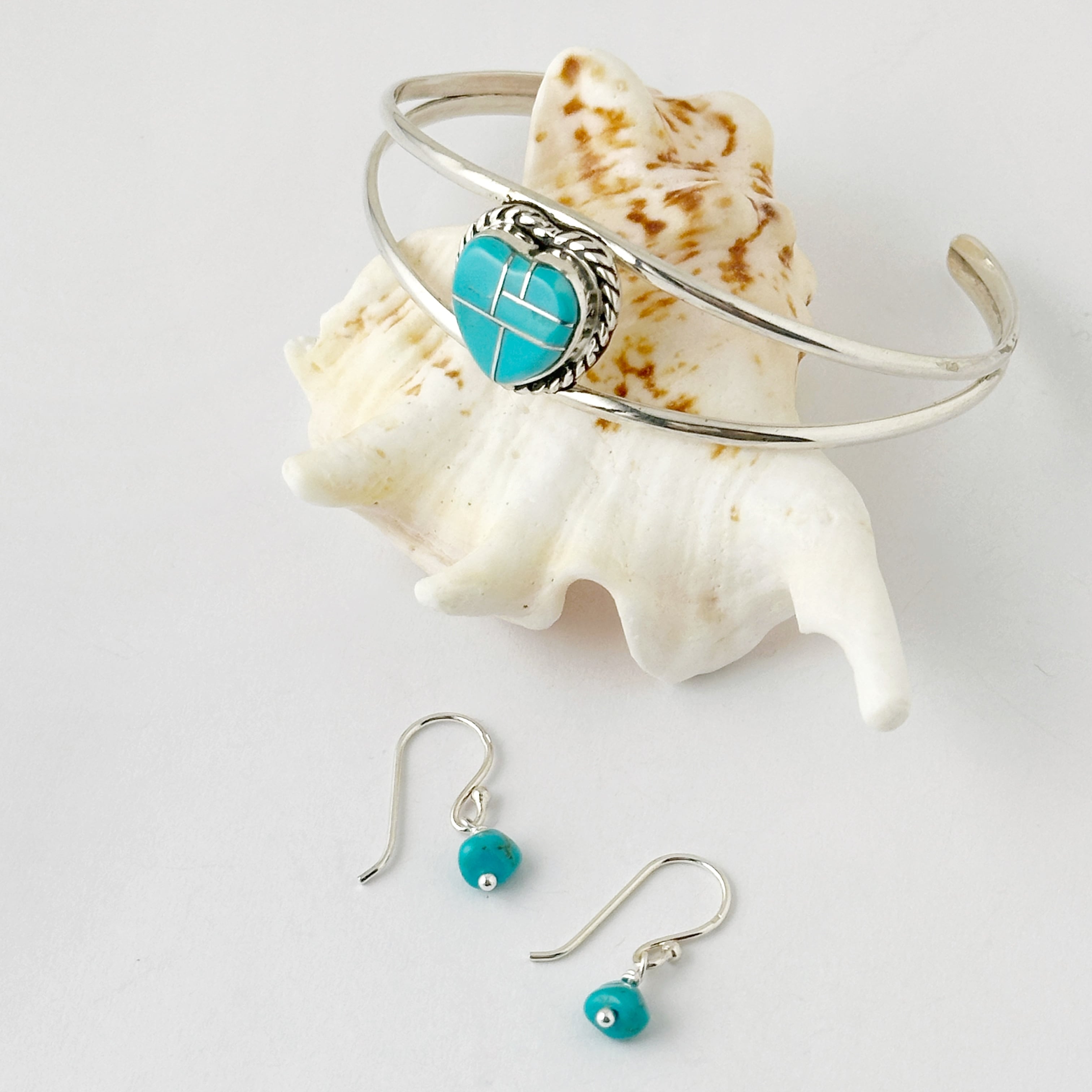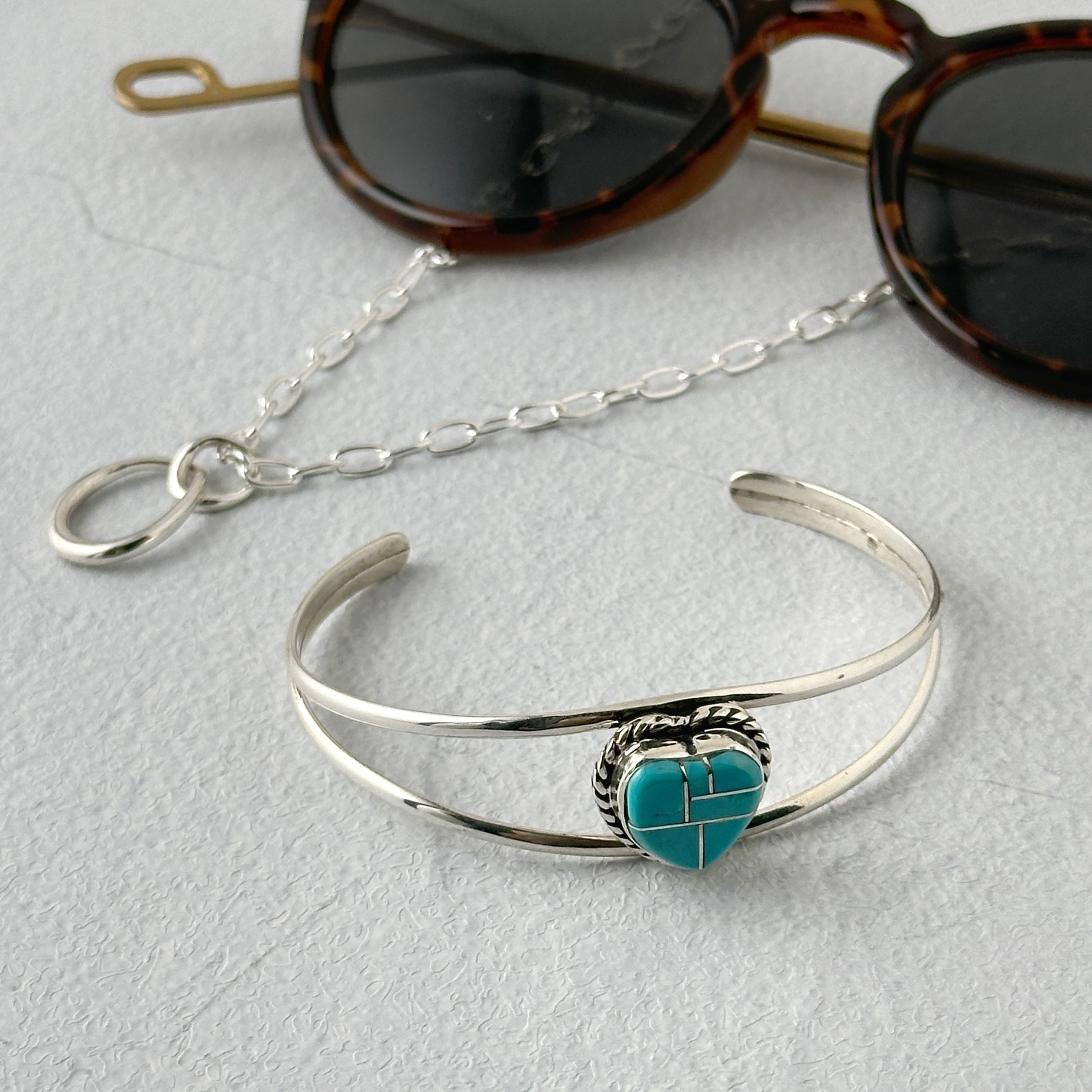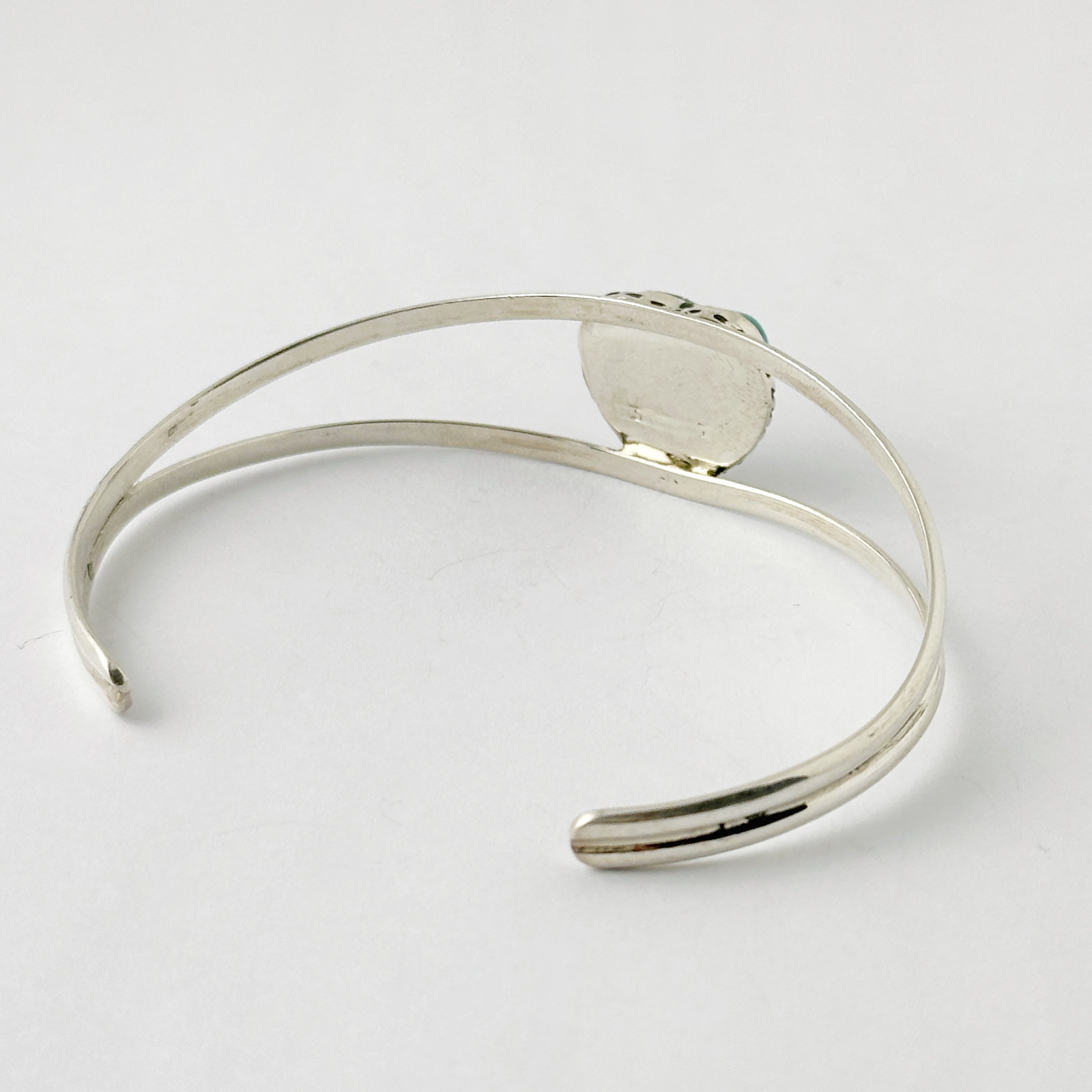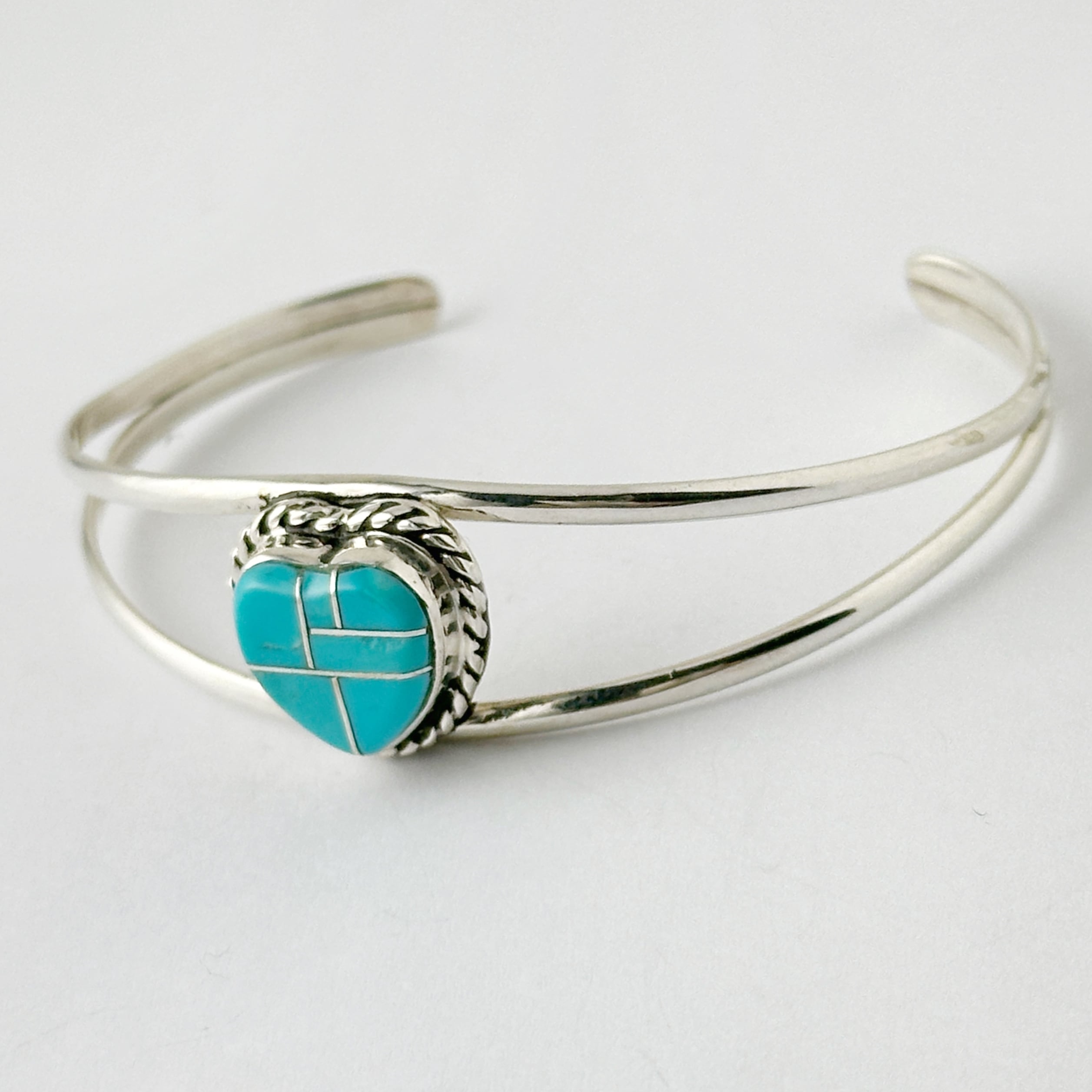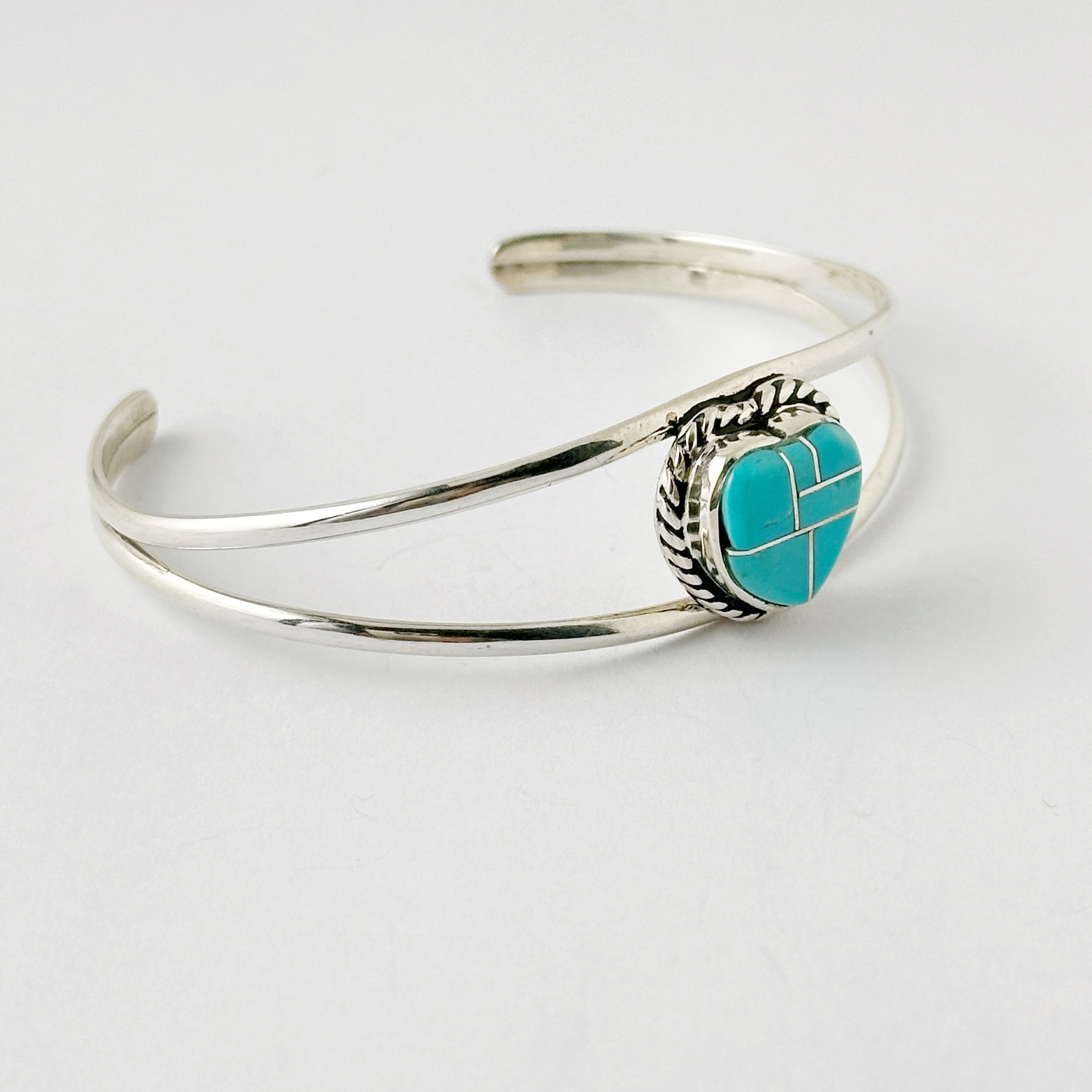 ハートの形にシェイプされた、ターコイズが、2本のアームのセンターにセットされたバングルです。