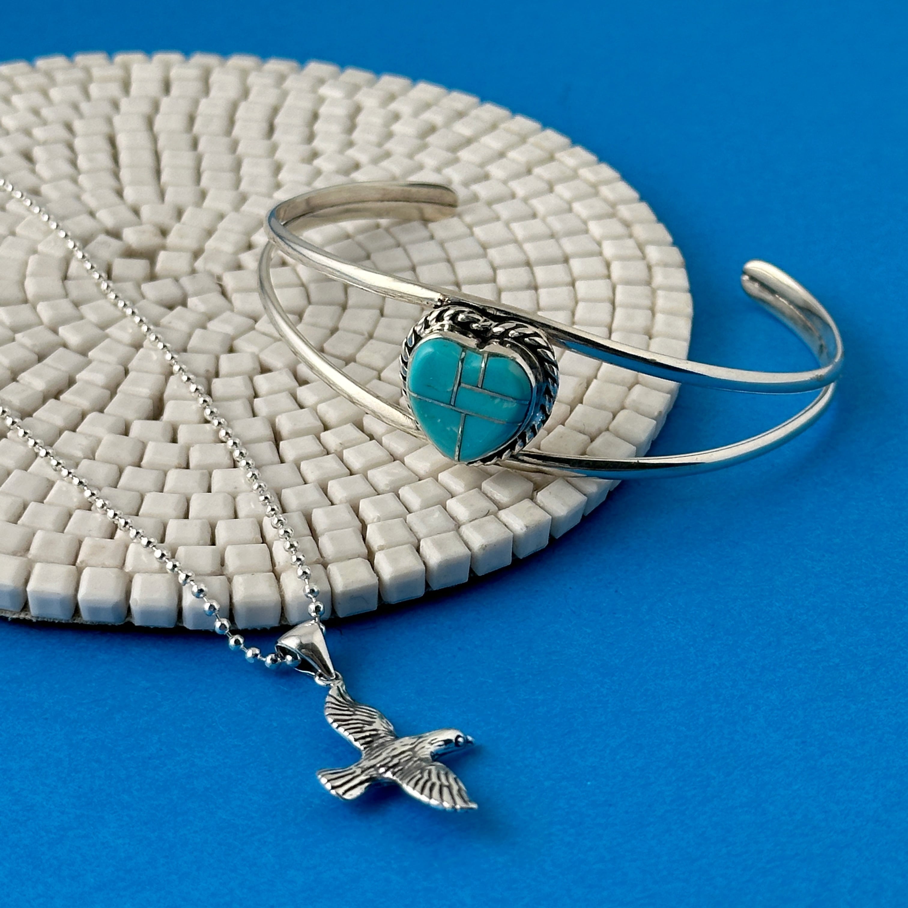シルバーインレイが施されたターコイズをハート型にシェイプし、その周りにロープワークが施してあります。