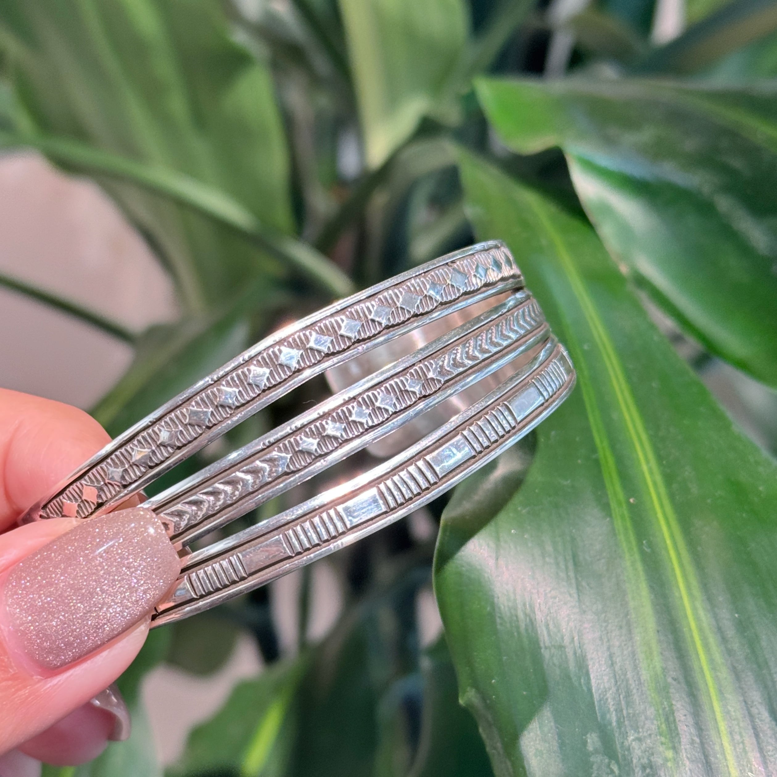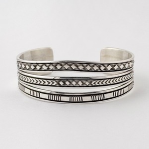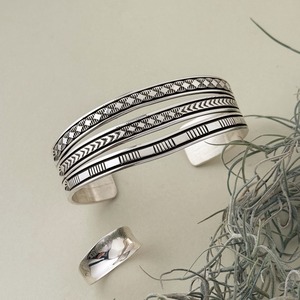 スタンプワークがそれぞれちがうデザインで飽きのこないバングルです。