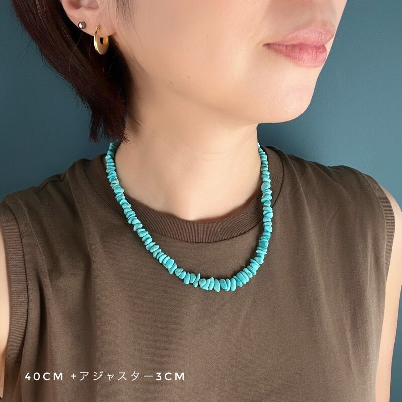 グラデーションとは首元のパーツ部分からネックレス中央に向けてターコイズの粒が大きくなっていくことをそう呼んでいます。