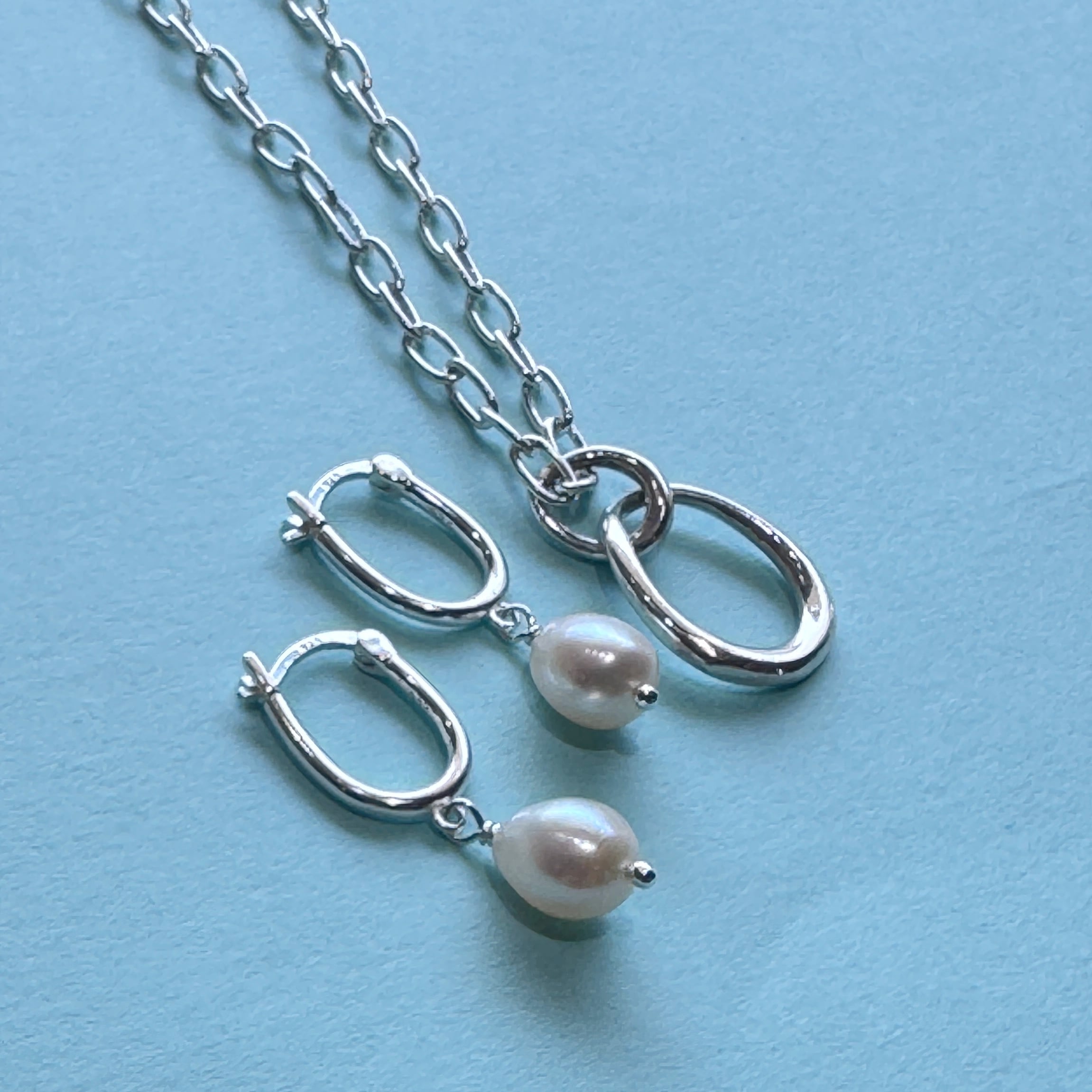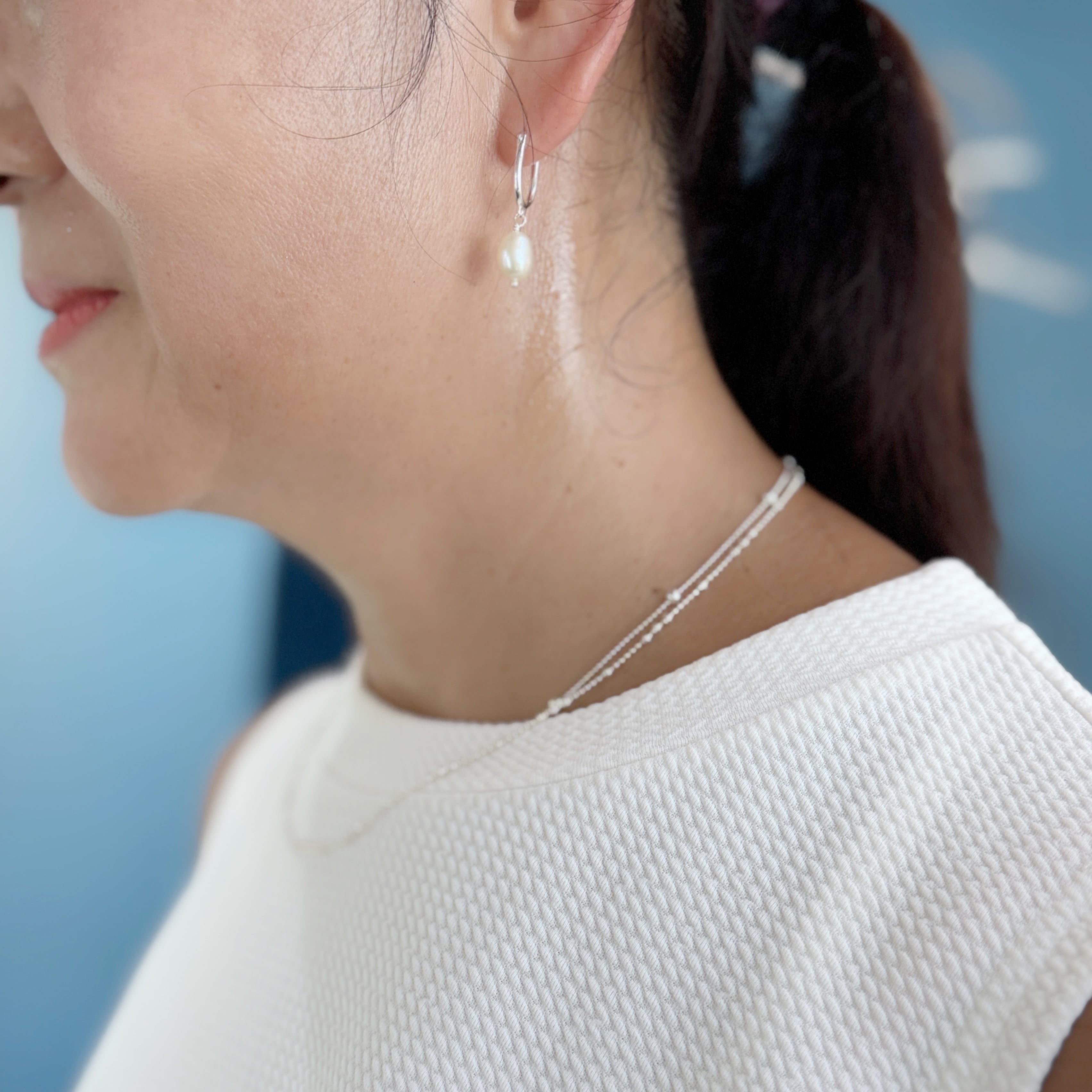 小さめのオーバルフープの下部に揺れるパールが一粒