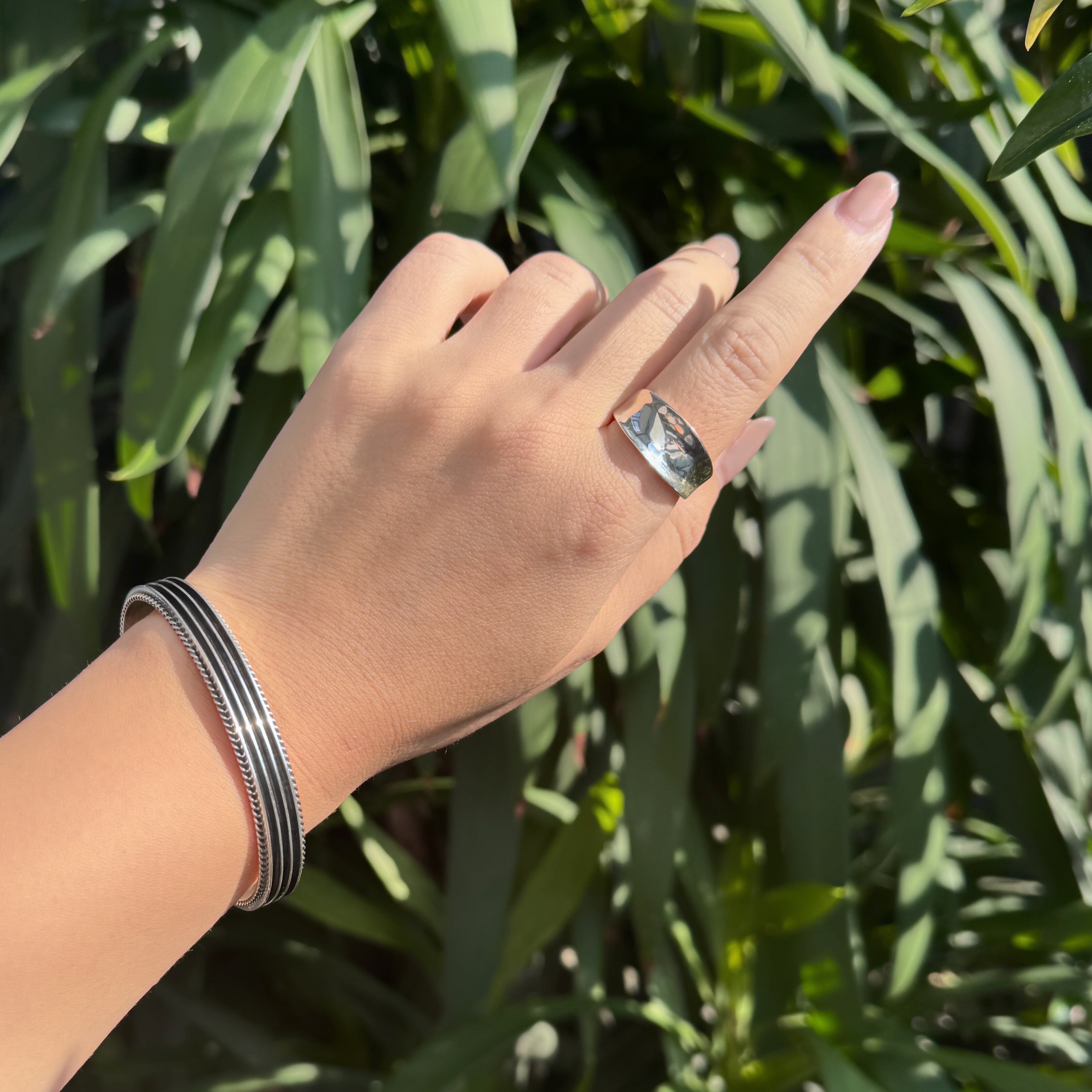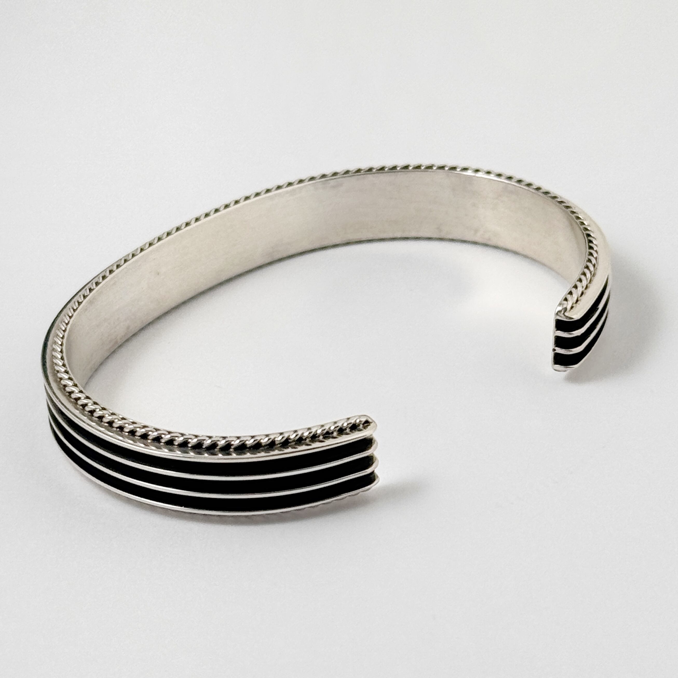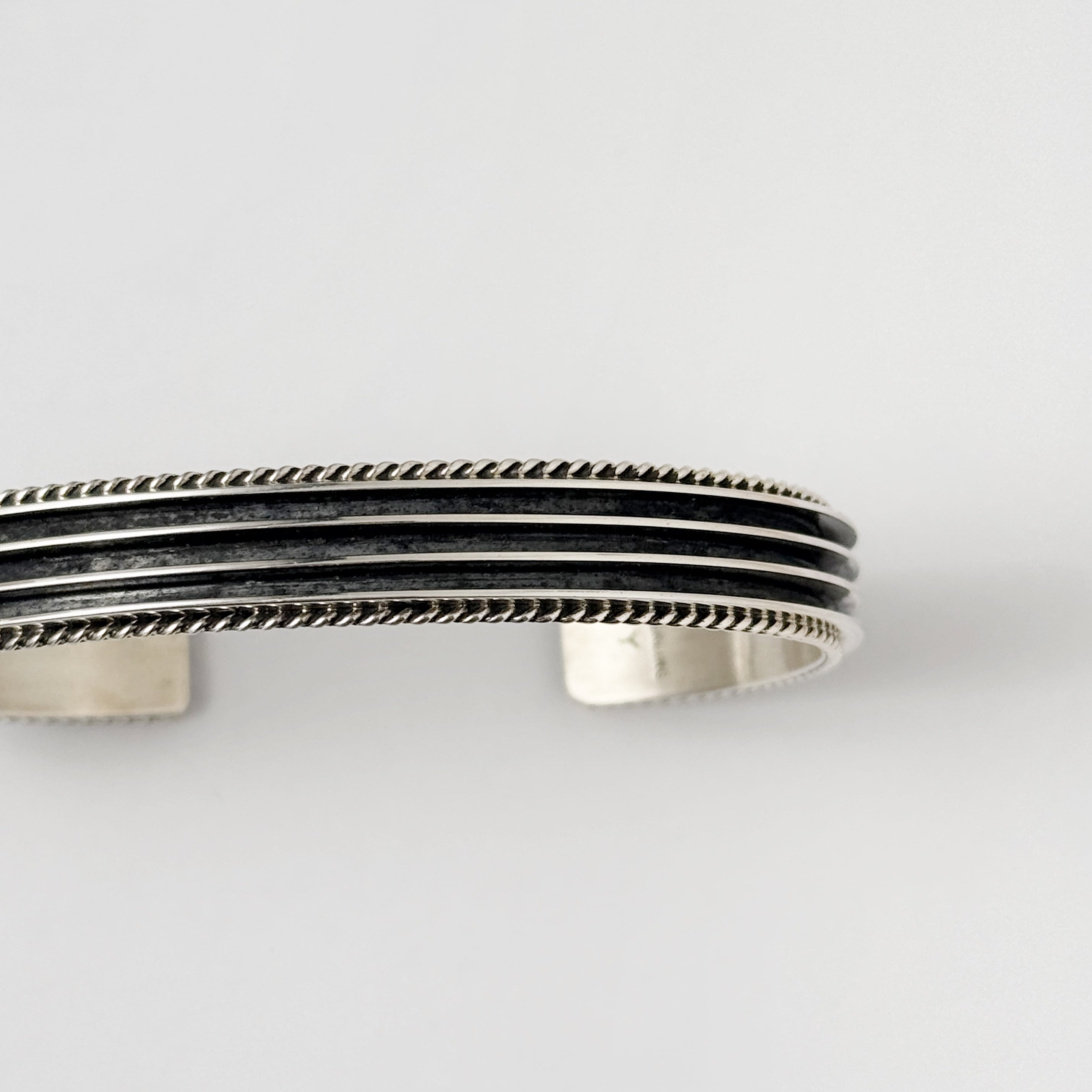 3つの溝と縁がロープワークされたデザインのかっこいいバングルです。