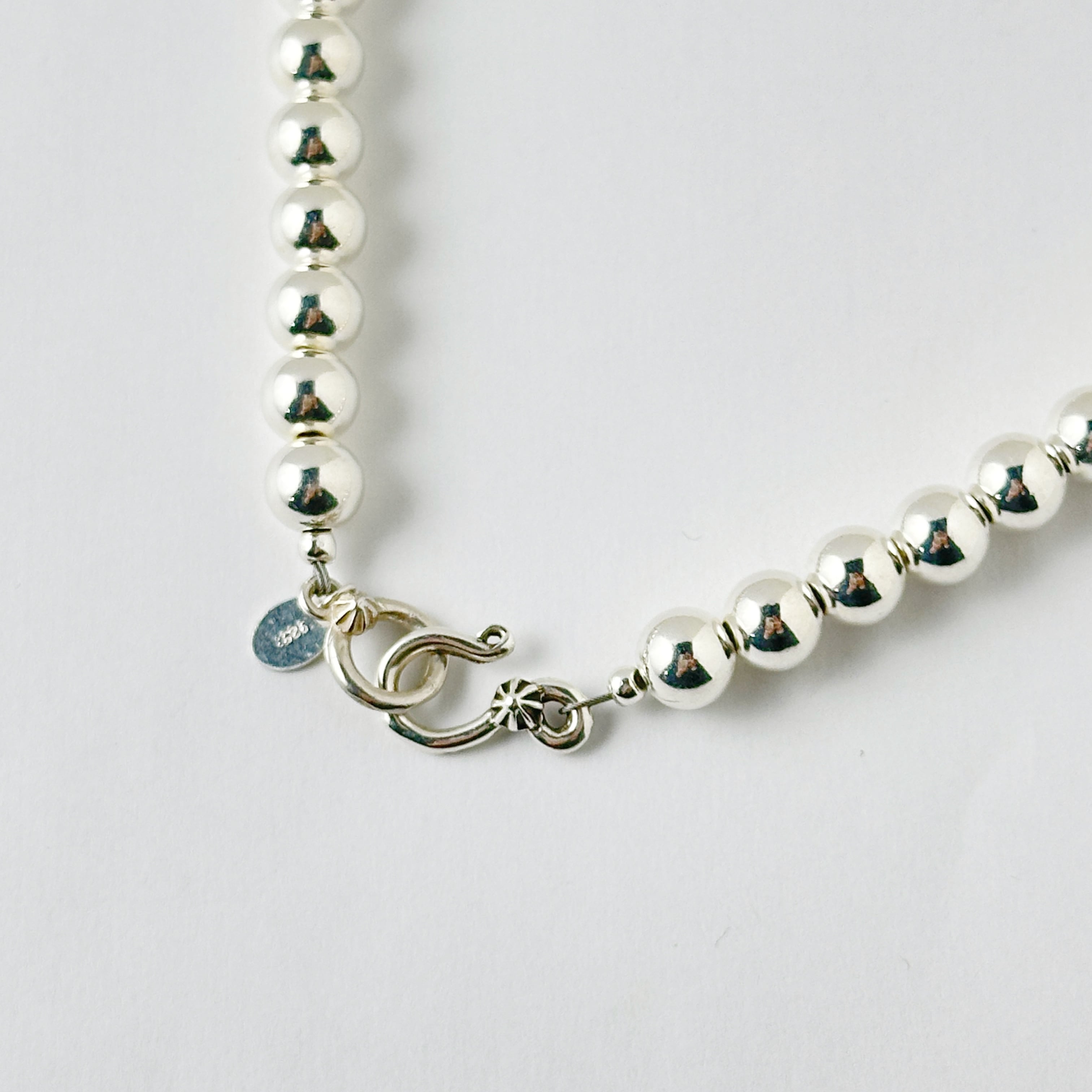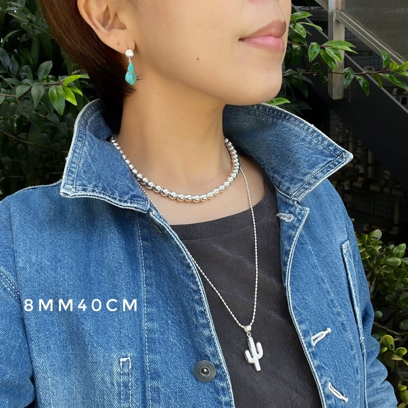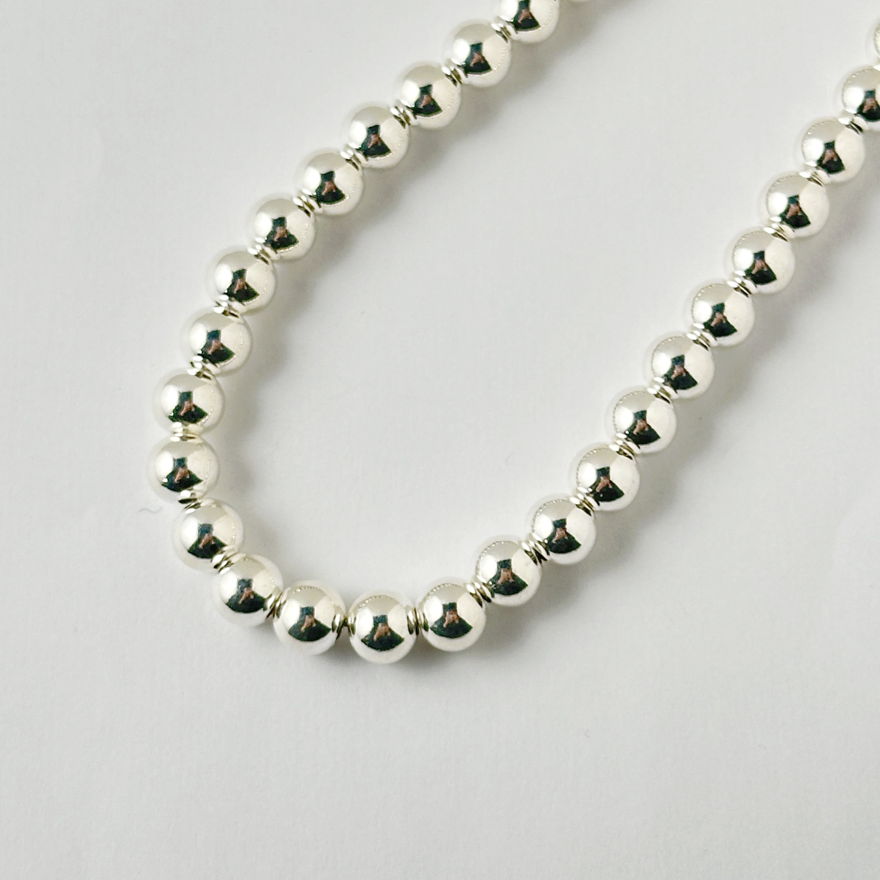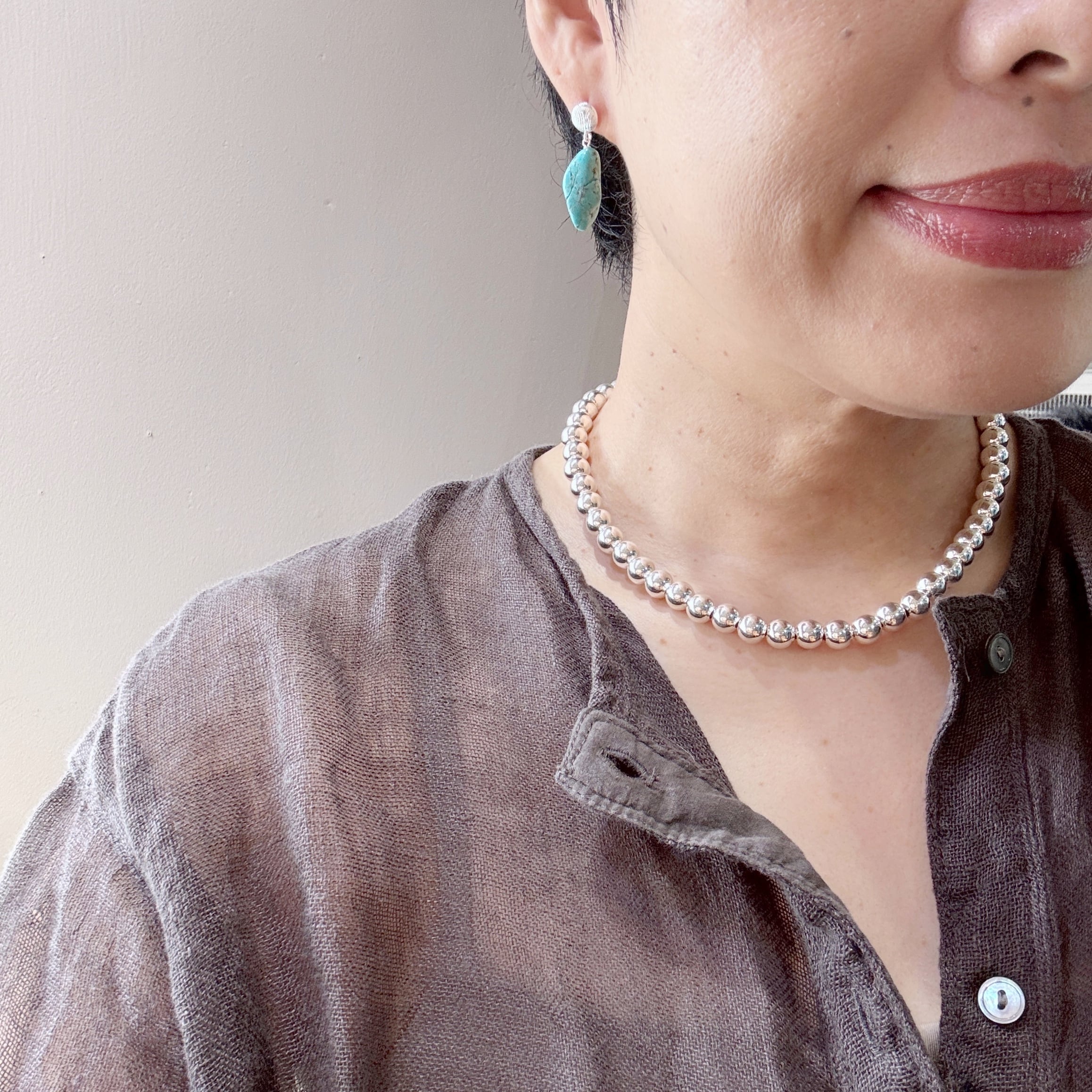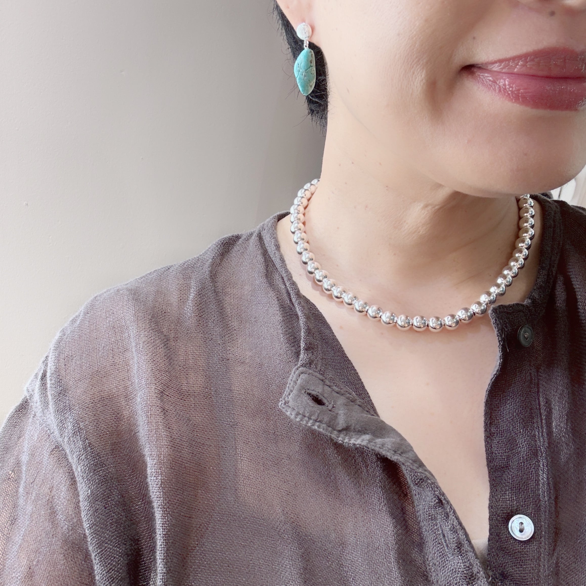 (真珠ではなく、とっても綺麗に輝くハンドメイドのシルバーボールを連ねたネックレスです。)