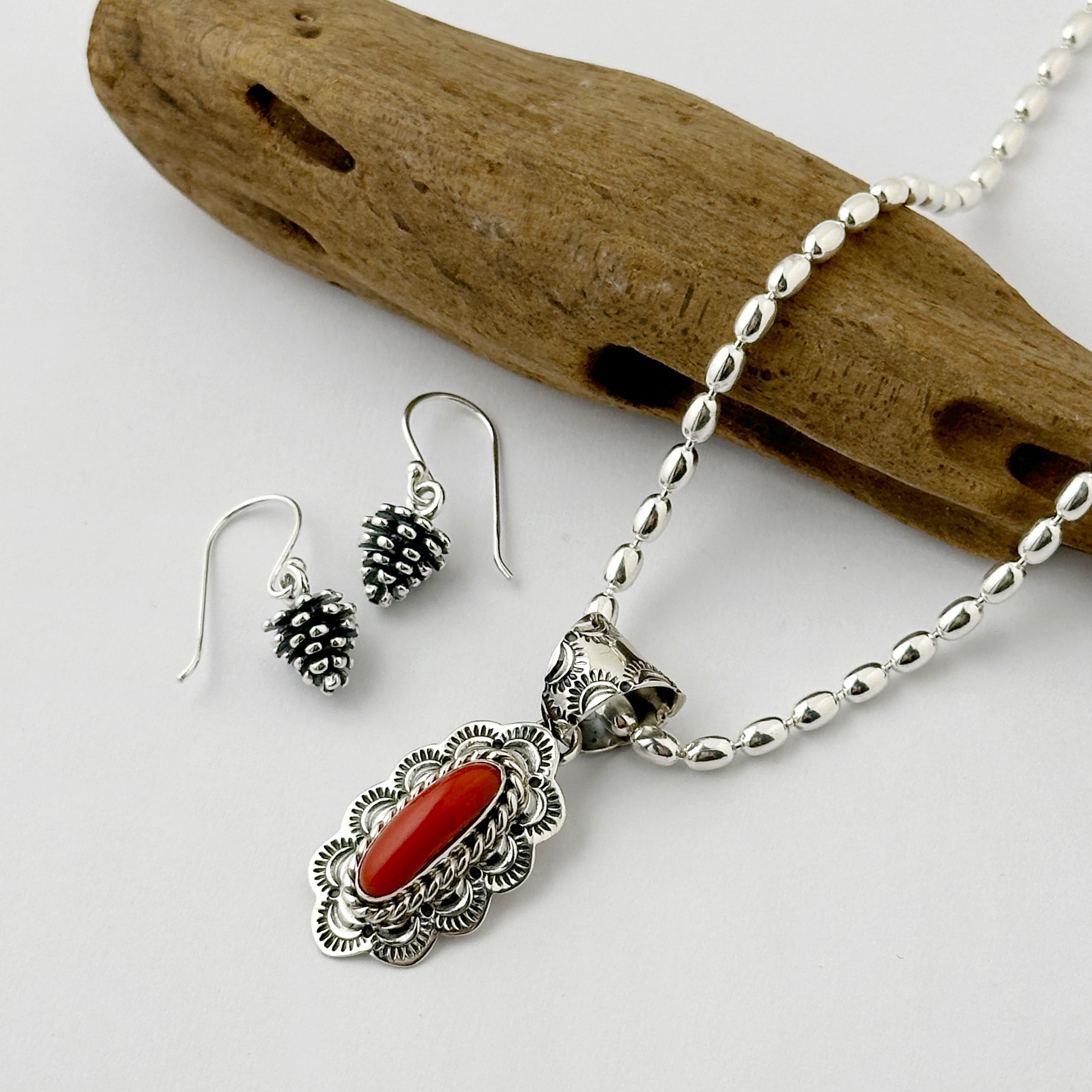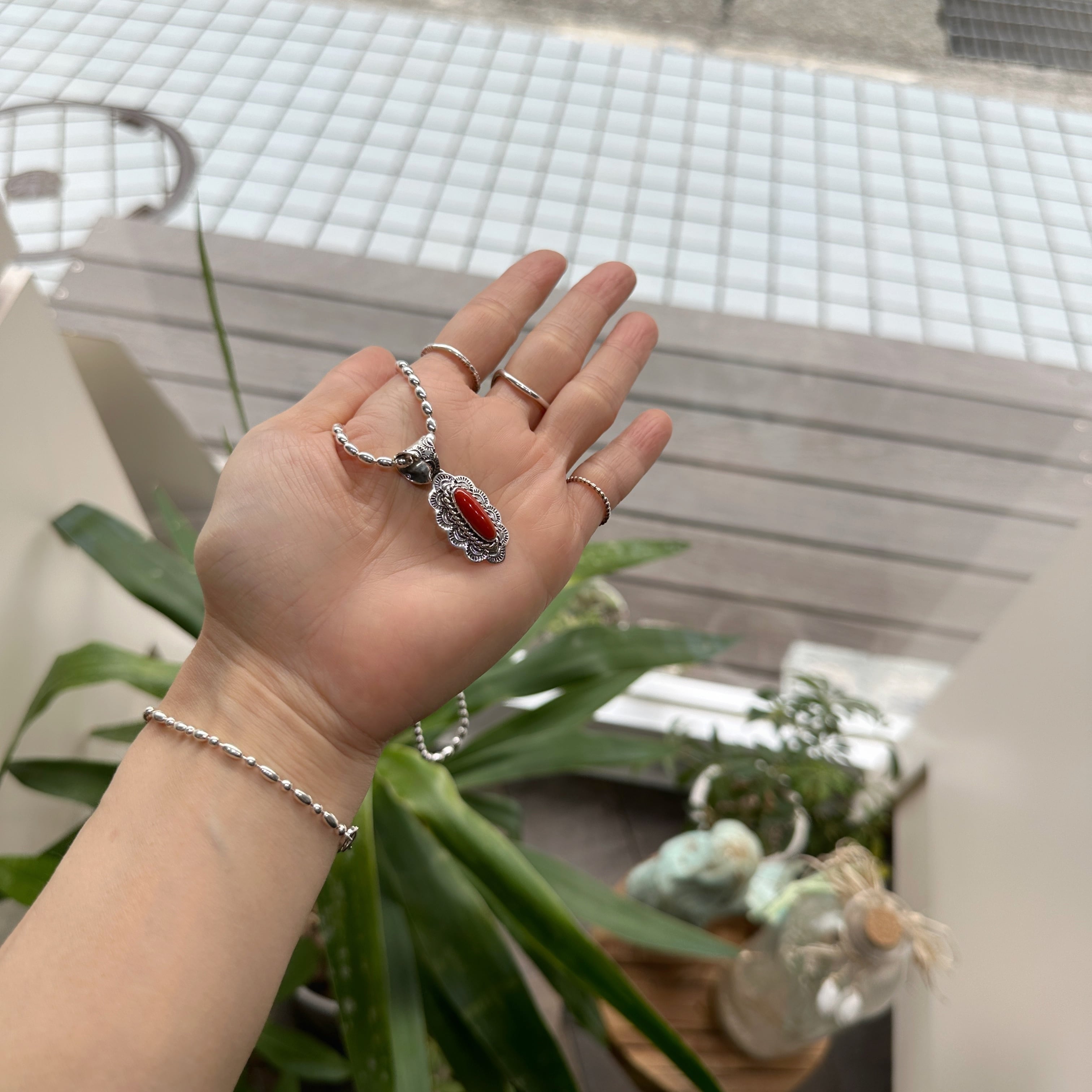 【Indian Jewelry】レッド コーラル オーバル フラワー ペンダント ネックレス