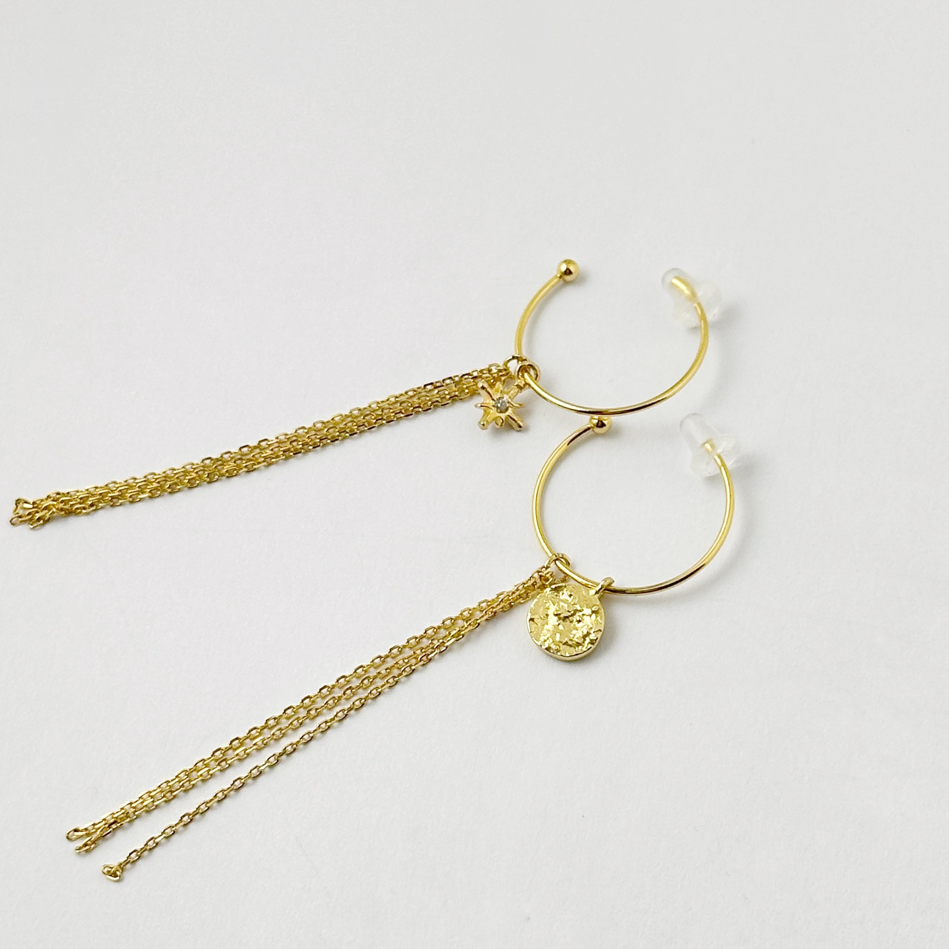 シンプルなフープに取り外し可能の満月と一番星、フリンジが付いたフープピアスです。