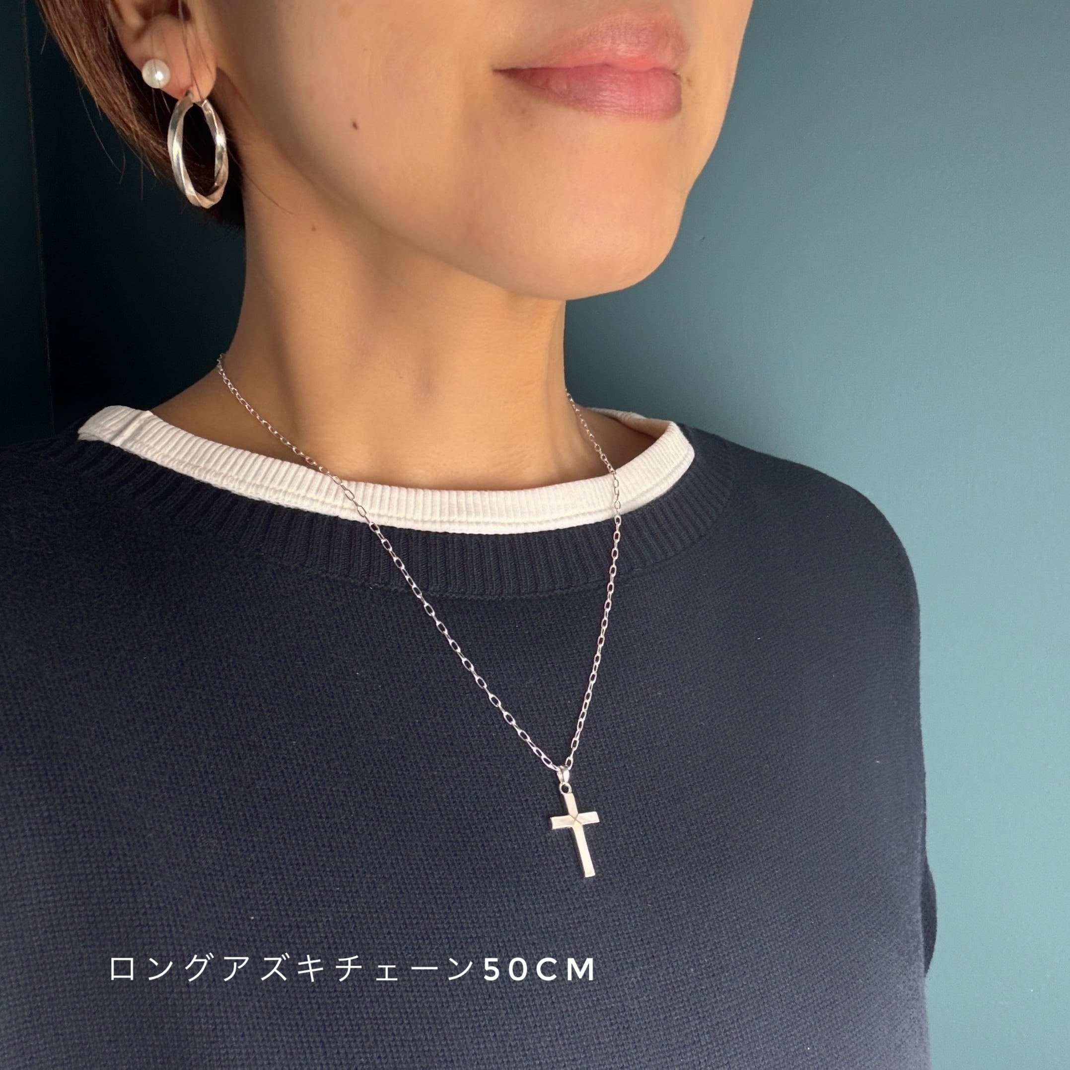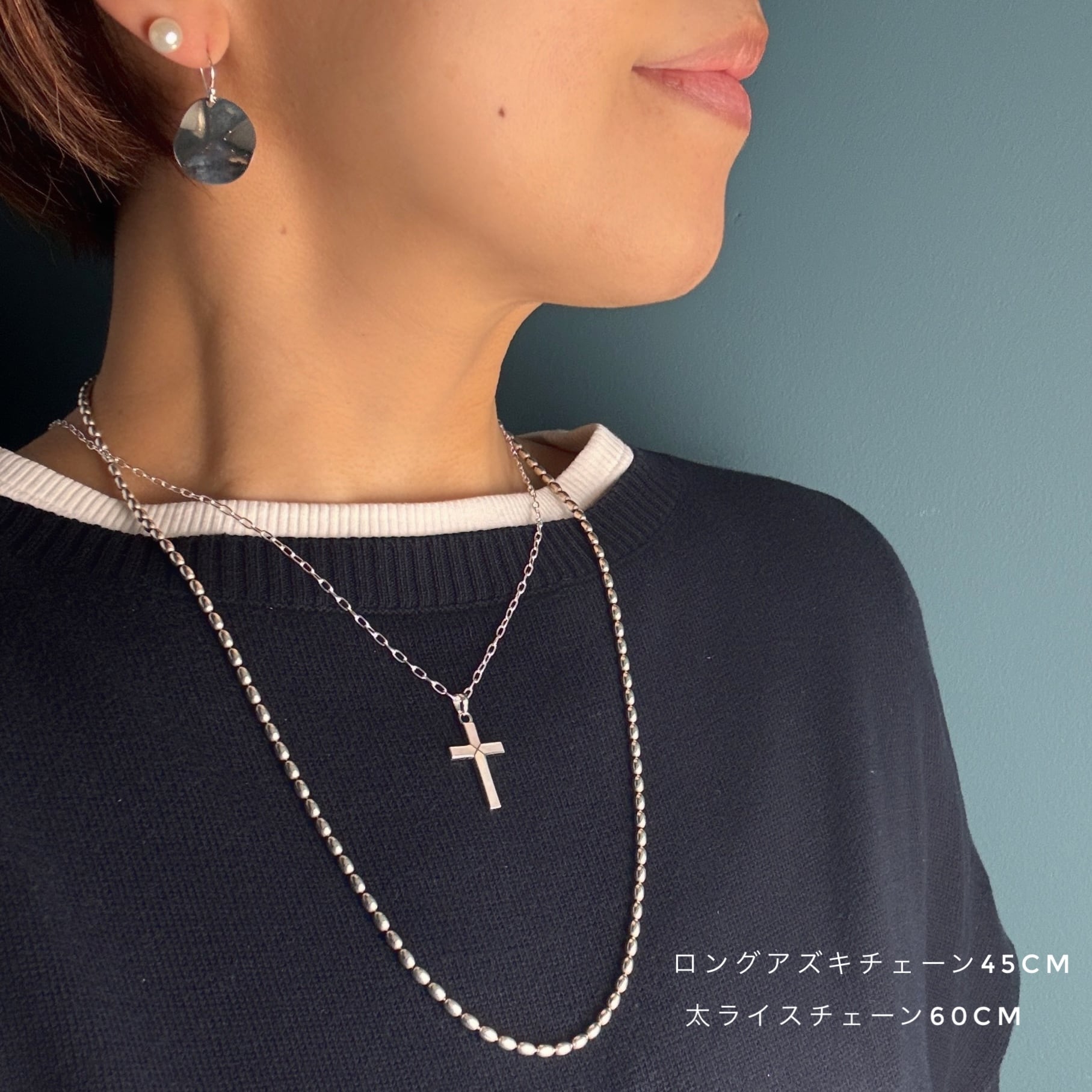 ユニセックスで楽しめるようにロングアズキチェーンで組み合わせました。
