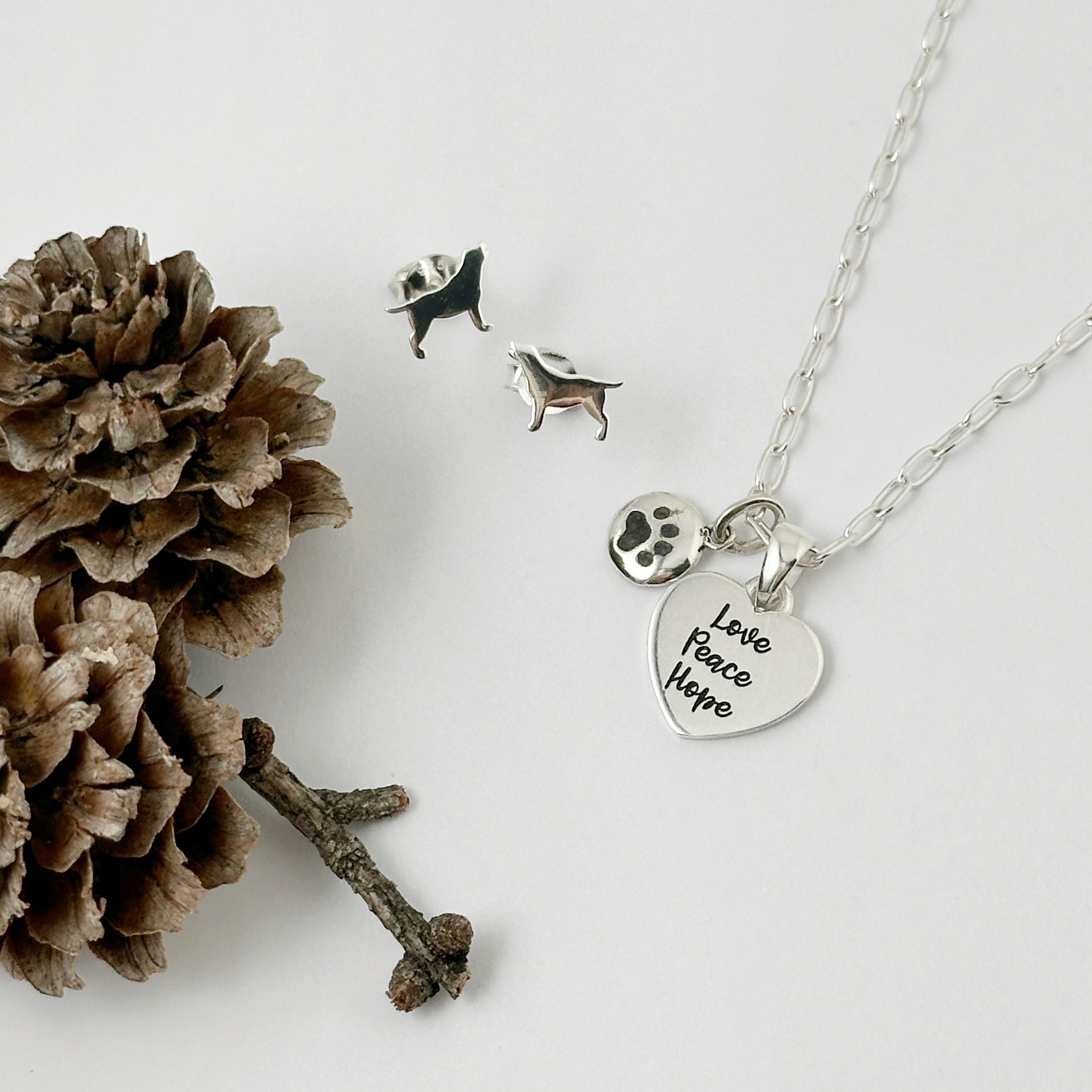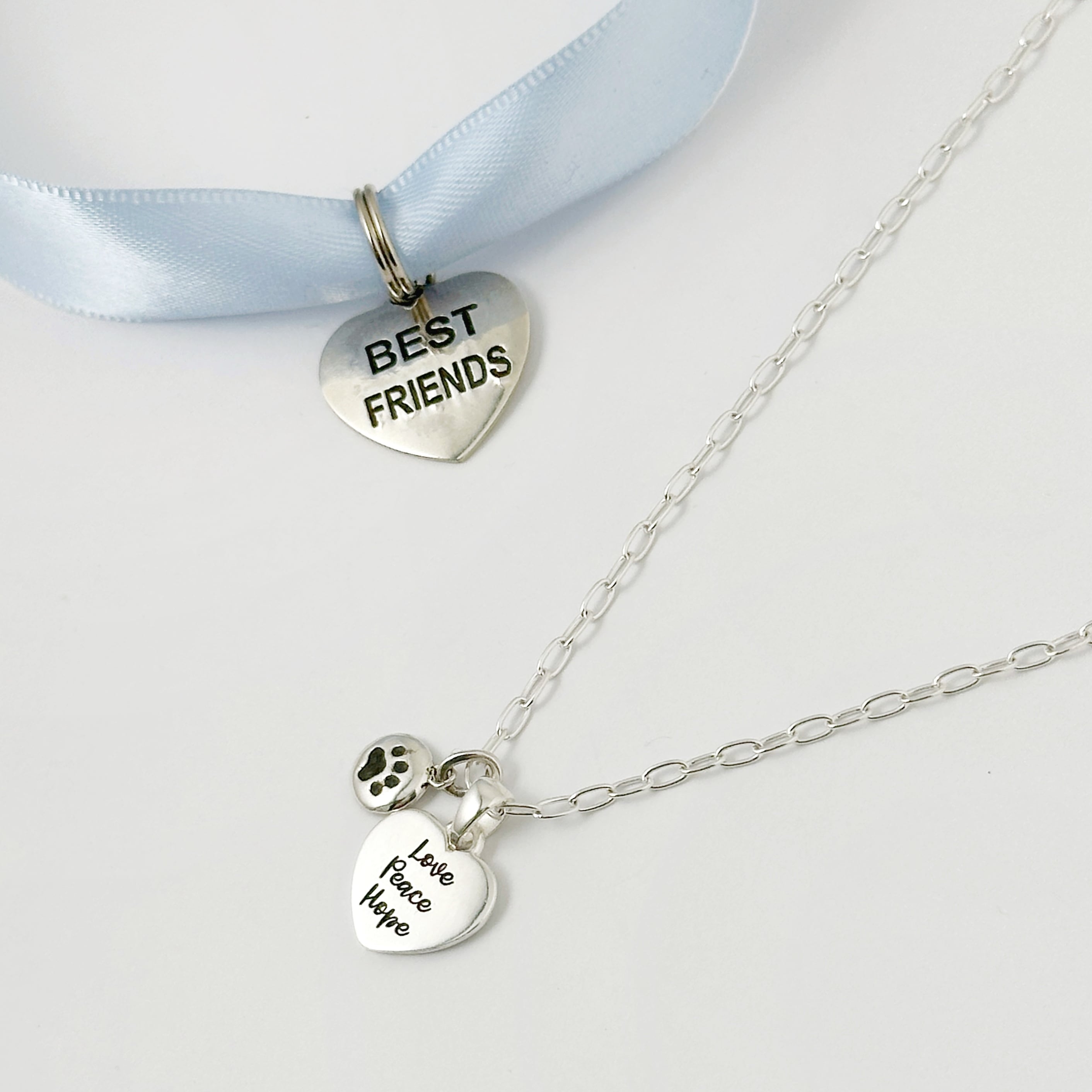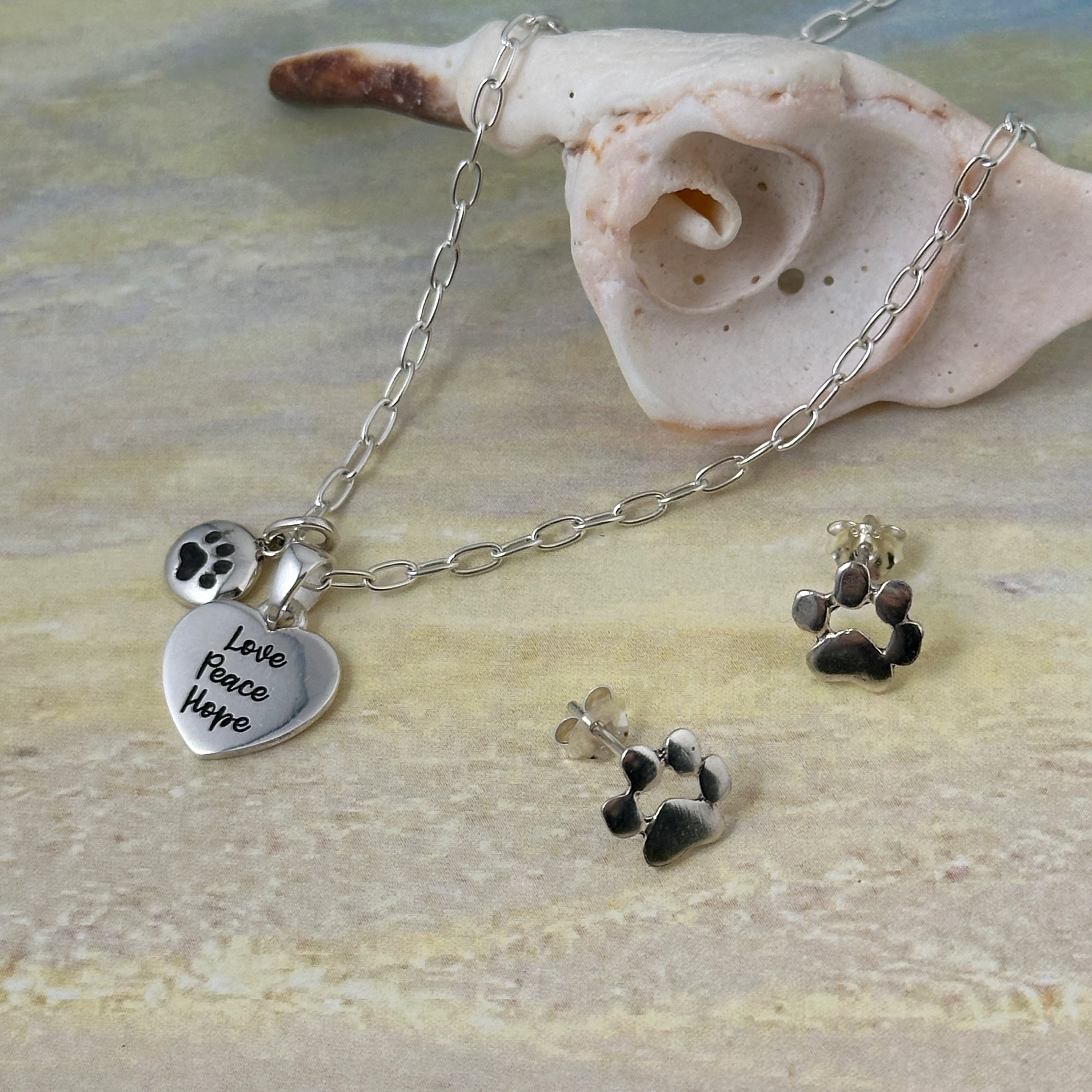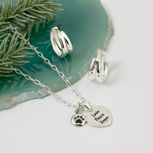 【Love Peace Hope】のメッセージが入ったハートTOPと小さな肉球のコインTOPをセットにしたネックレスになります。