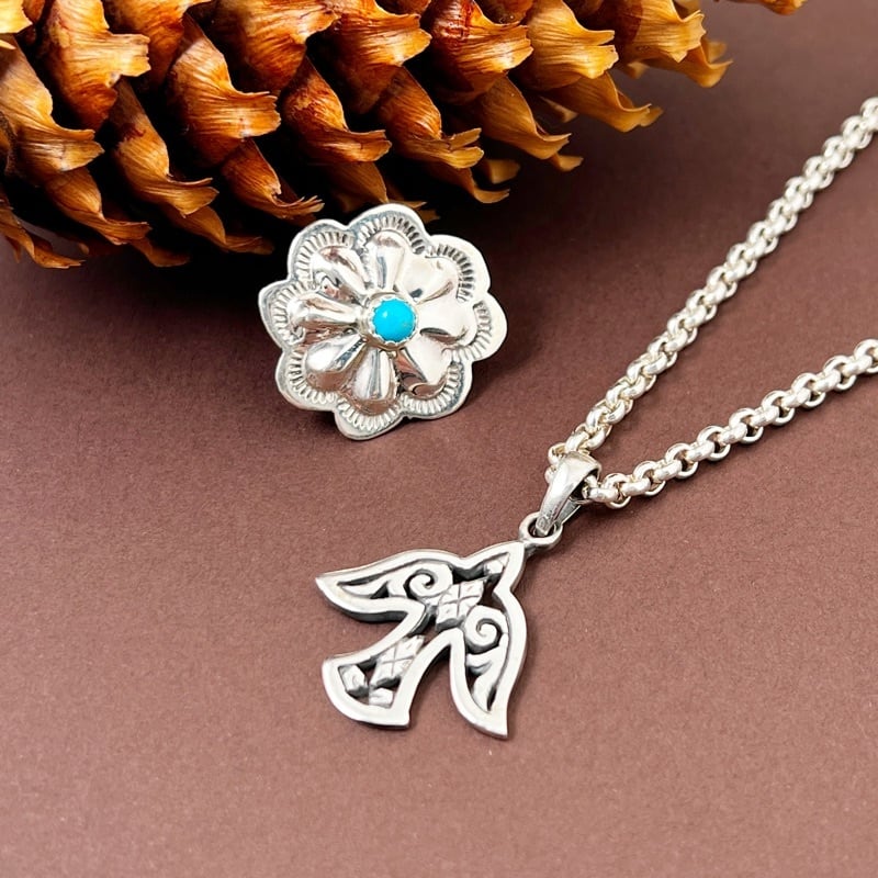 インディアンジュエリーからコンチョブローチの登場です!こちらはラウンドタイプのデザインです。
