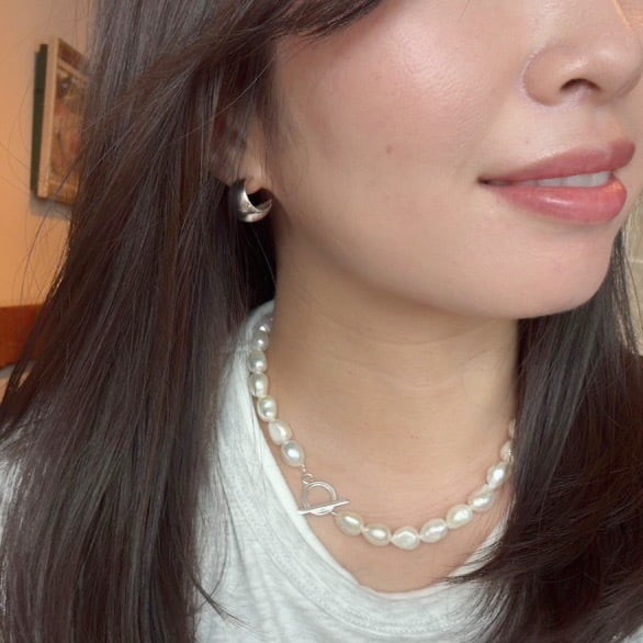 カジュアルにニットやTシャツに合わせても。お客様の間ではスウェットに合わせるのがオススメとお声をいただくバロックパールです。