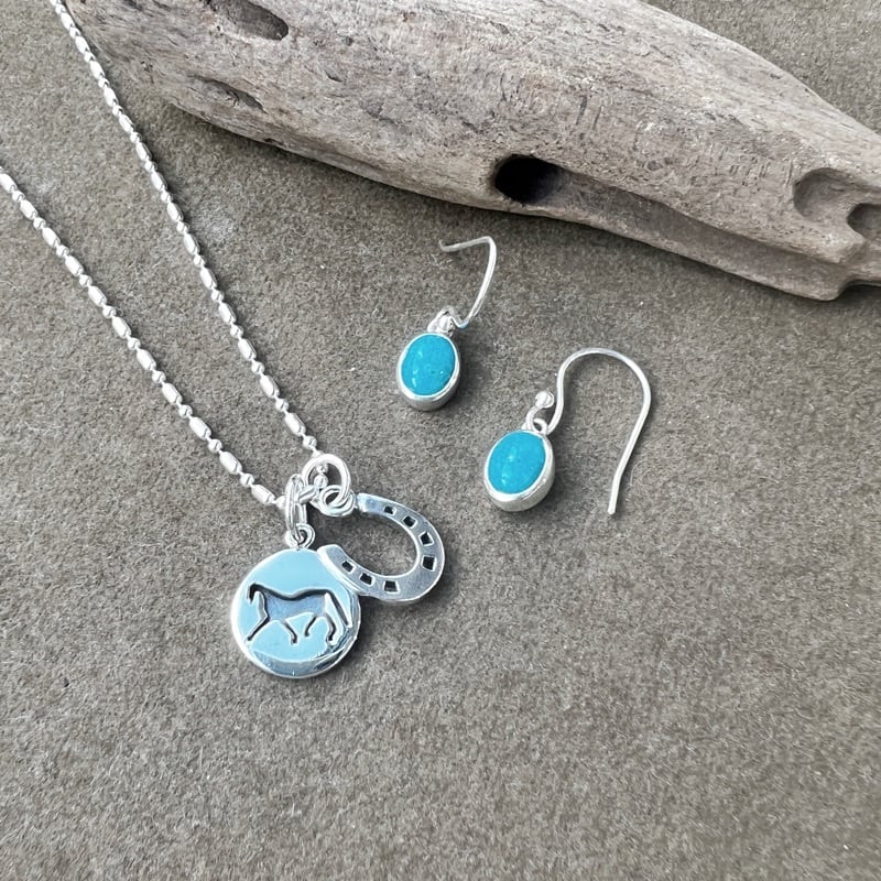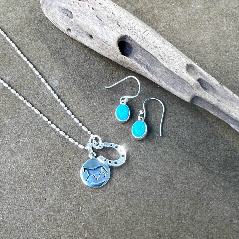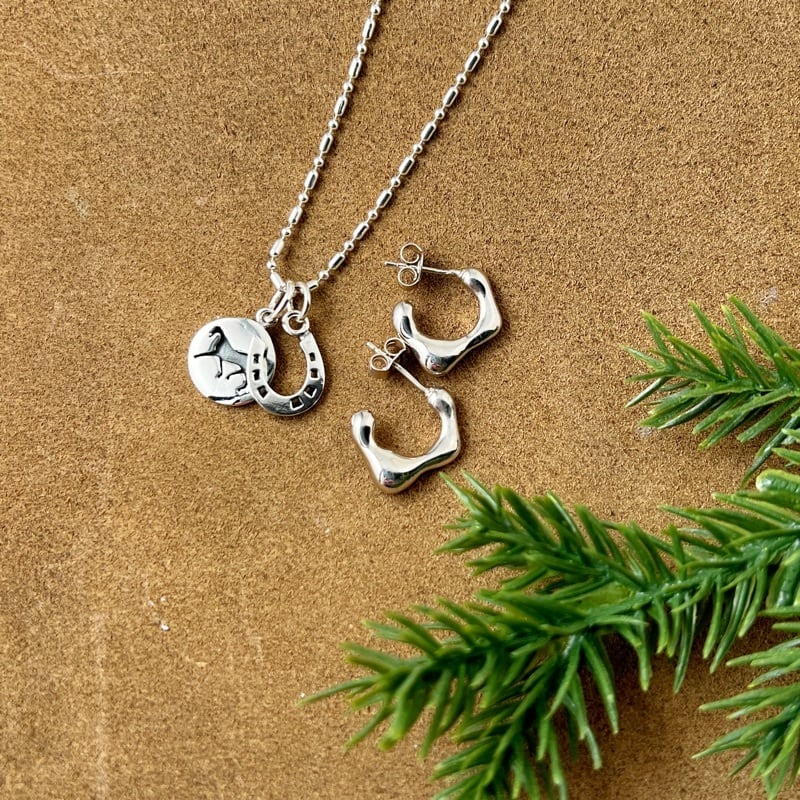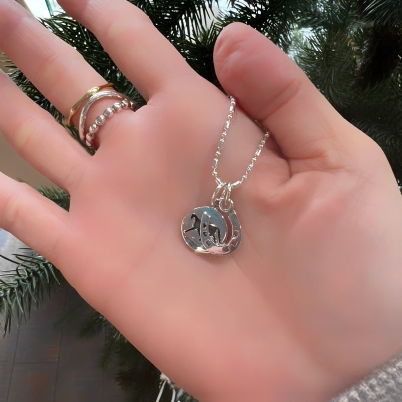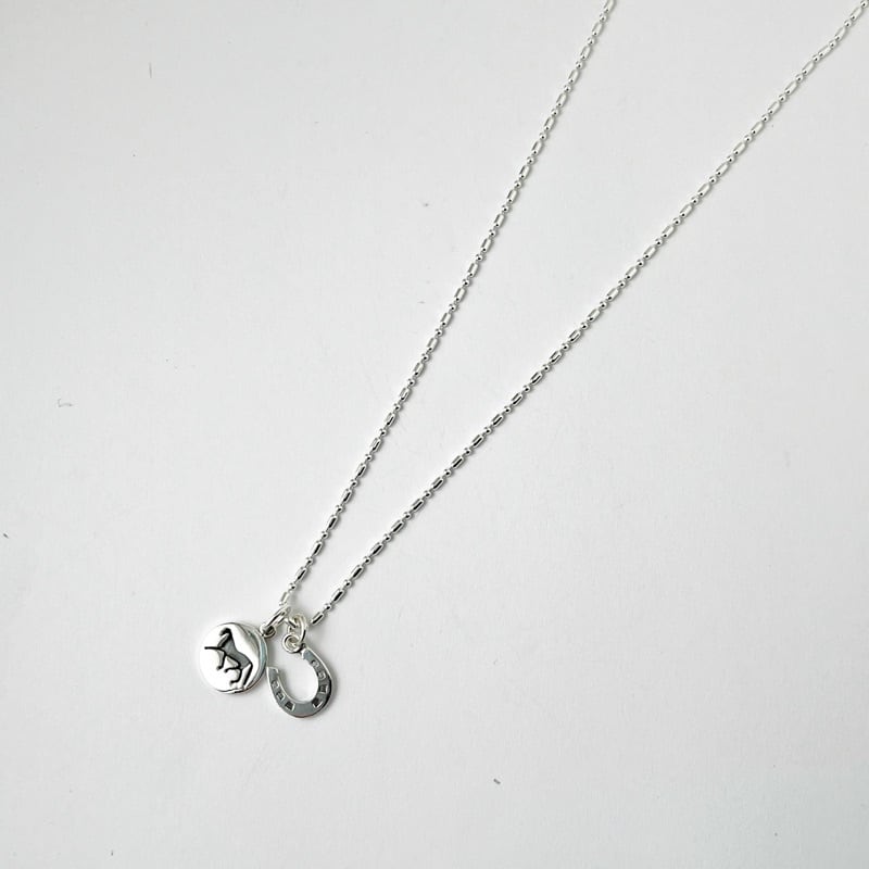 疾走する馬がデザインされたコインとホースシューがセットになったネックレスになります