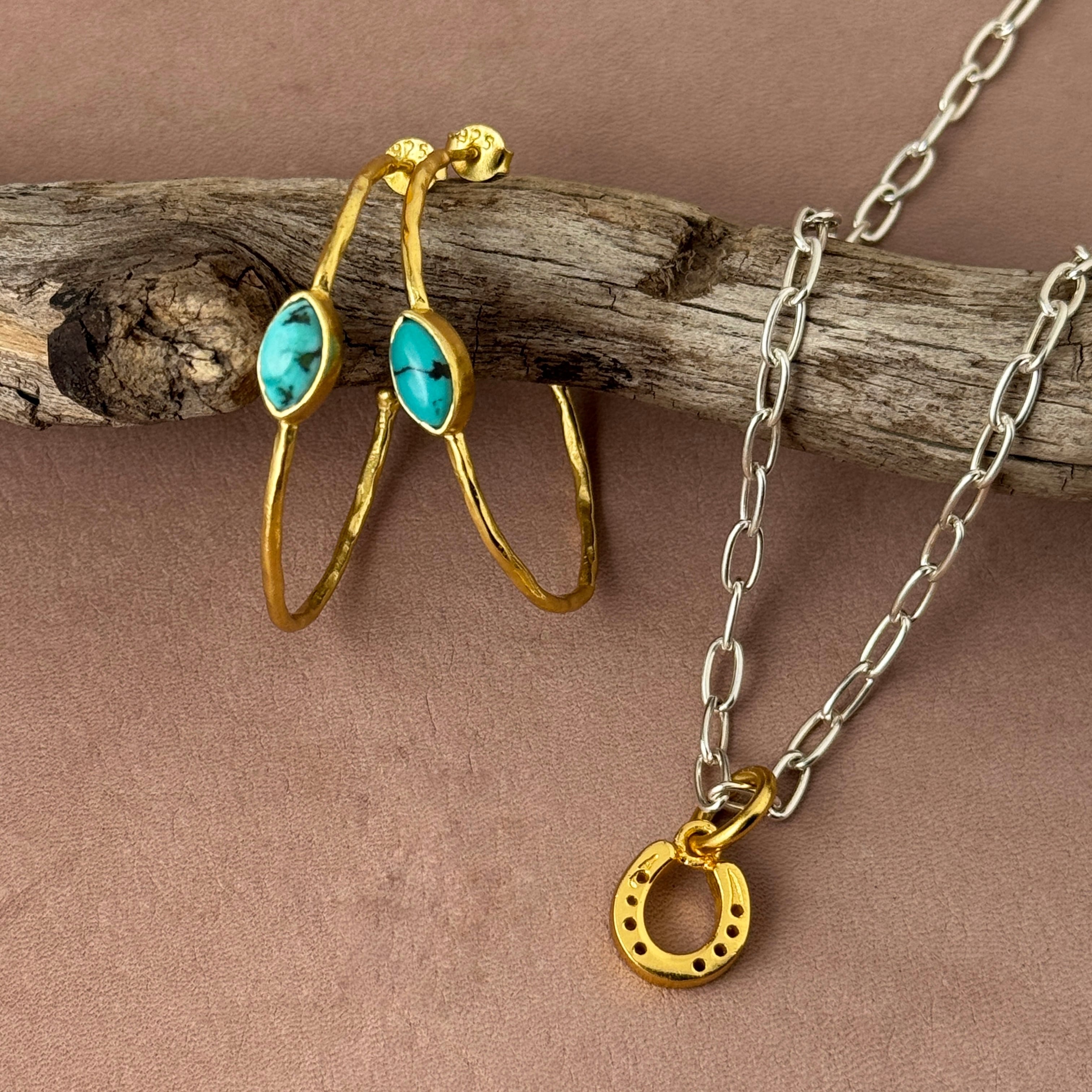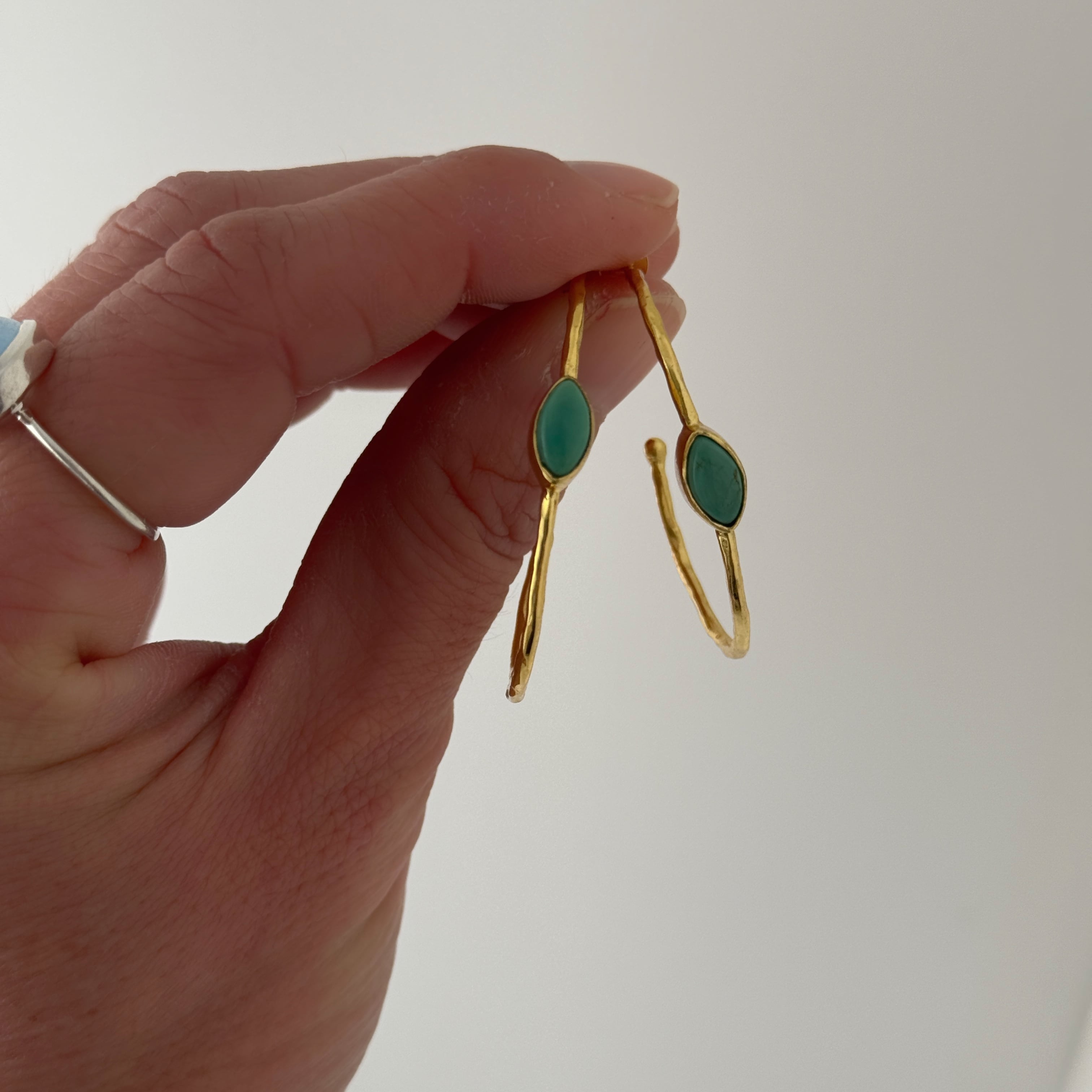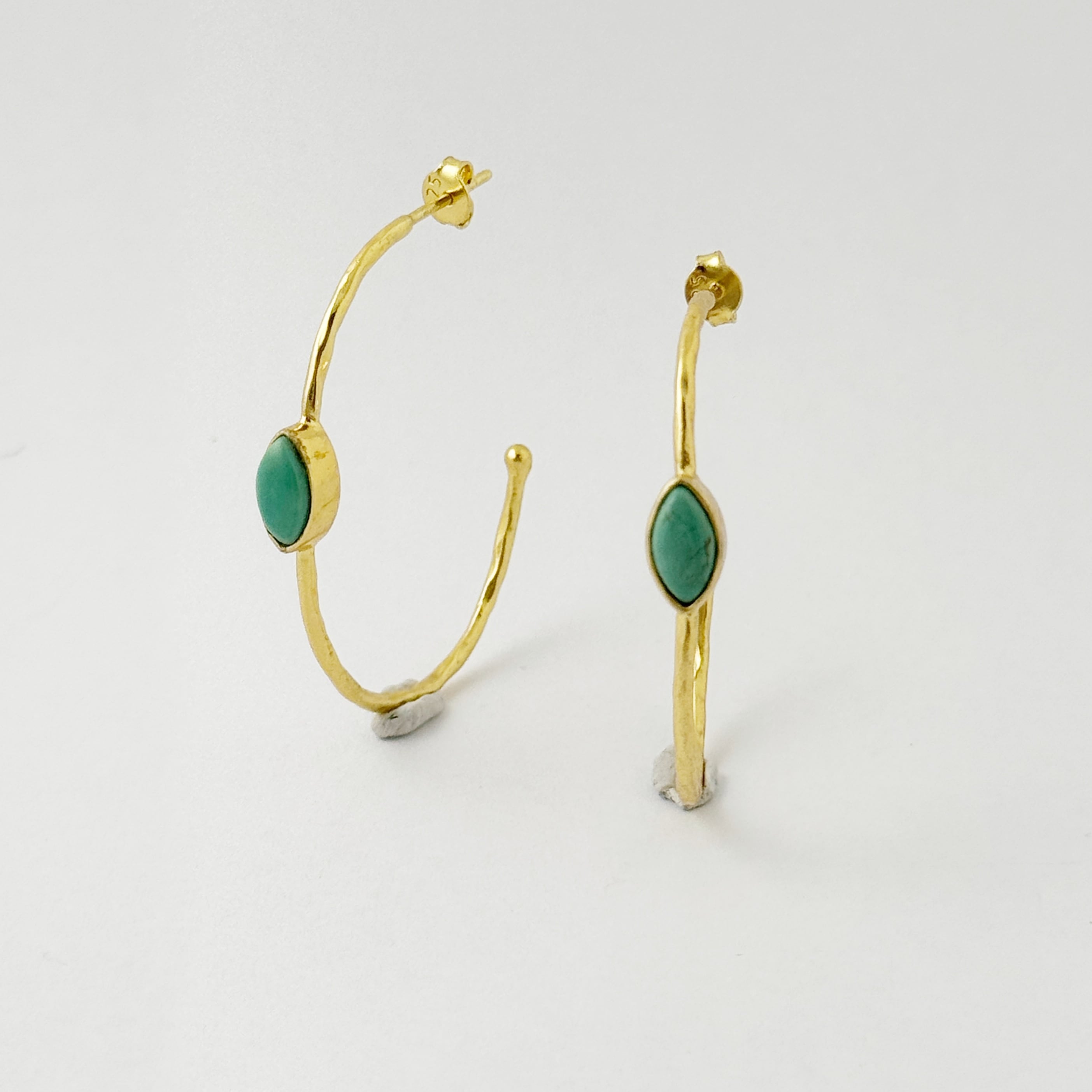 他のフープピアスと異なるのは、センターにセットされたカボションカットのターコイズ。