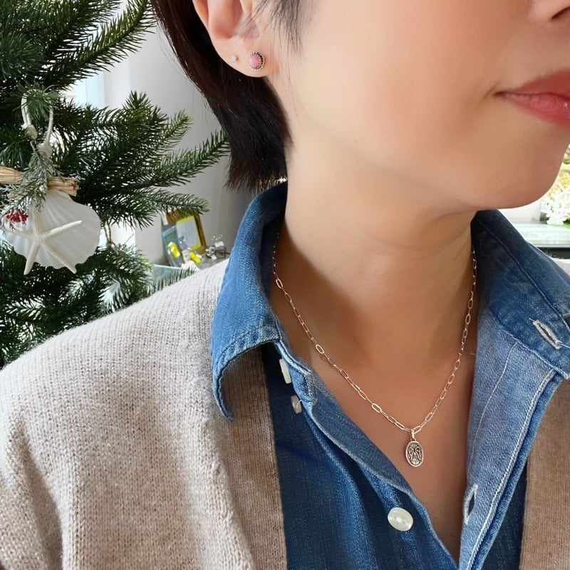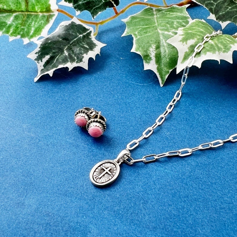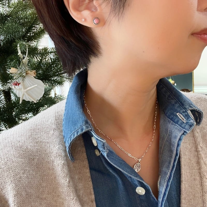 石自体は直径0.6cmほどの大きさですが、ぐるっと一周、オキシダイズシルバーのロープワークが施されています。その分存在感が出ます。