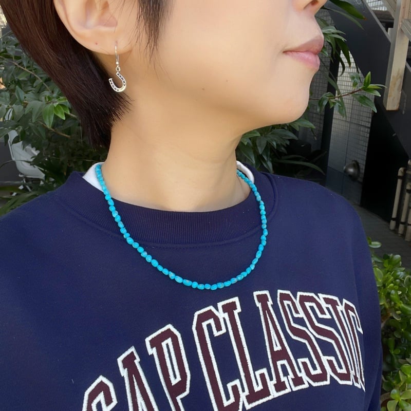 カジュアルな印象をそのままにターコイズネックレスと合わせるのもとってもオススメです。