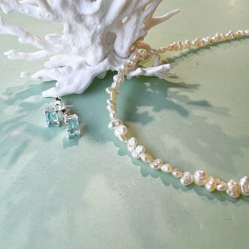 それぞれ、パールネックレスと一緒に着けると、オトナな雰囲気。お出かけコーデにも使えます。
