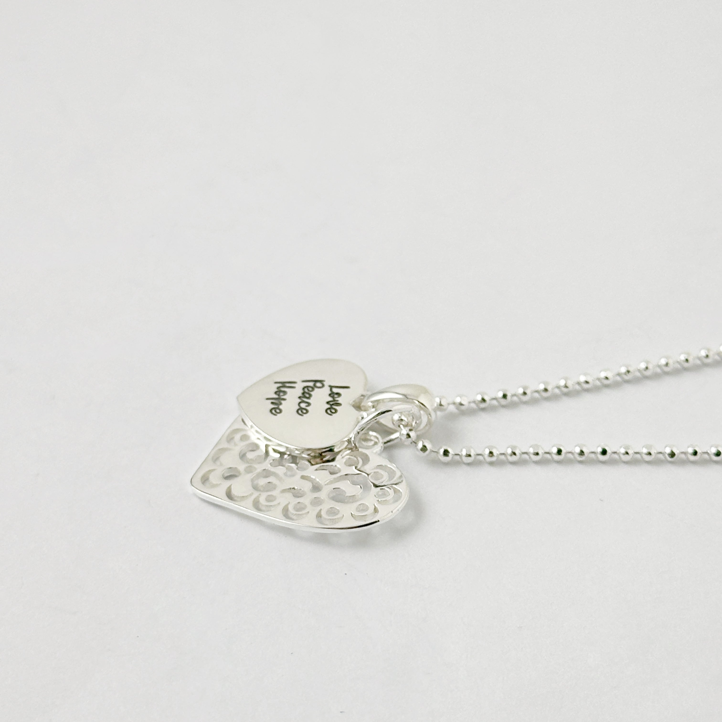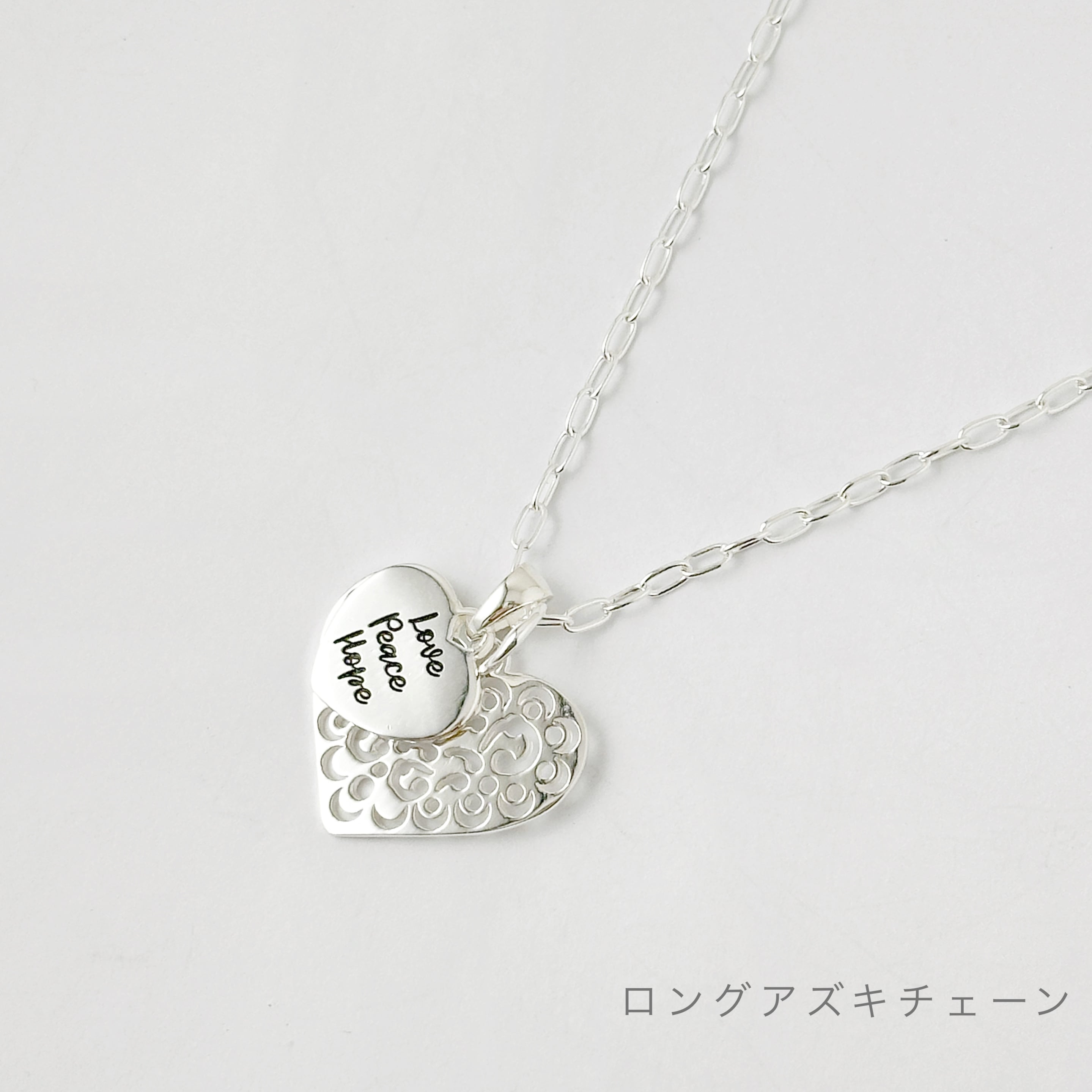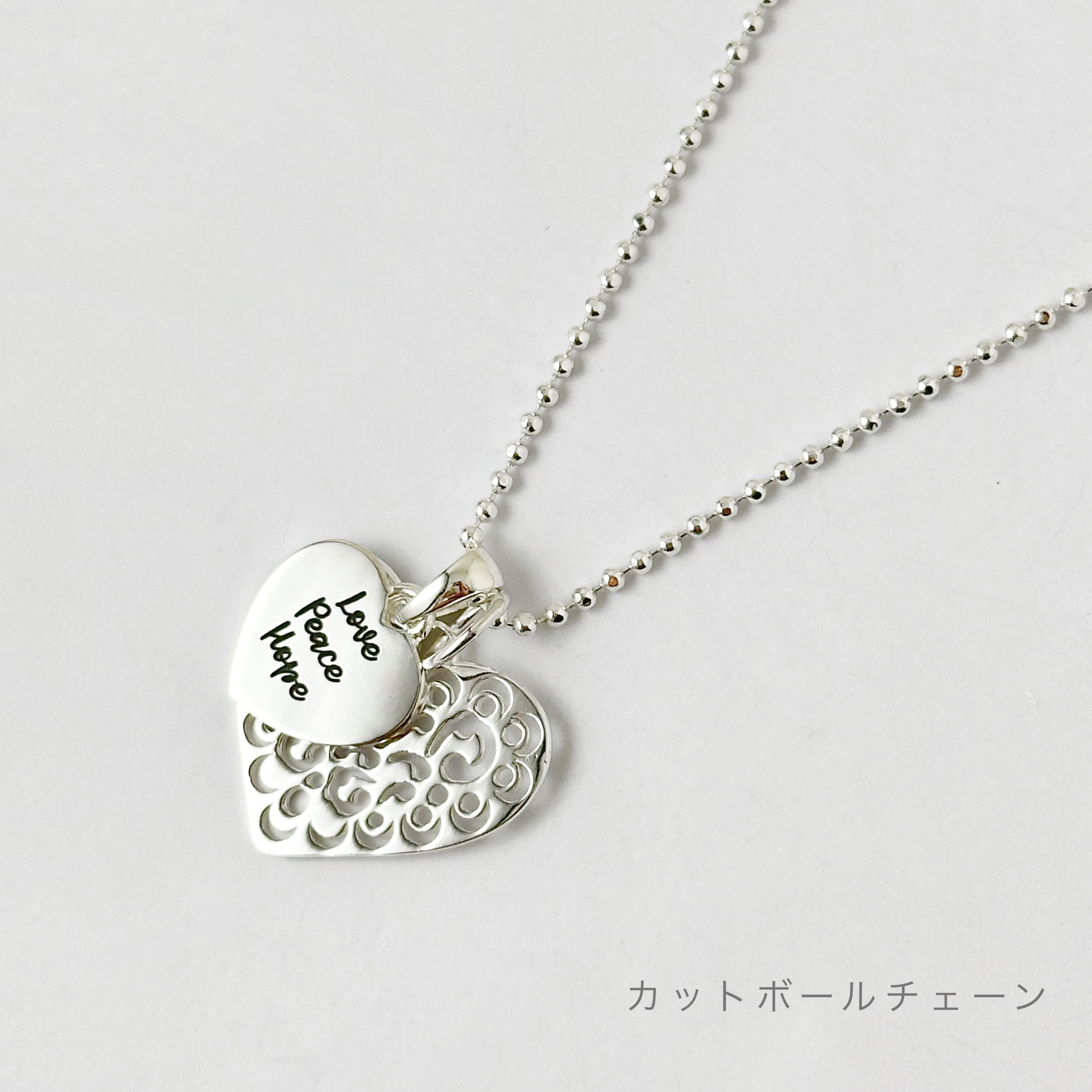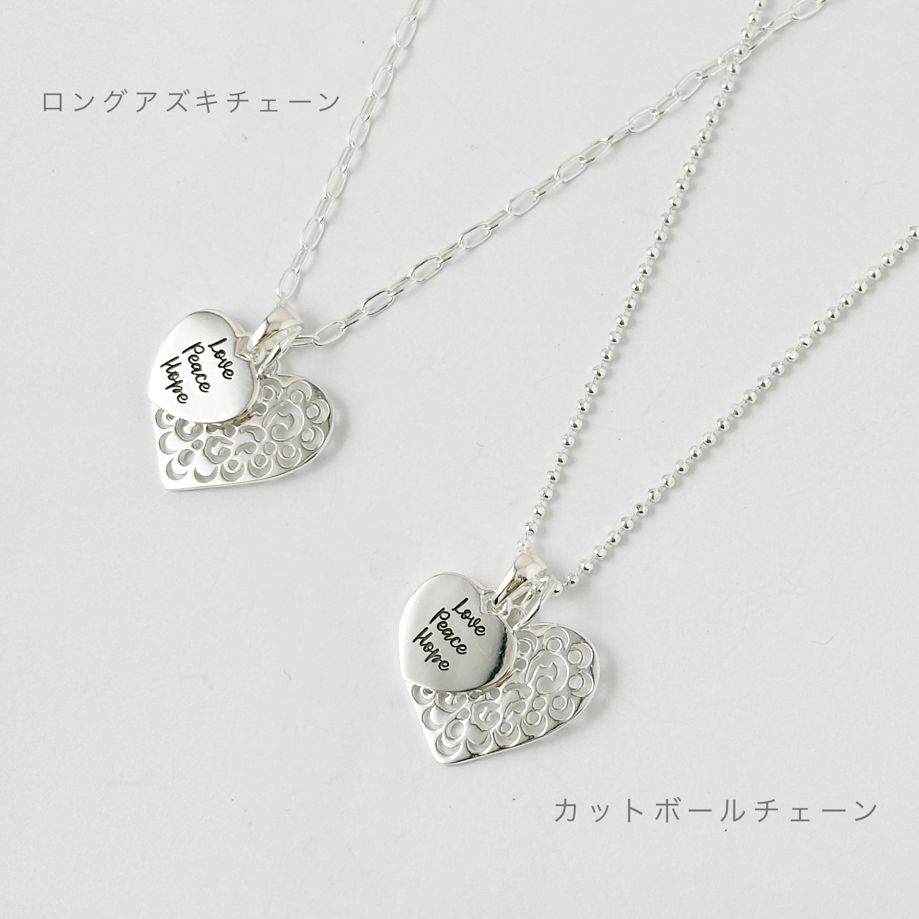 繊細なカットワークが施されたスカシのハートトップと【Love Peace Hope】のメッセージが入ったハートのトップをセットにしたネックレスになります。