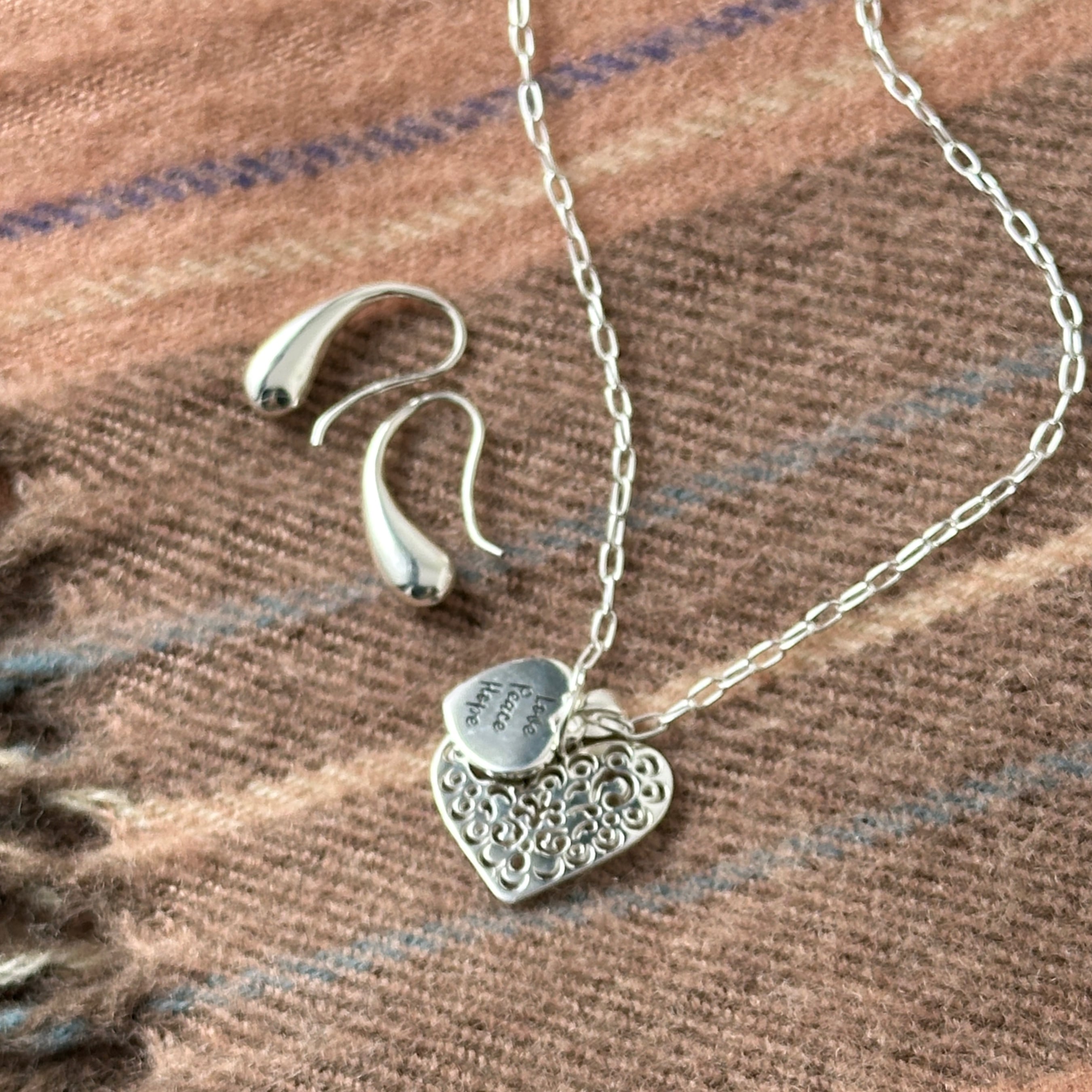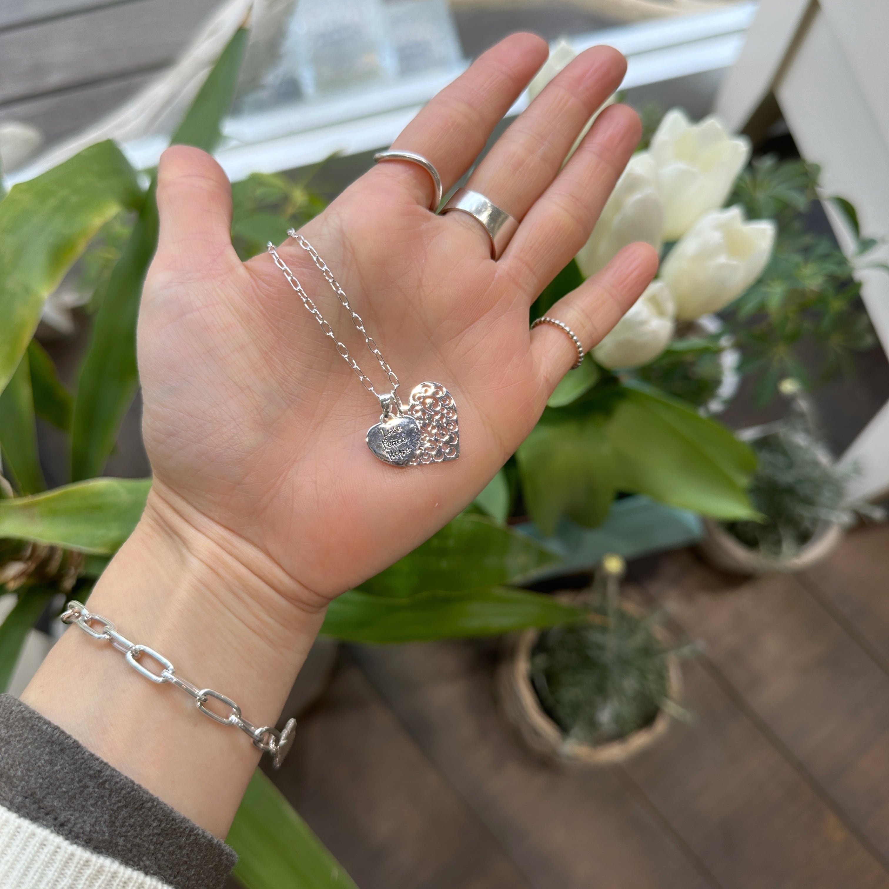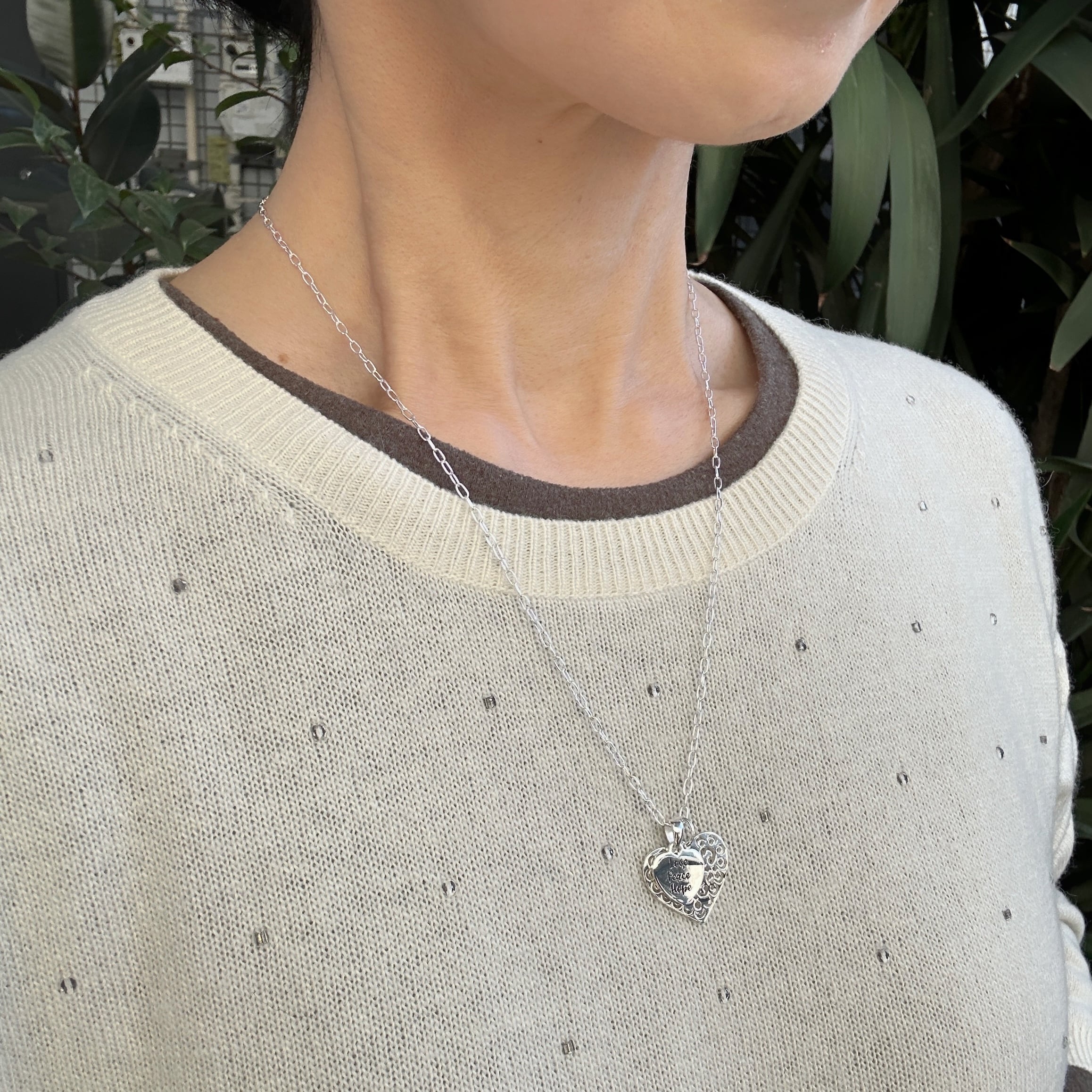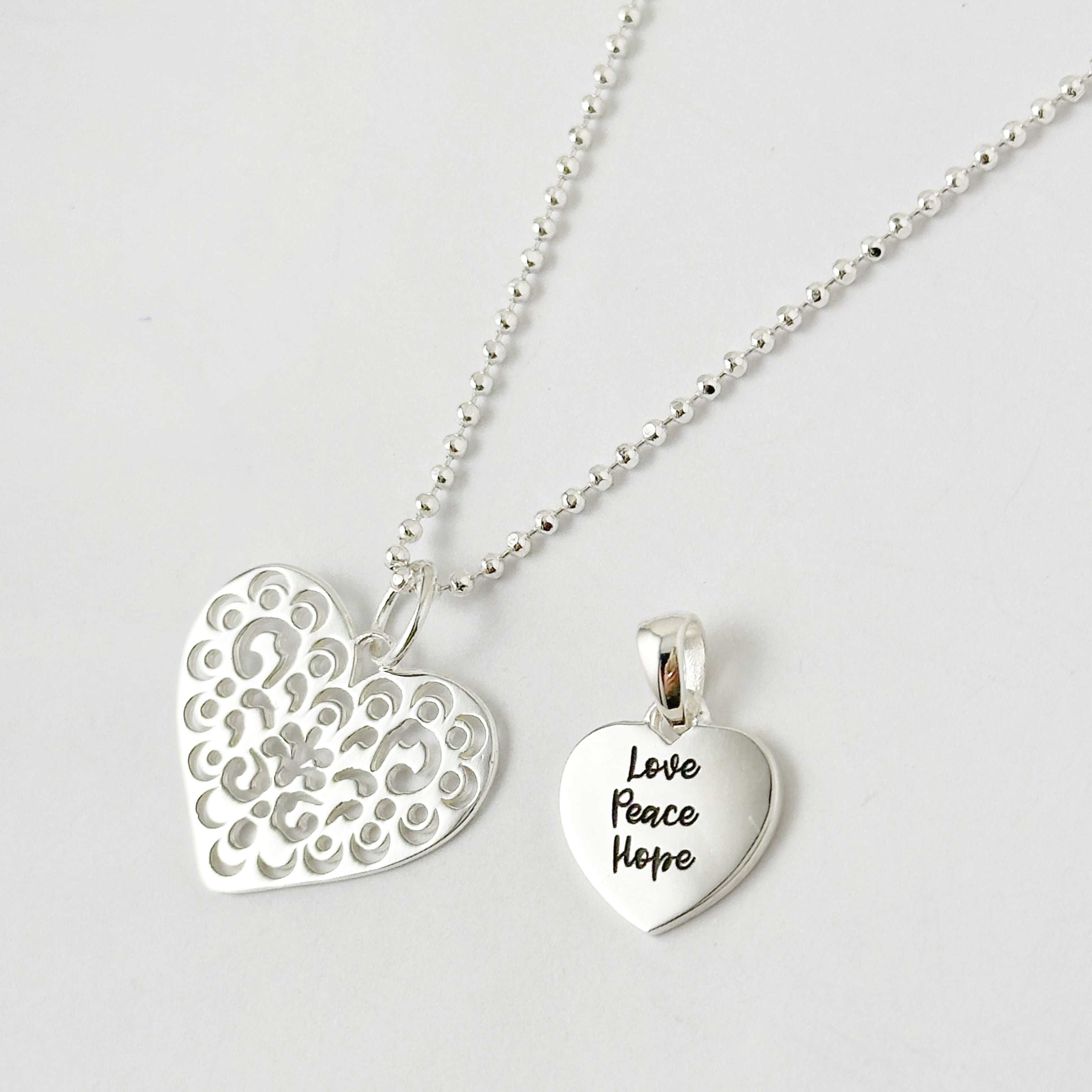 繊細なカットワークが施されたスカシのハートトップと【Love Peace Hope】のメッセージが入ったハートのトップをセットにしたネックレスになります。