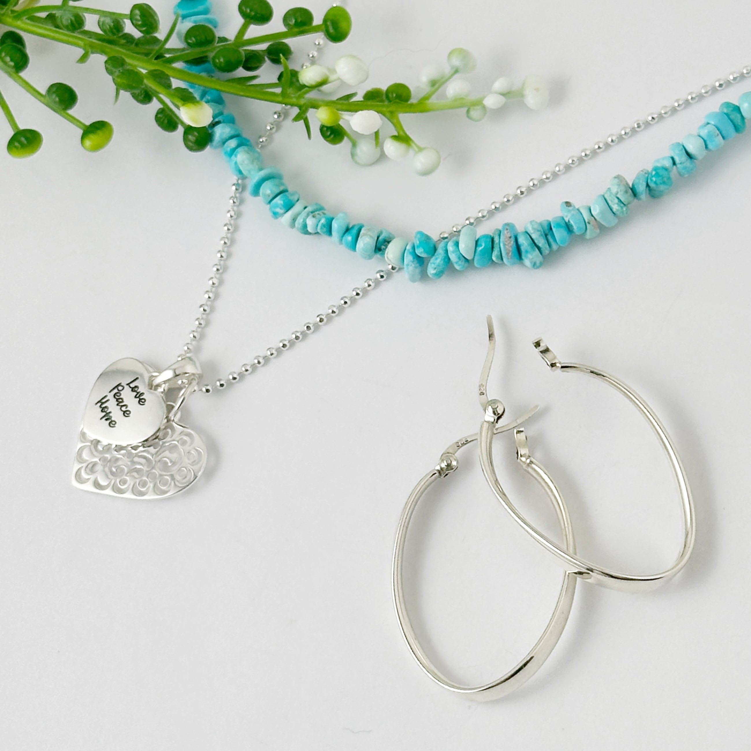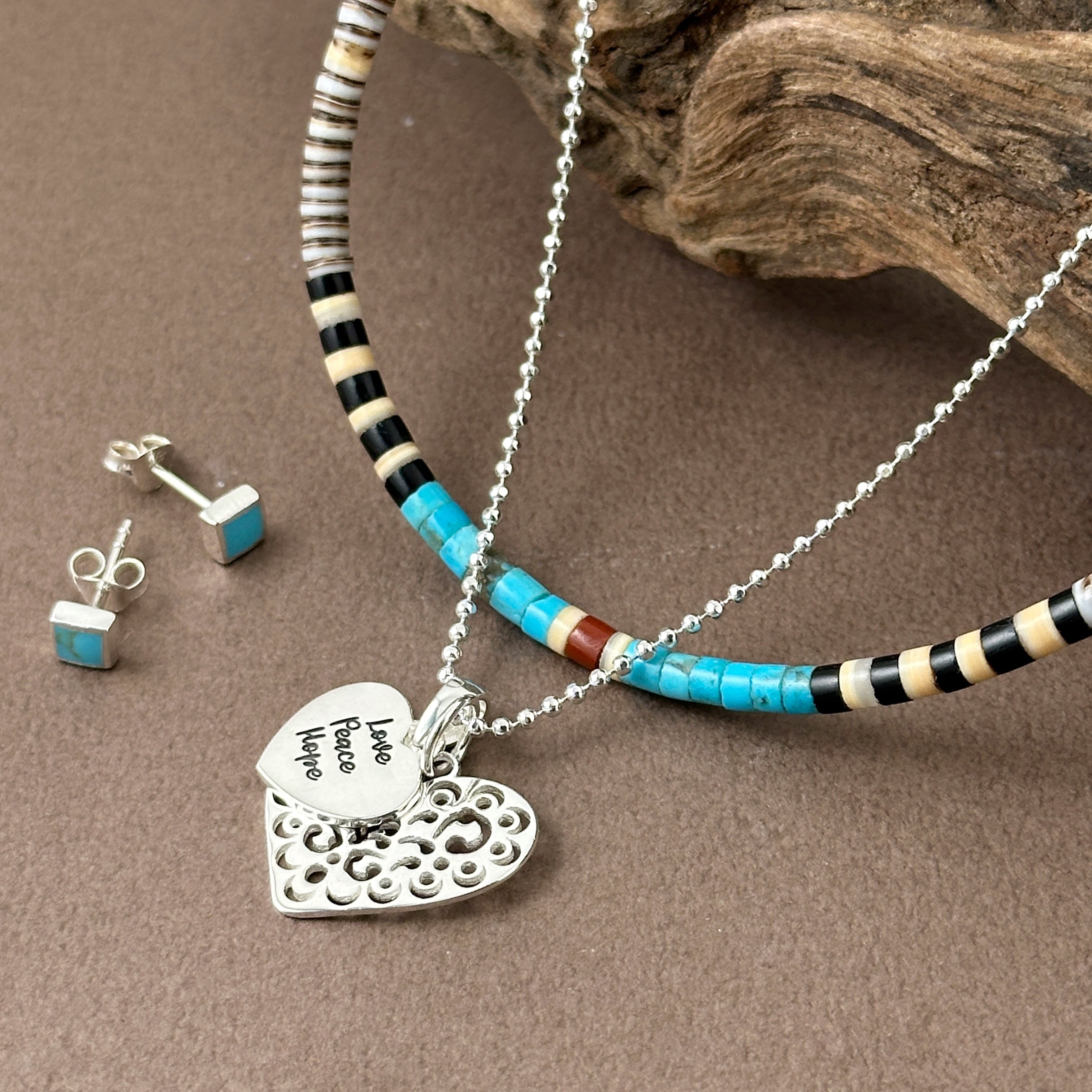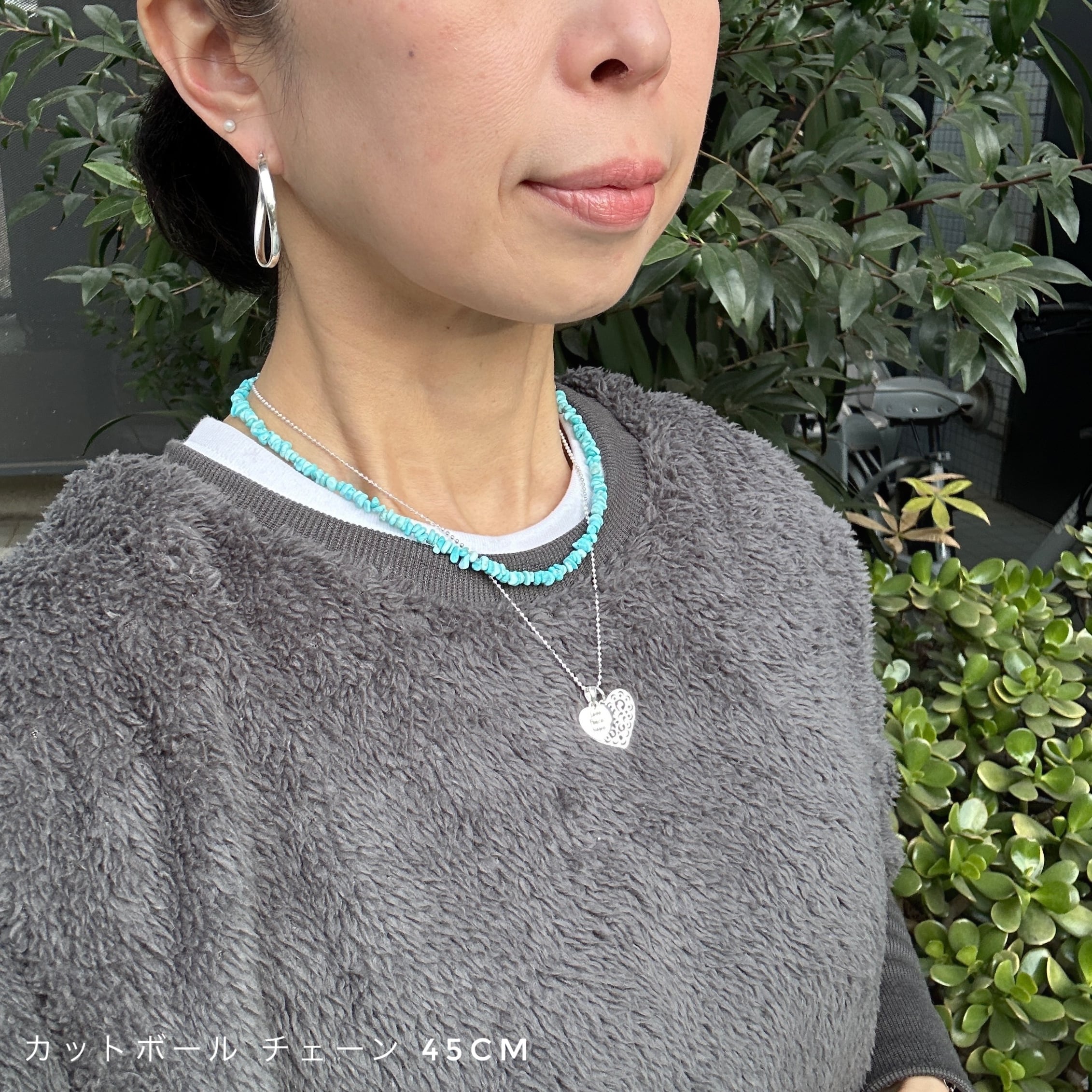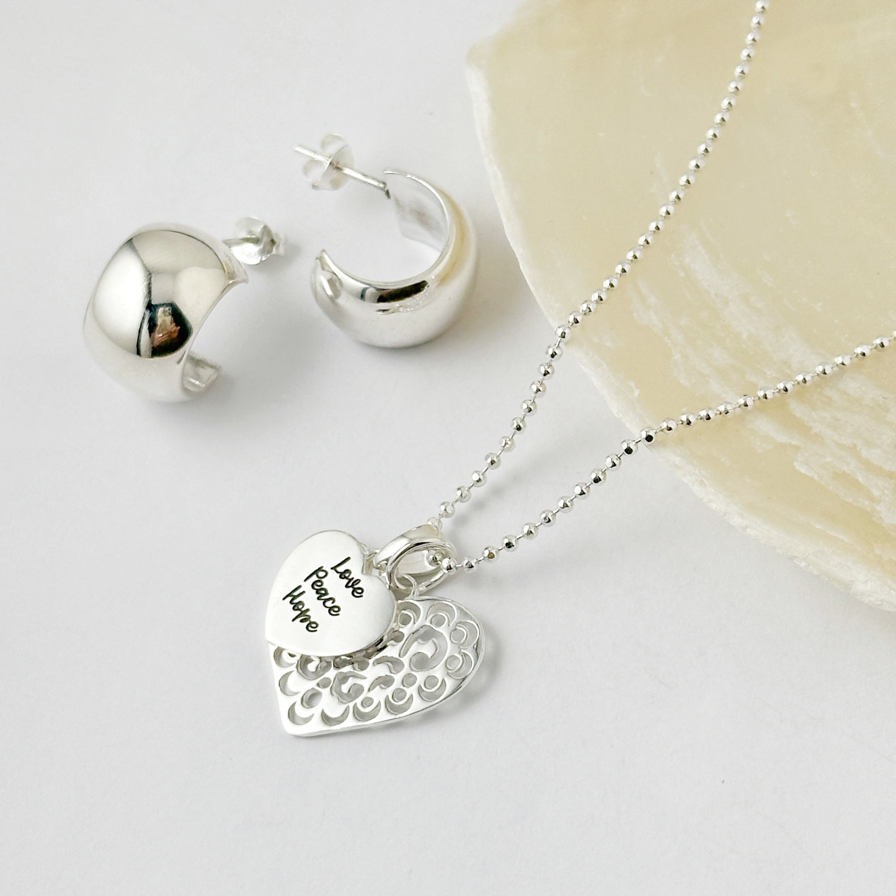 繊細なカットワークが施されたスカシのハートトップと【Love Peace Hope】のメッセージが入ったハートのトップをセットにしたネックレスになります。