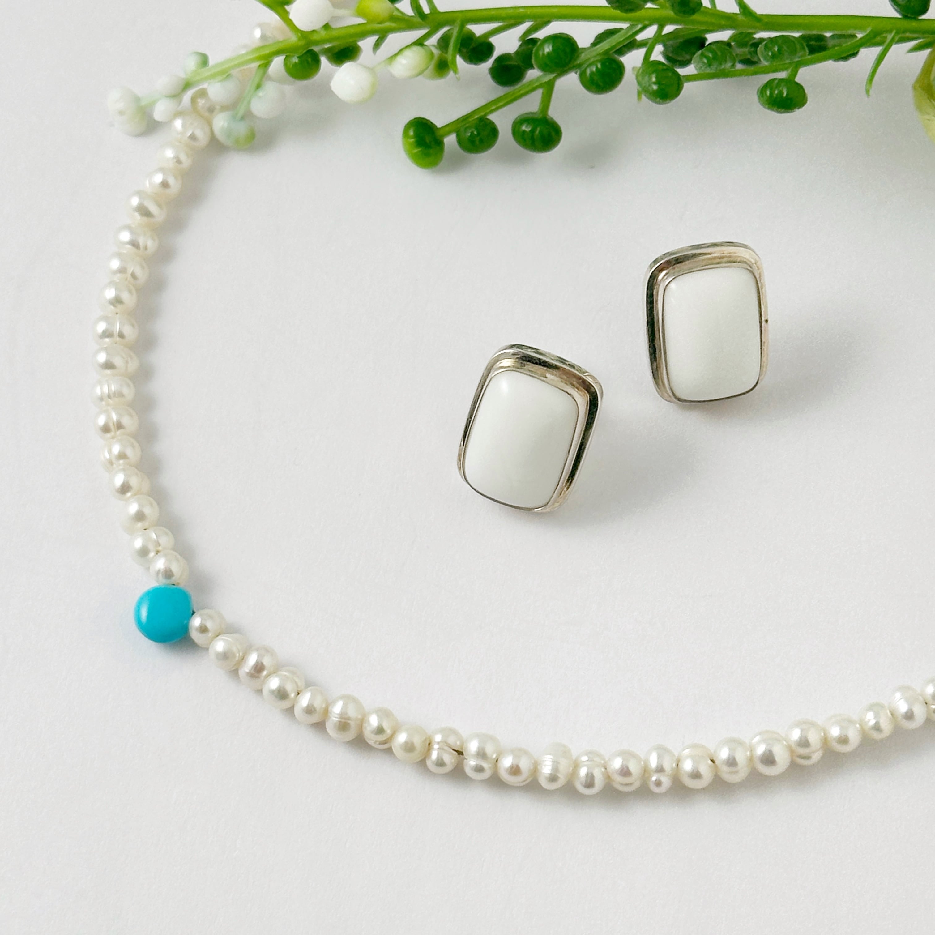 ポテト型の淡水パールとマロン型のターコイズとのコンビネーション。