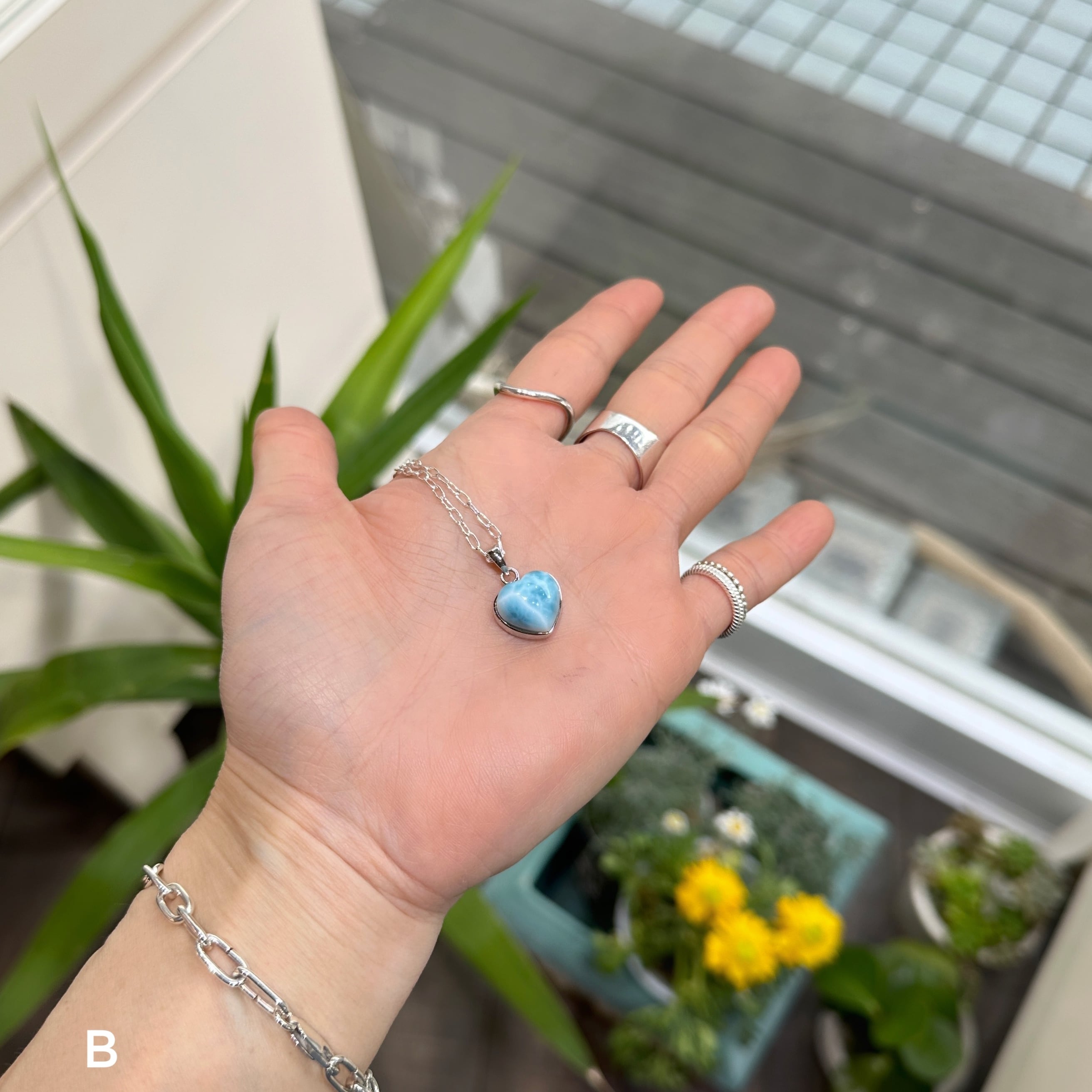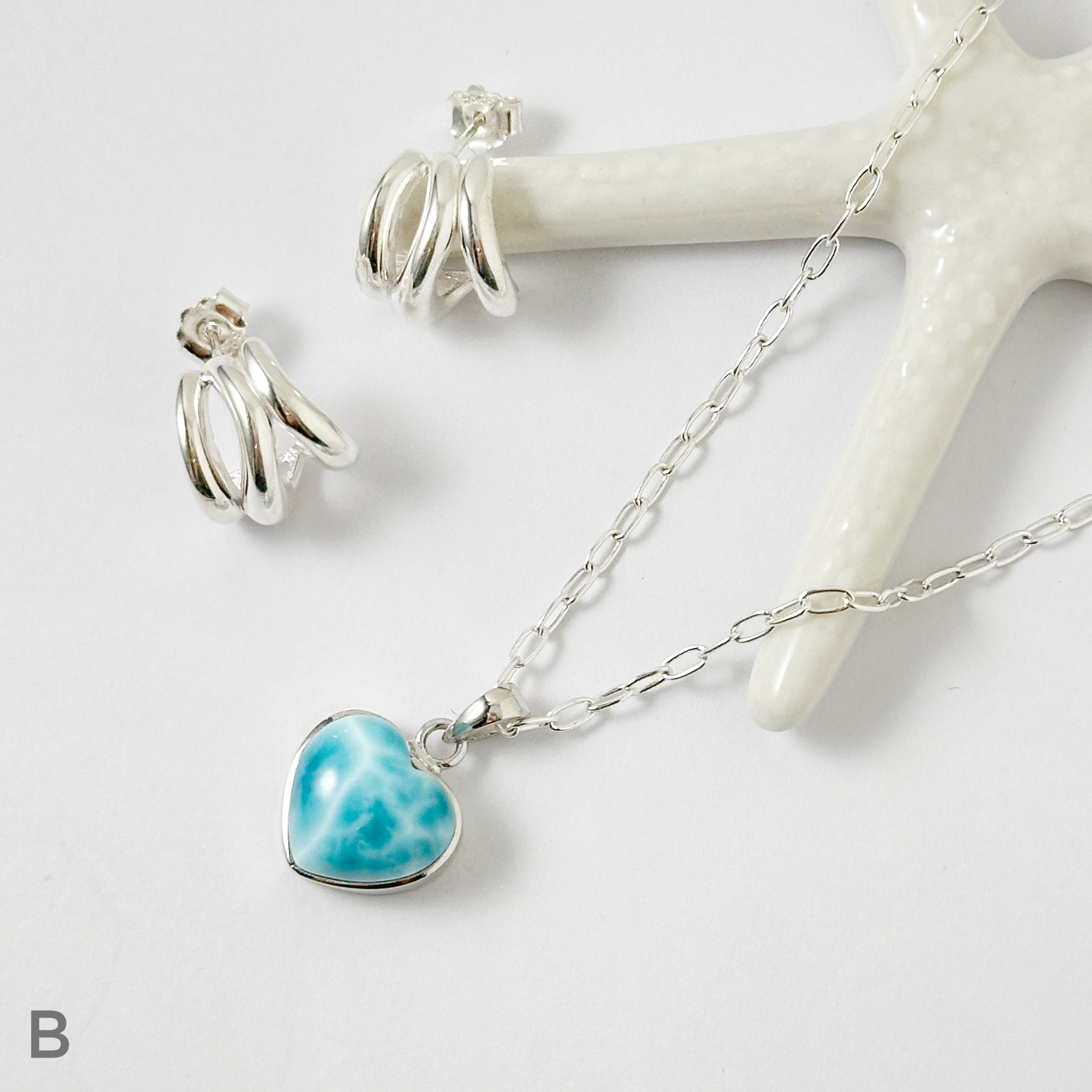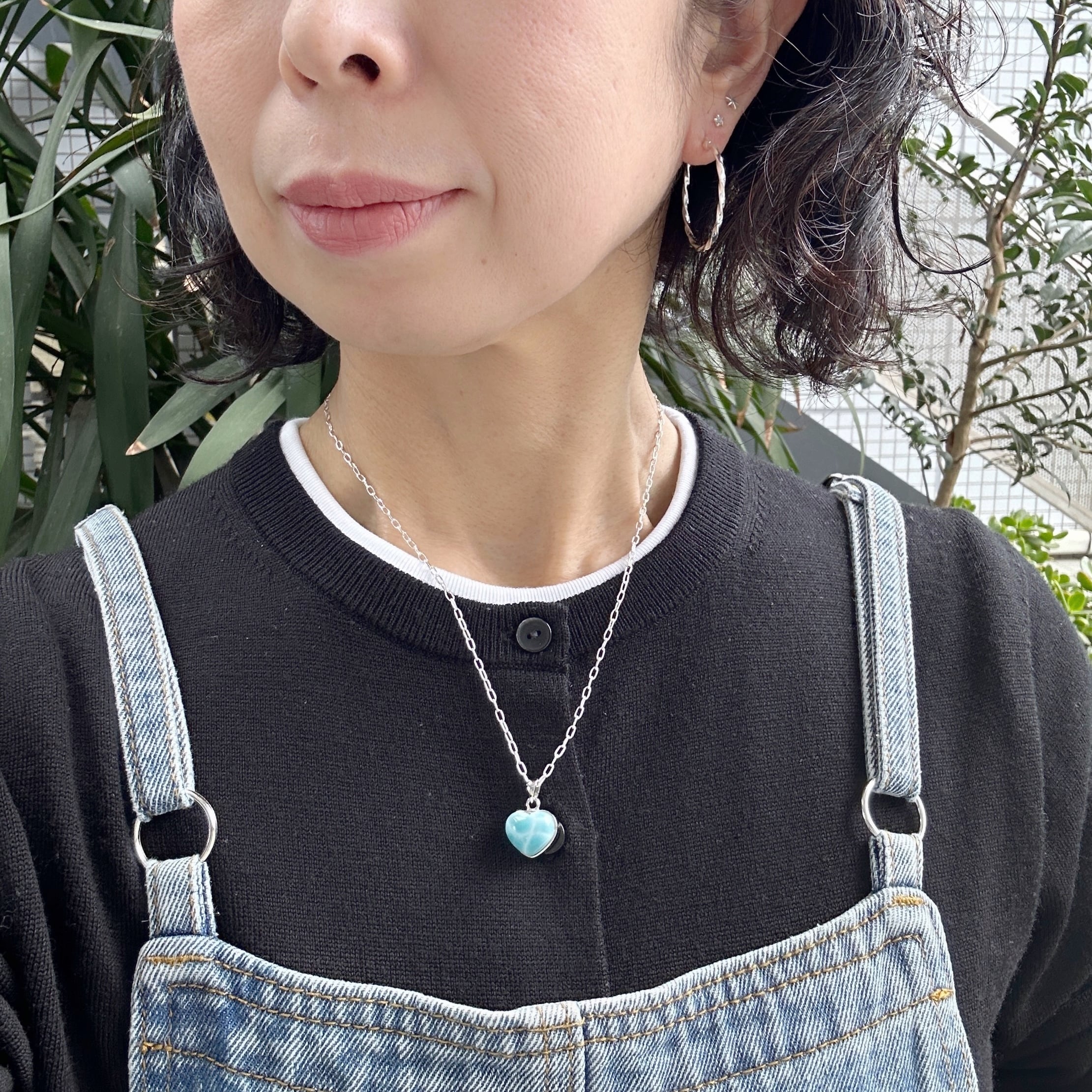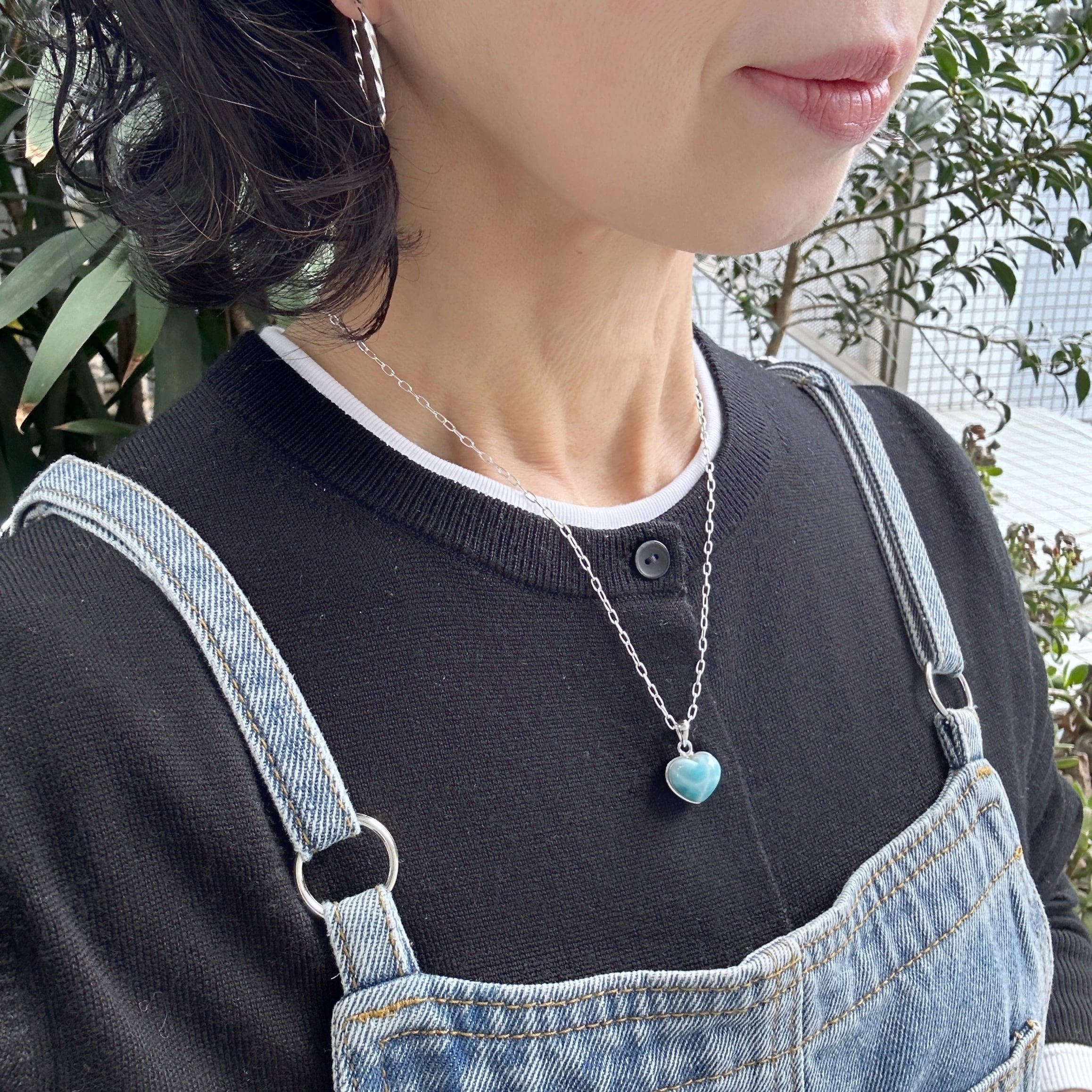 ぷっくりと丸い水滴のようなラリマーをハート型のシルバーにはめ込んだ珍しいデザインのネックレスです。
