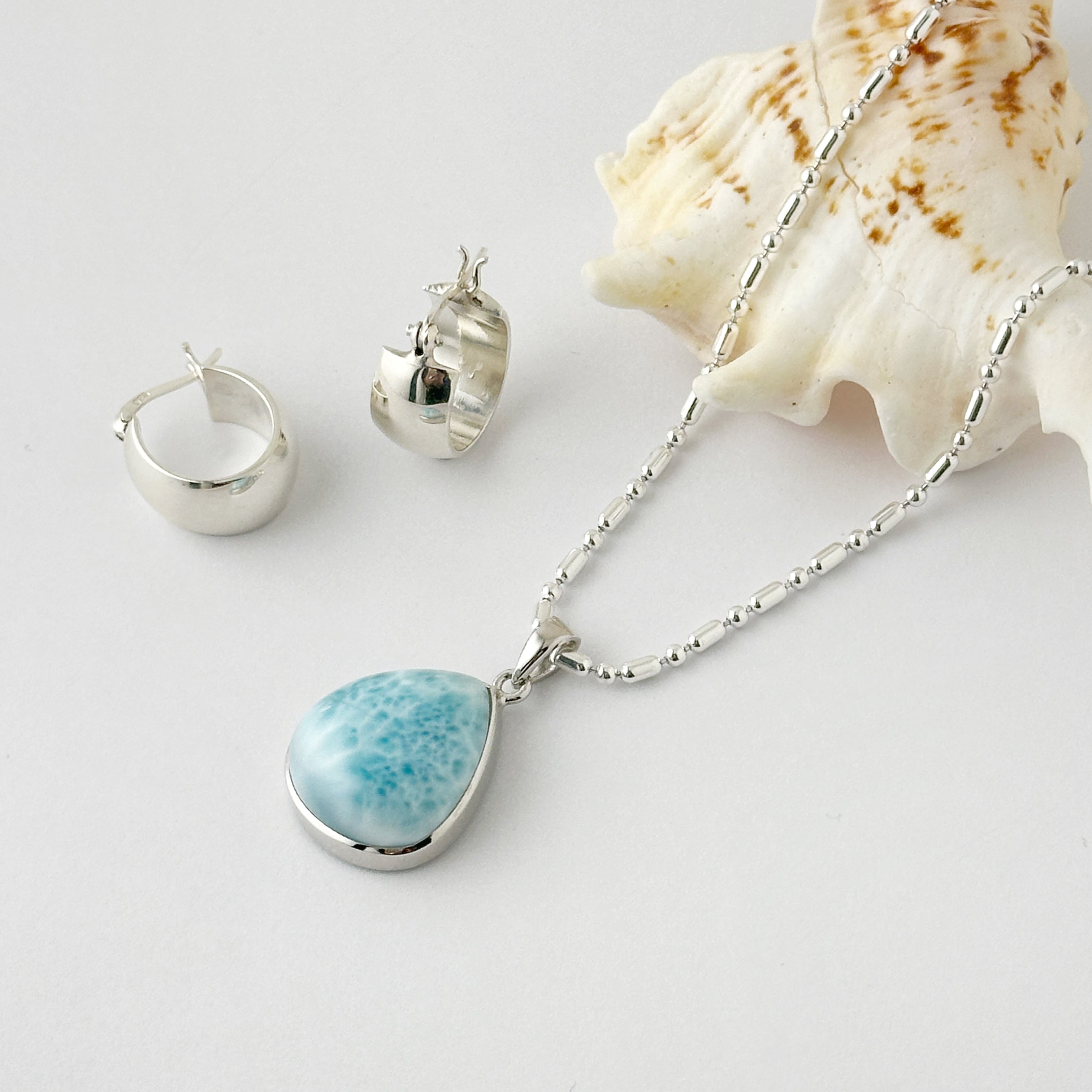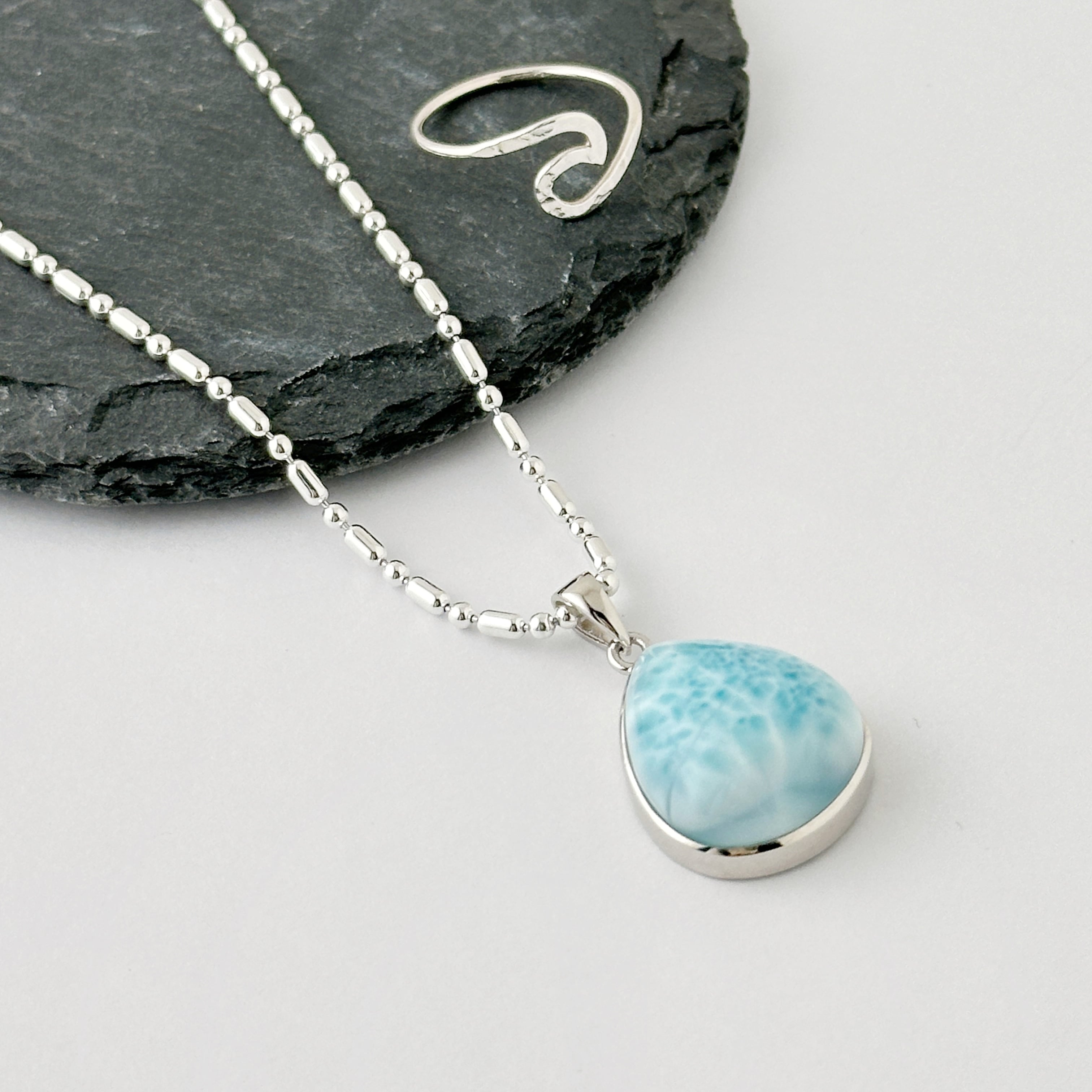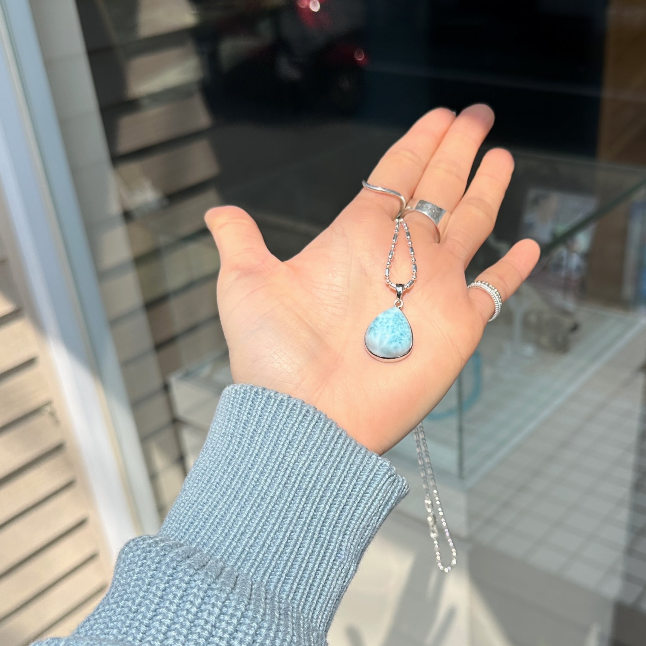 店頭でも大人気のラリマー。こちらはとっても優しい印象のラリマーで、癒されるジュエリーです。