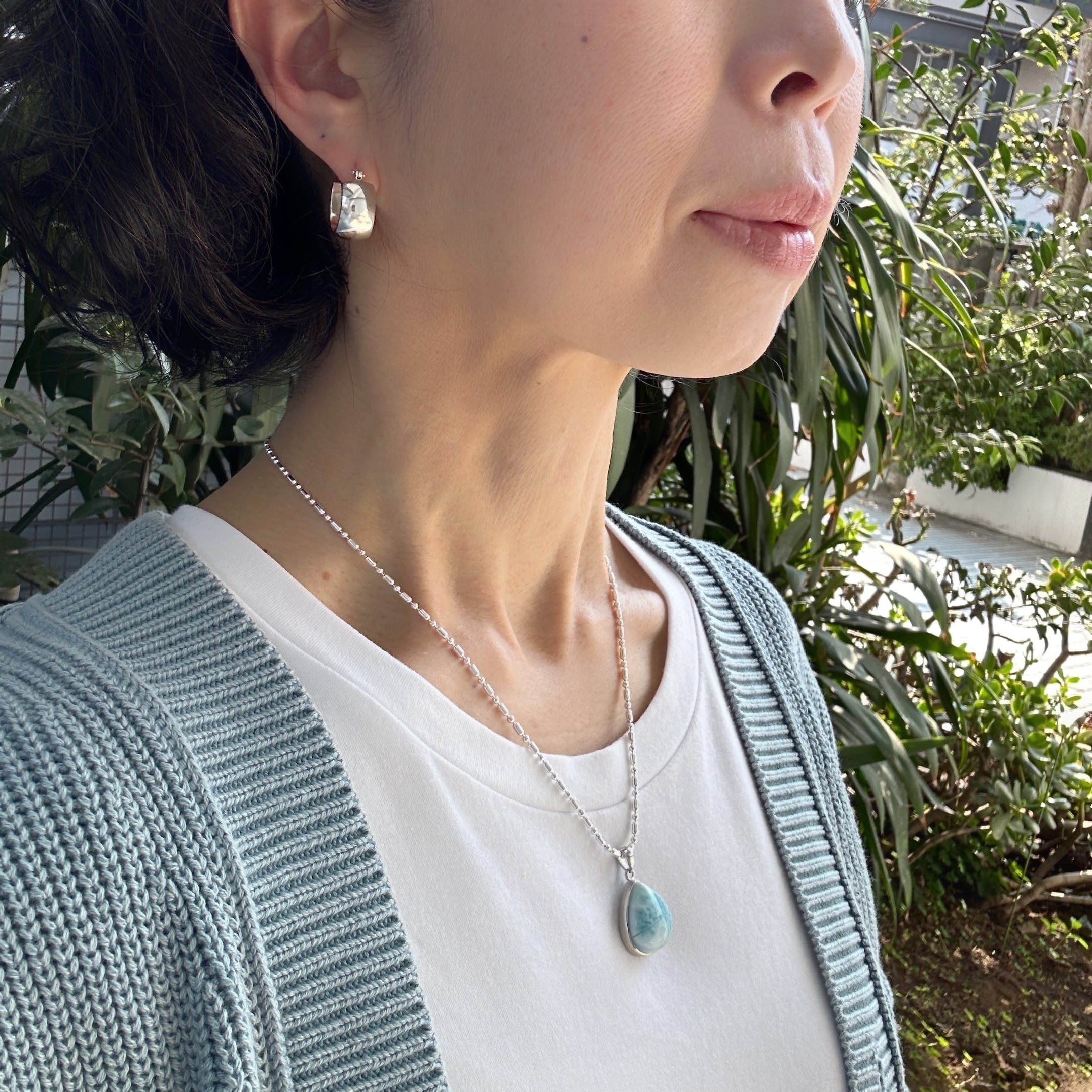 ラリマーの周りをシルバーの枠で囲っており、ペンダントトップとして、飽きのこない、シンプルなデザインです。合わせやすさは抜群です。