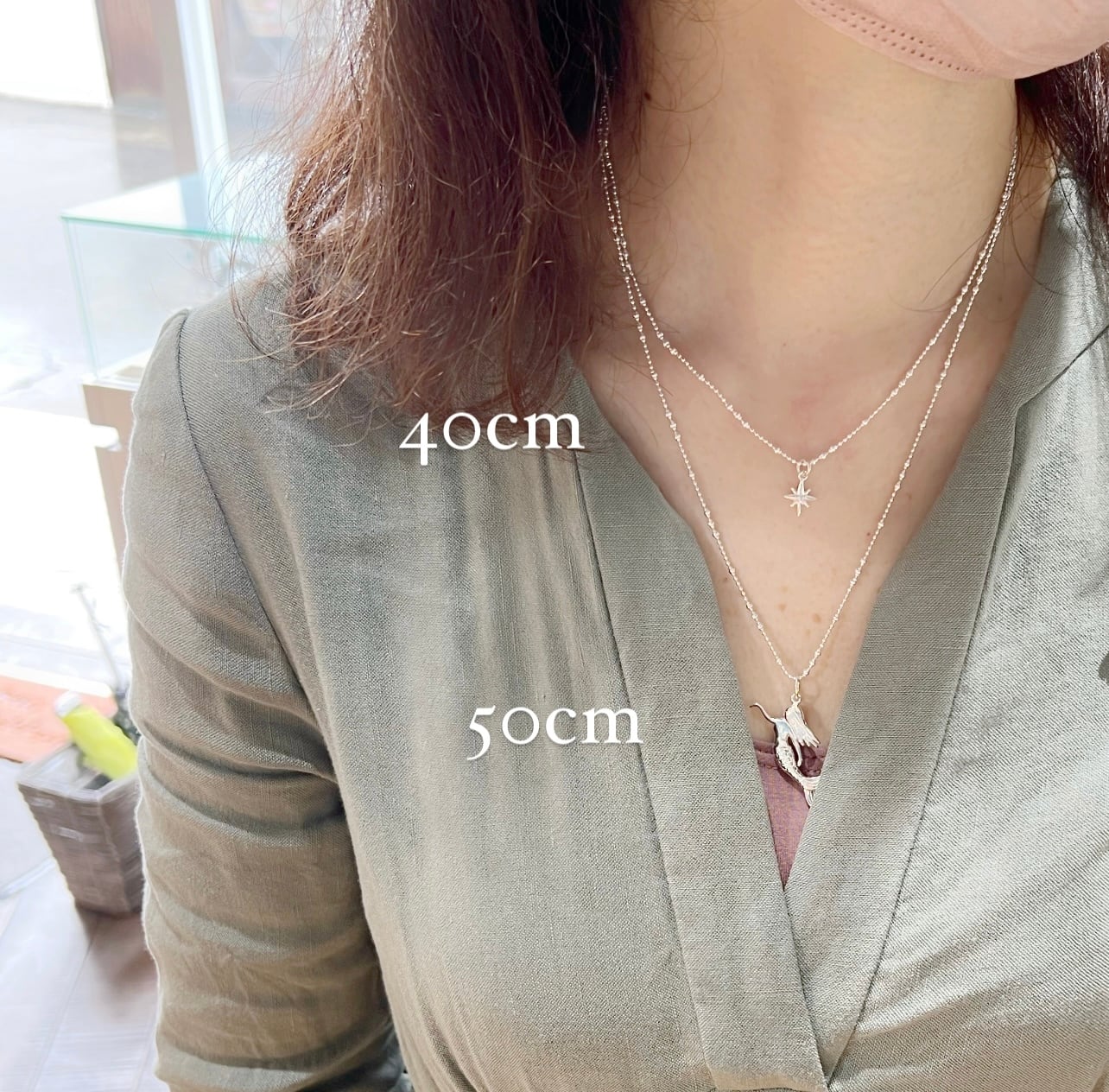 チェーンは2本ともカットビーズチェーンで、長さ違いを楽しんでください。