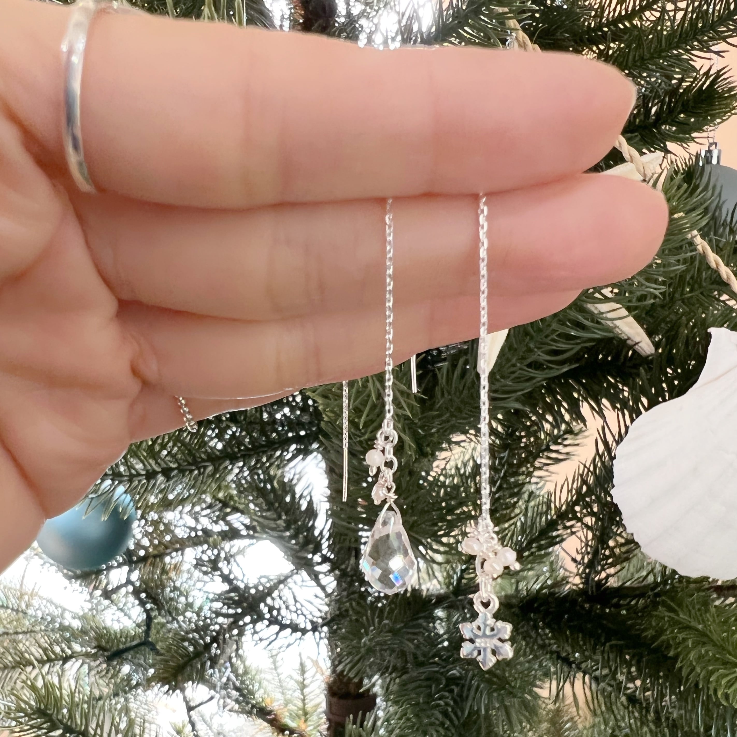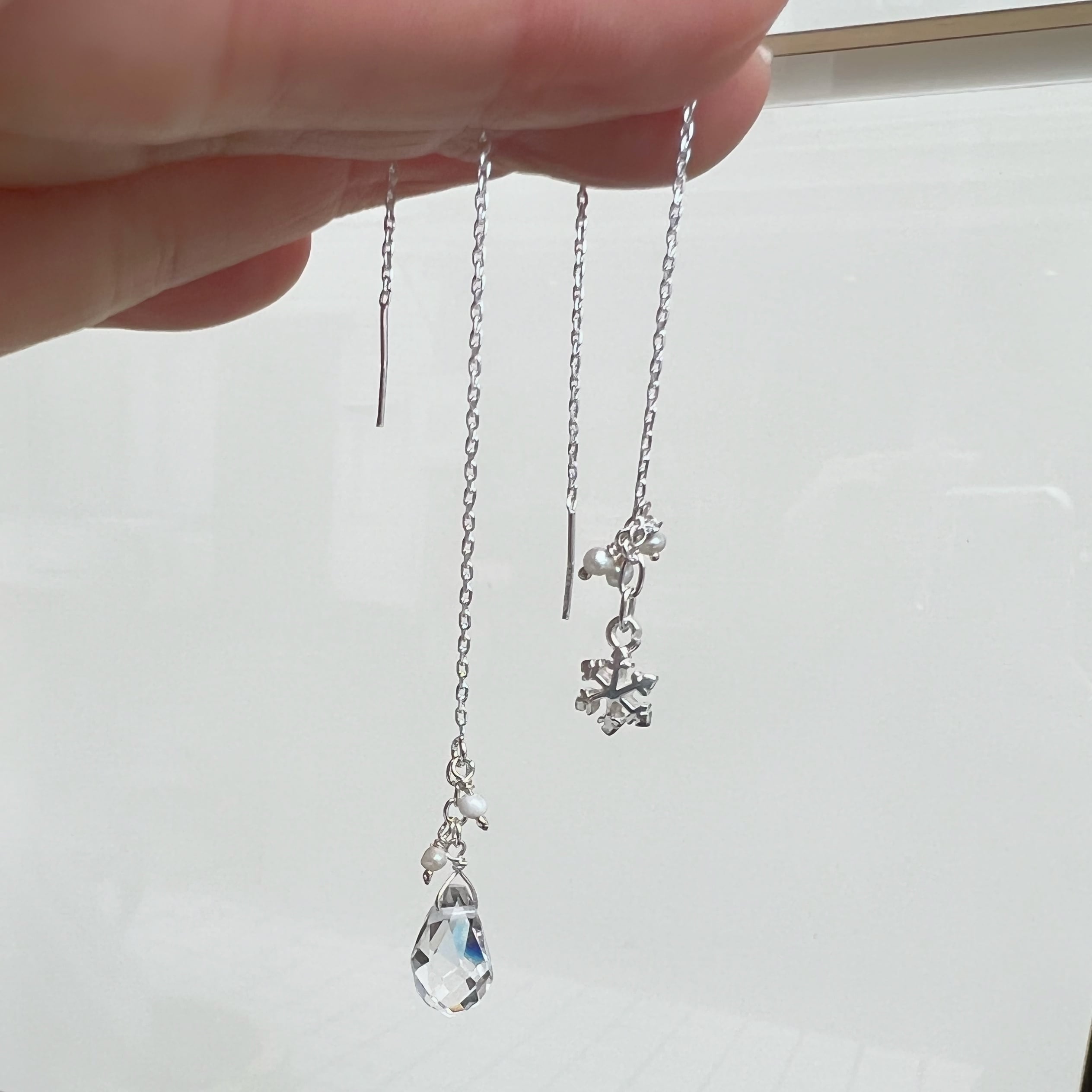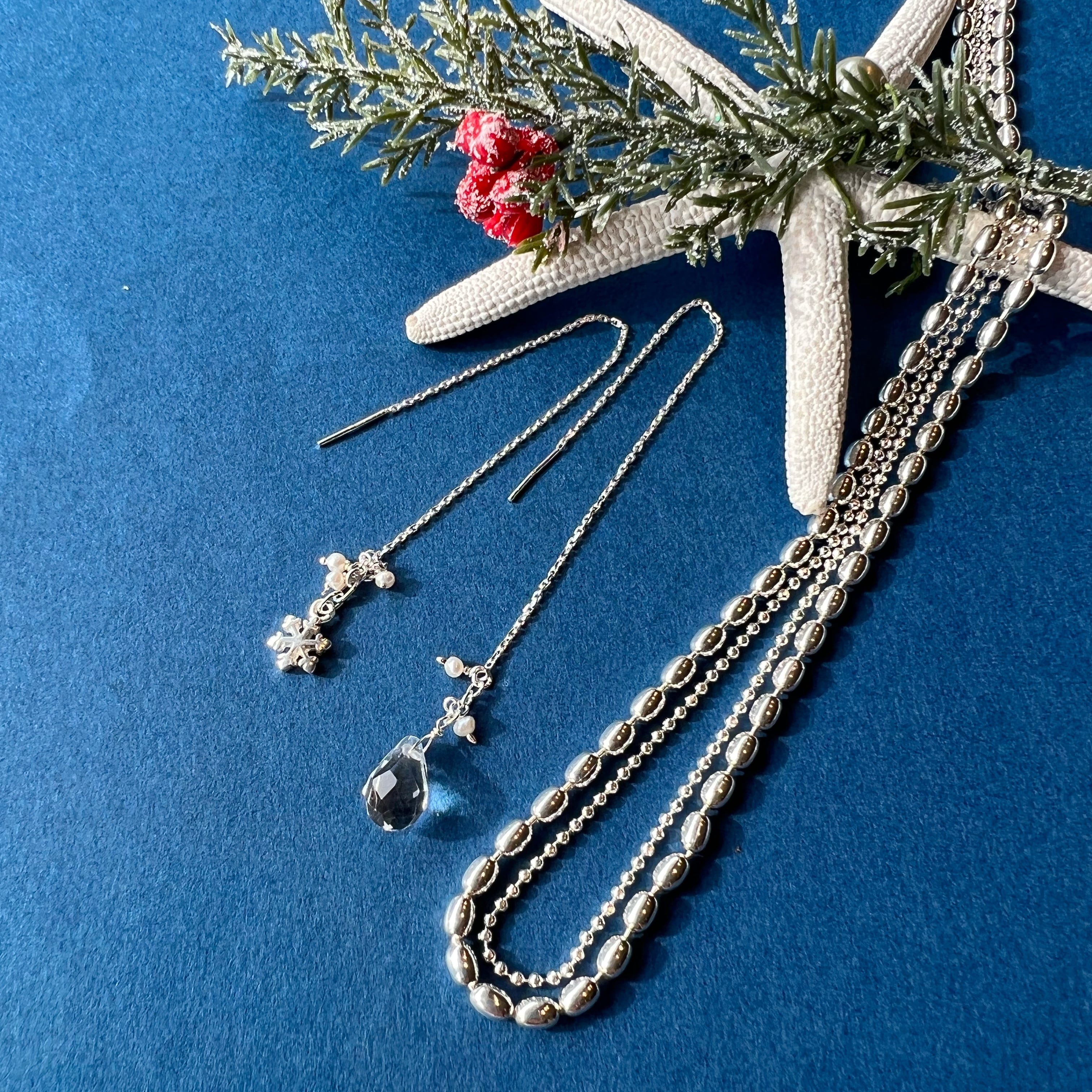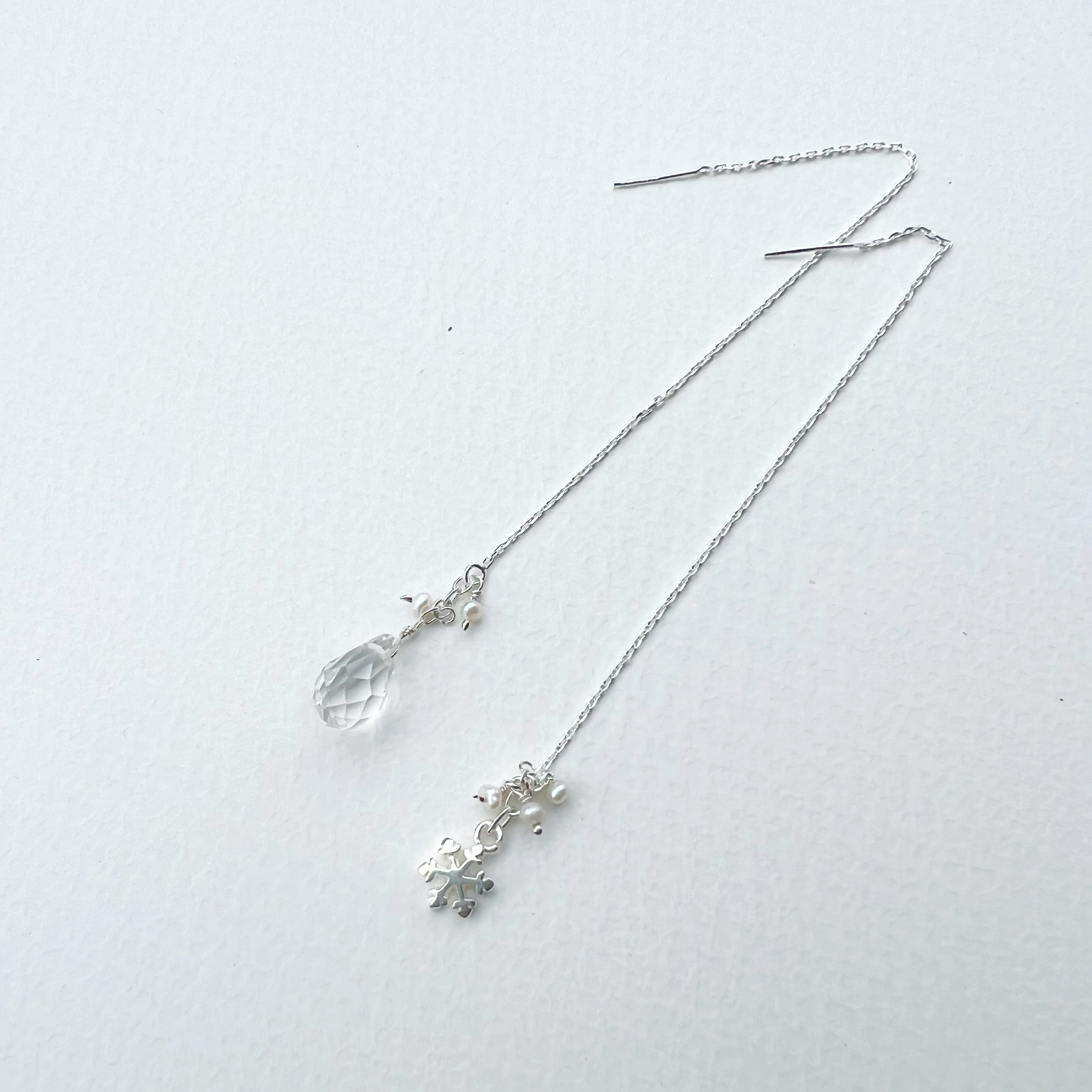 片方はクリスタルと淡水パール、もう片方はスノーと淡水パールを雪のように散らしました。