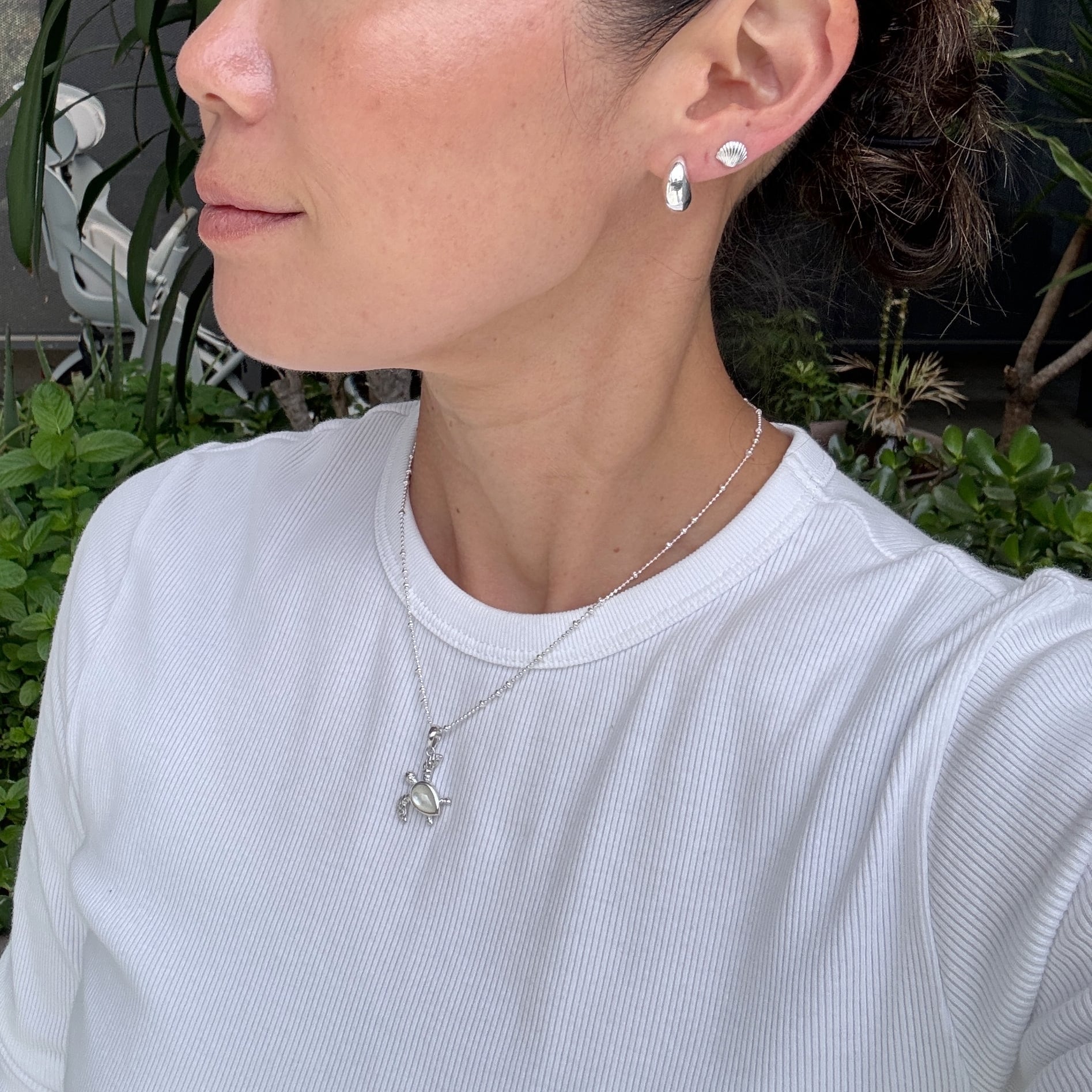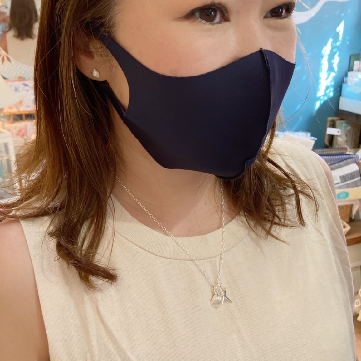 スタッドタイプのシェルのピアスは邪魔にならないのでアクティブなビーチガールズにもオススメです。