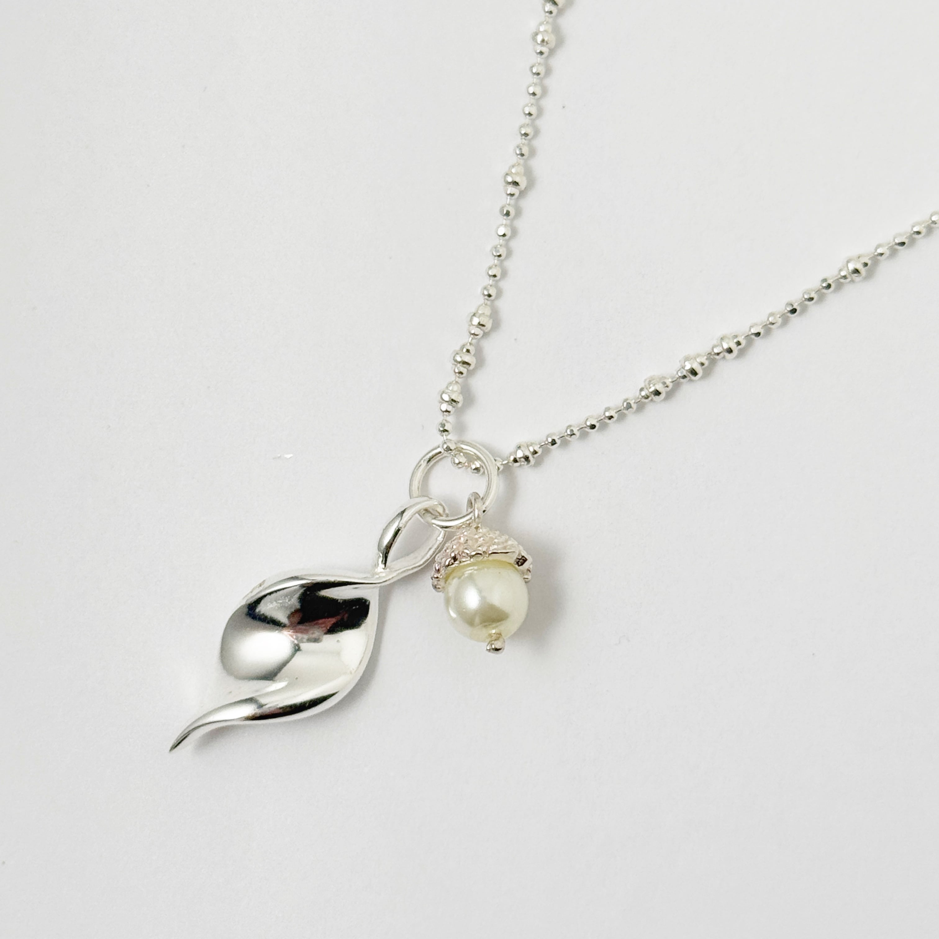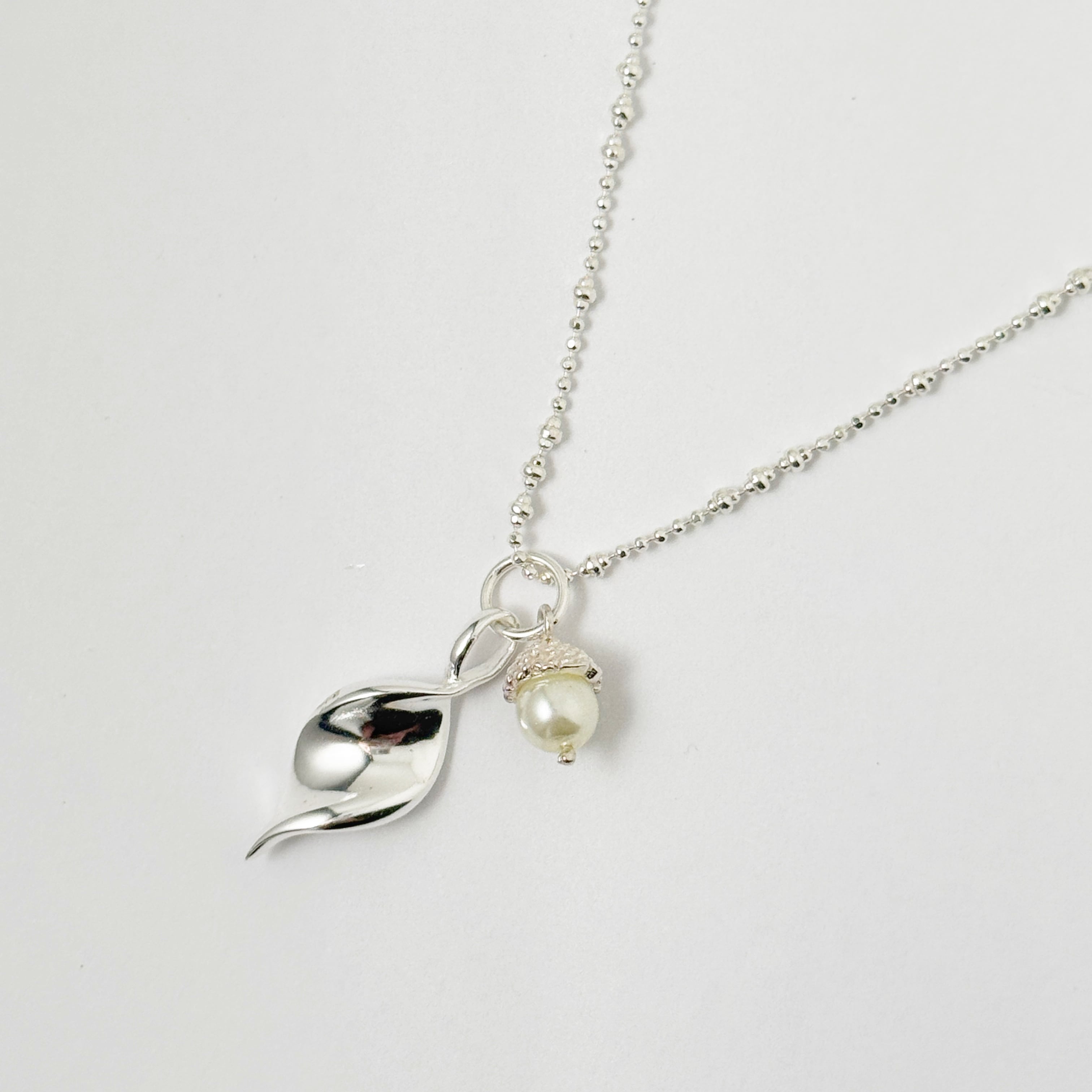 パールにどんぐりの傘をつけて、流れるような葉っぱのラインも