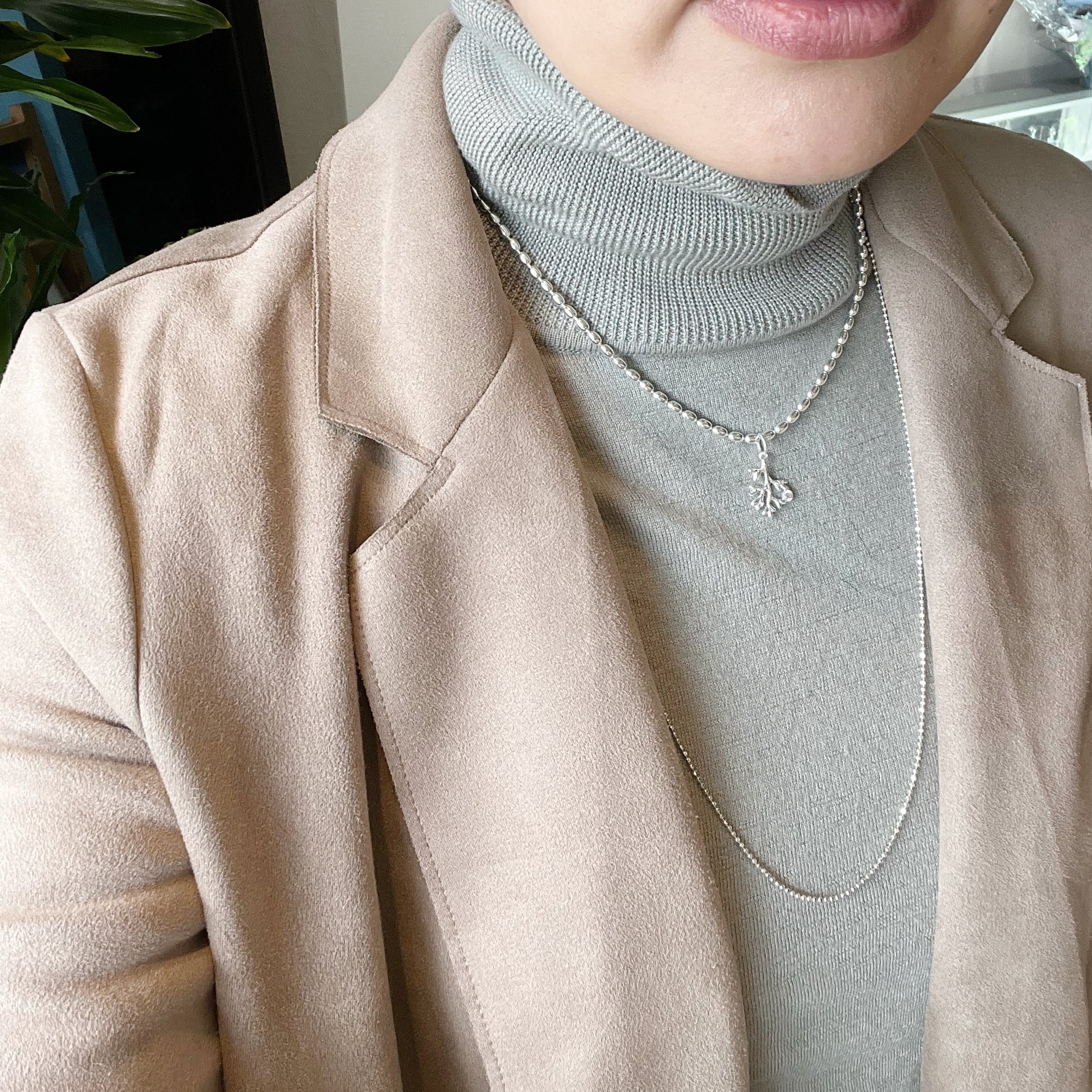 太めのチェーンを合わせて、厚みのあるニットにも負けないボリュームにしました。