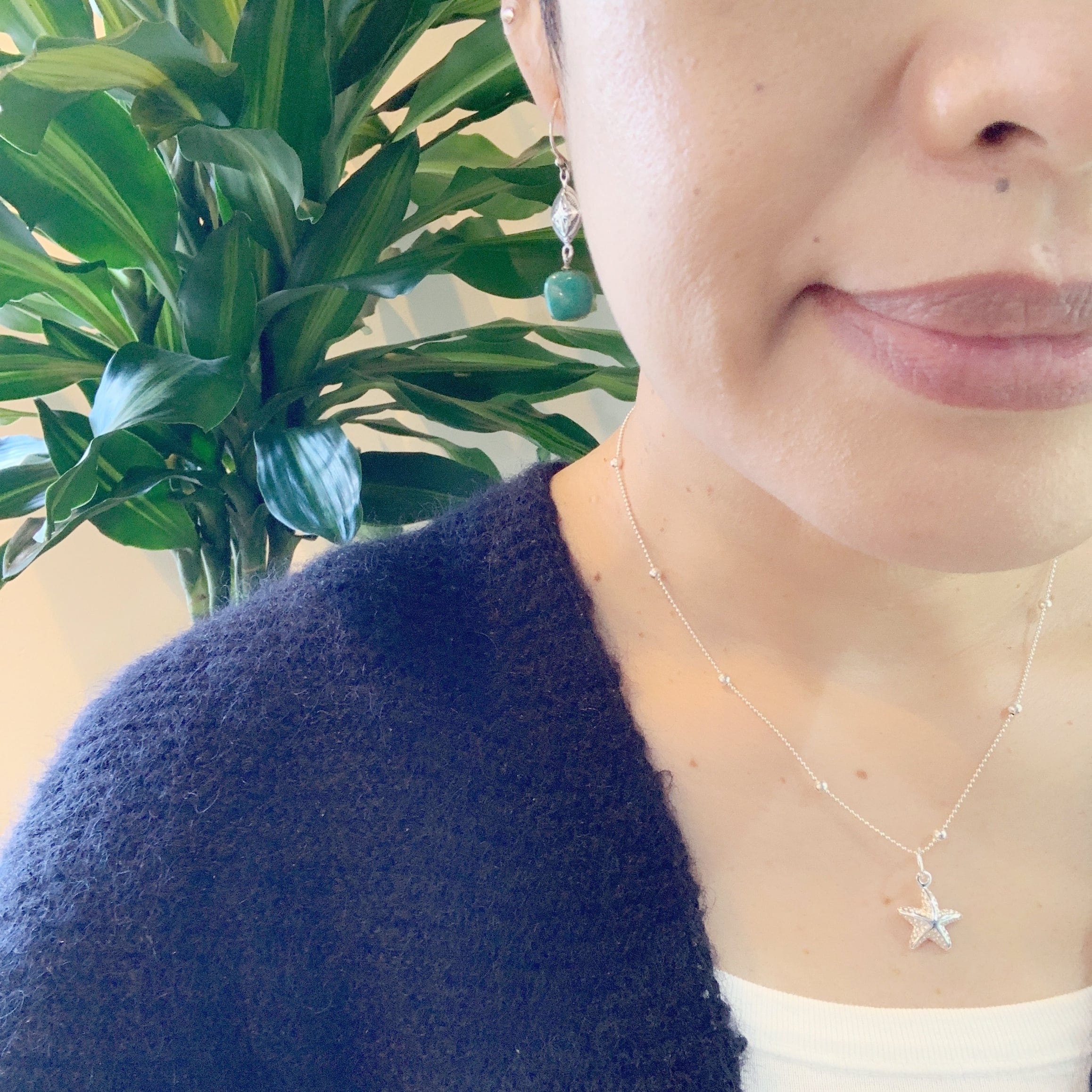 ボリュームのあるスターフィッシュのペンダントトップに、個性のあるチェーン、ステーションネックレスを合わせました。