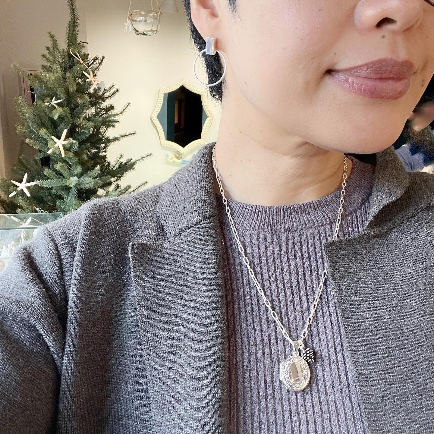 最後の写真3枚は マツボックリペンダントと重ねつけして、チェーンはボリュームロングアズキチェーンと合わせました。