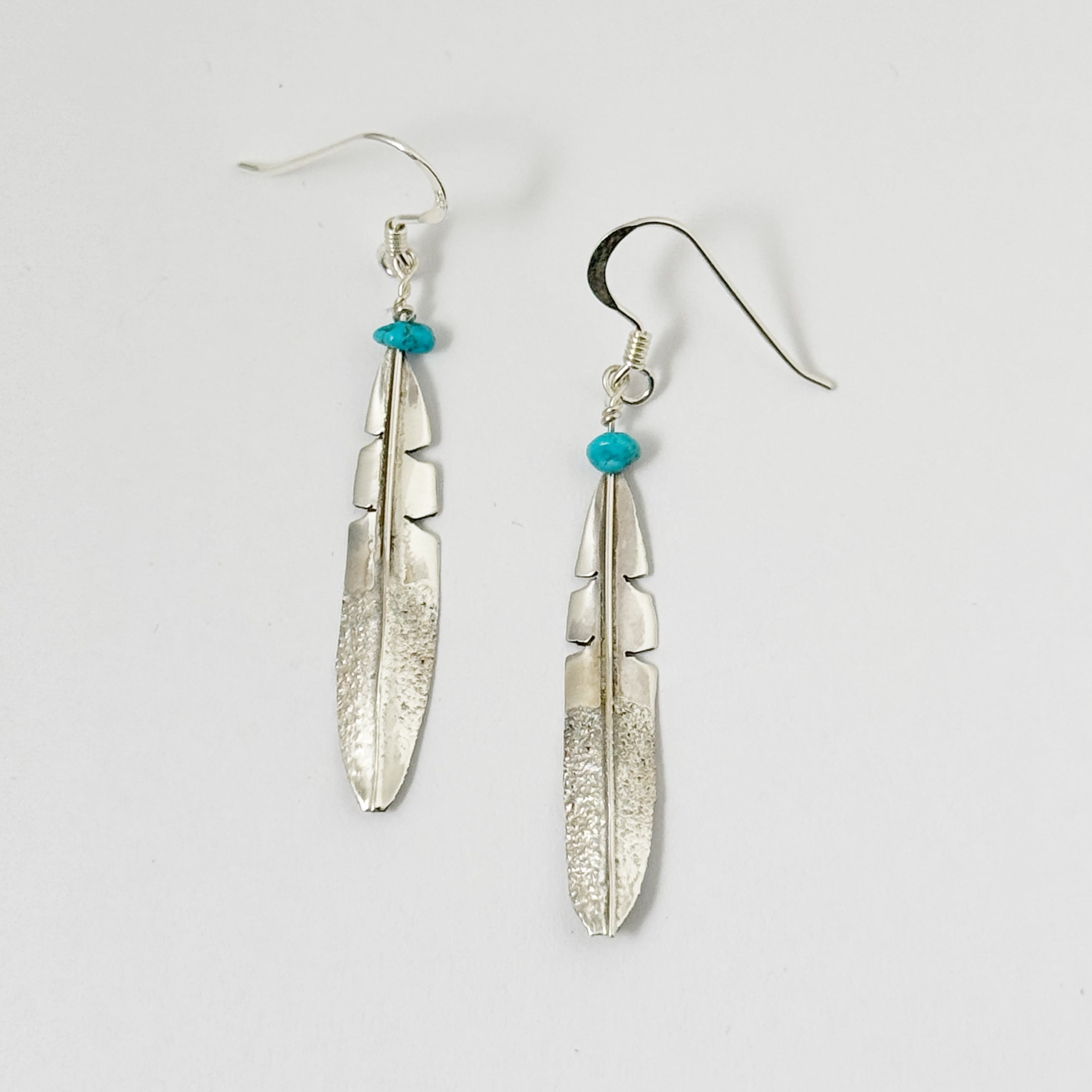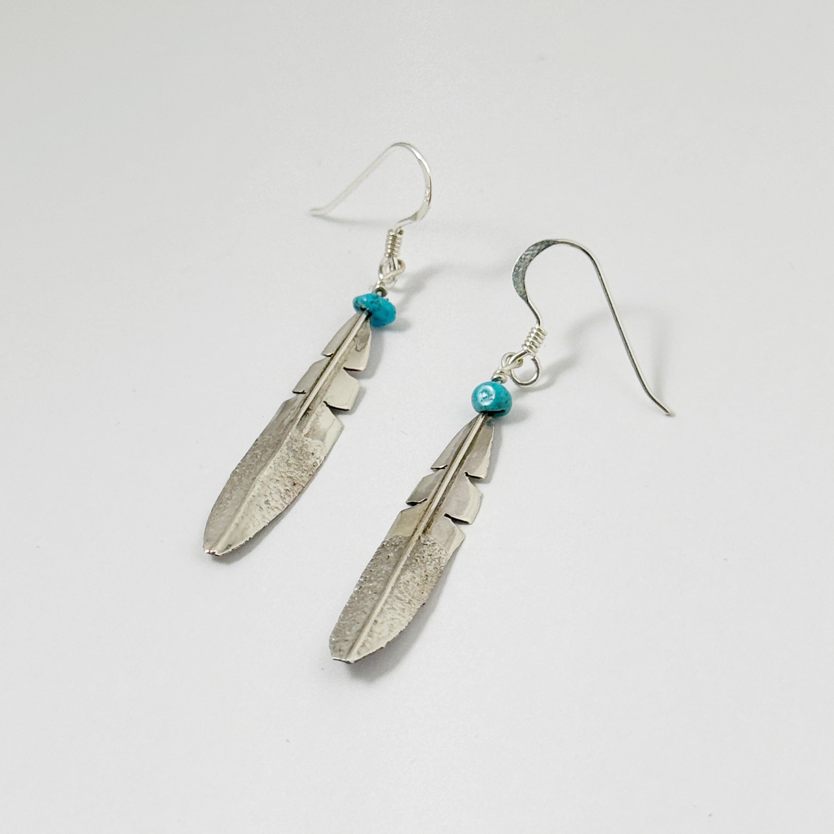 Indian Jewelry のフェザーと小さなターコイズがついたロングピアス。