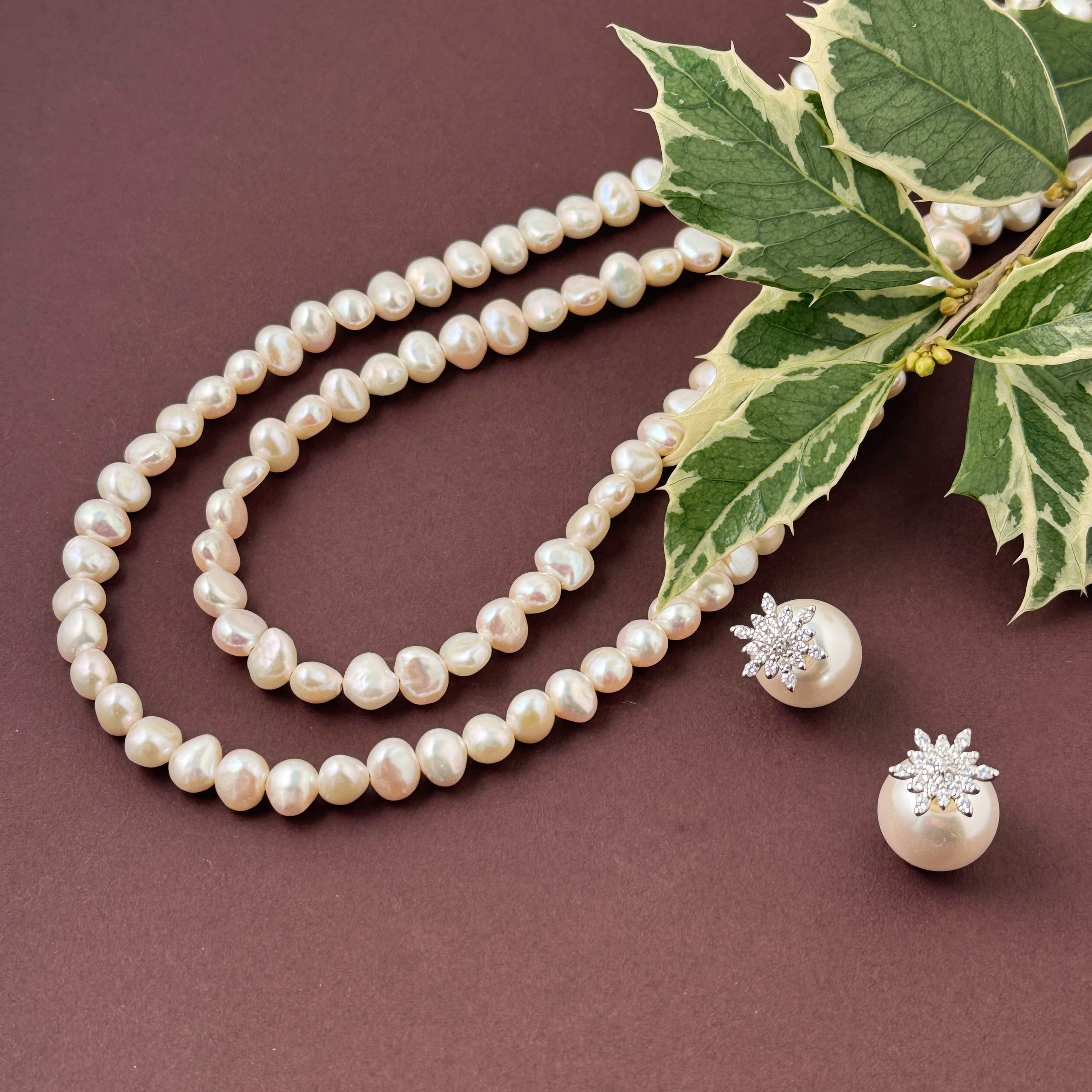 ジルコニアをふんだんに使ったスタッド型のスノーピアスにキャッチが約1.4cm の大きめパールのセットです。