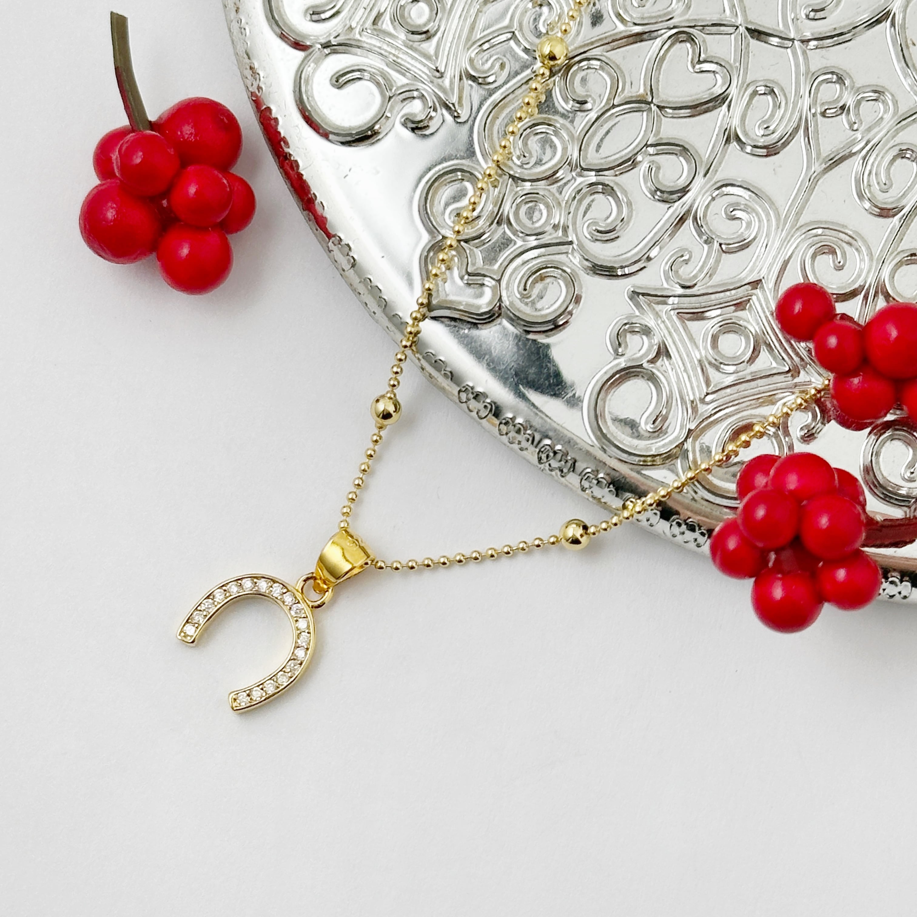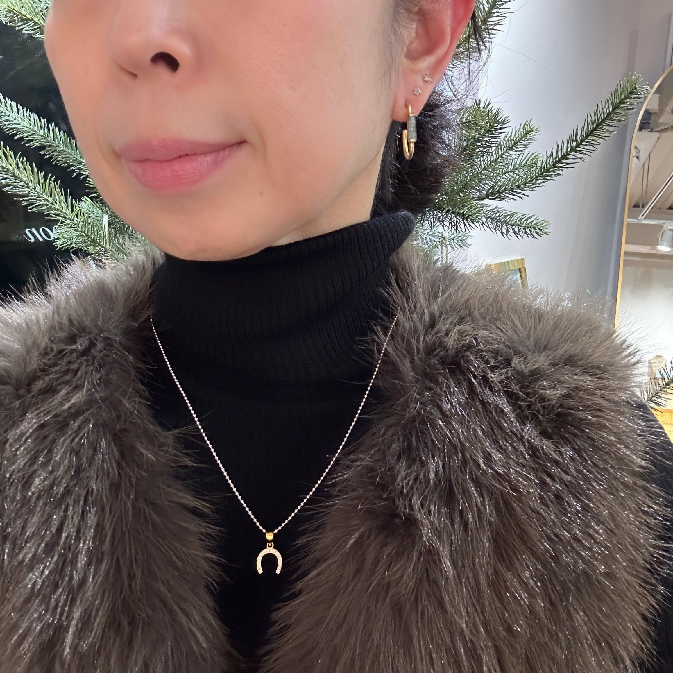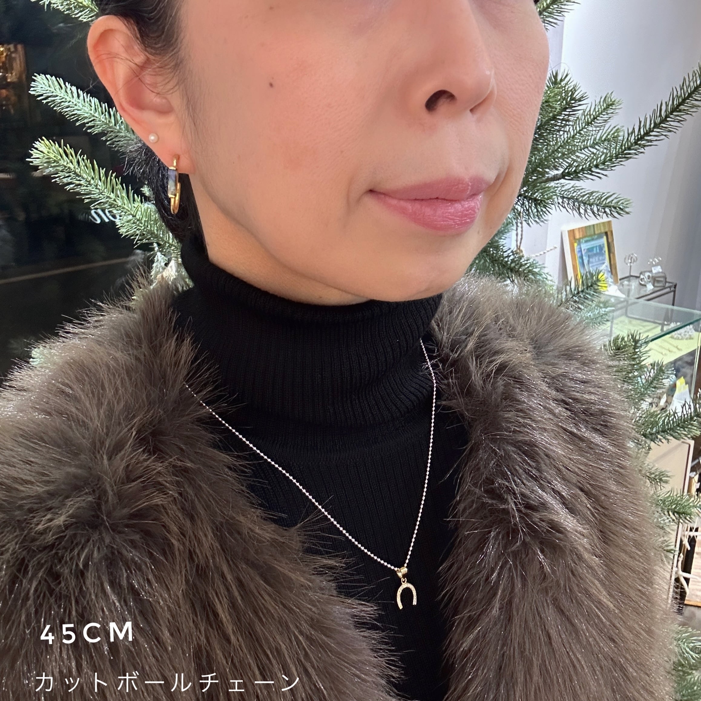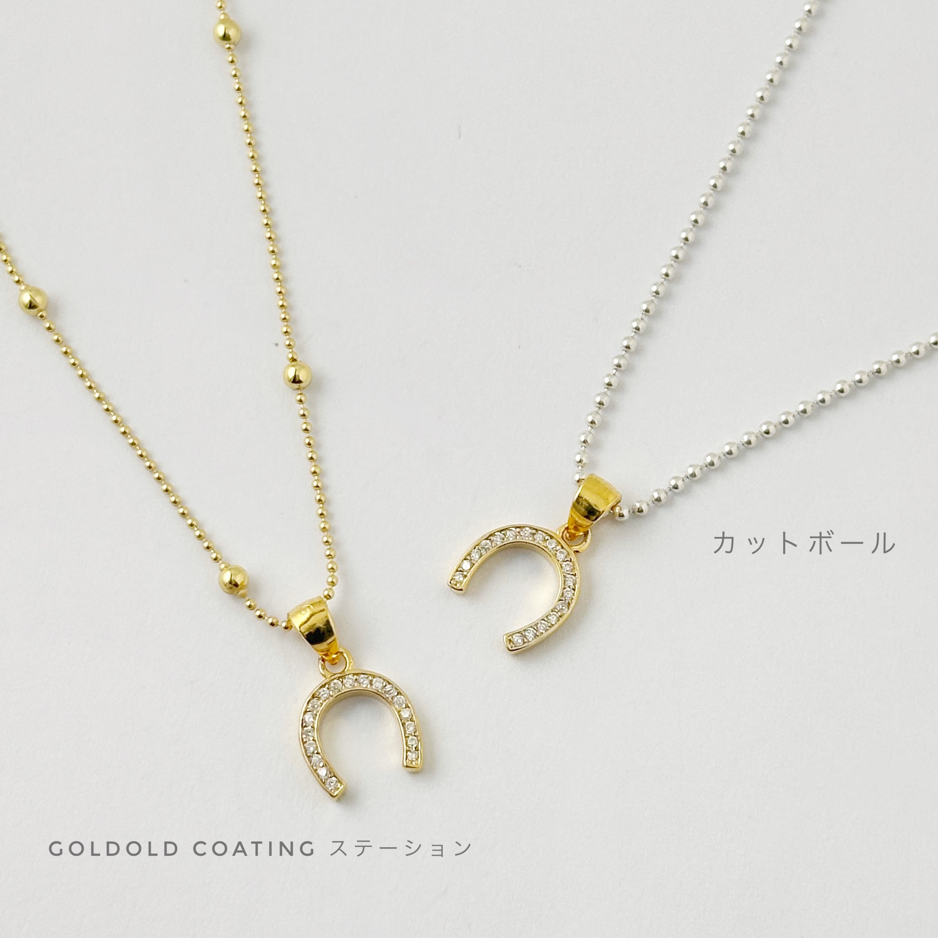 ゴールドコーティングのステーションネックレス に ラッキーチャームの馬蹄のペンダントトップを通してみました。