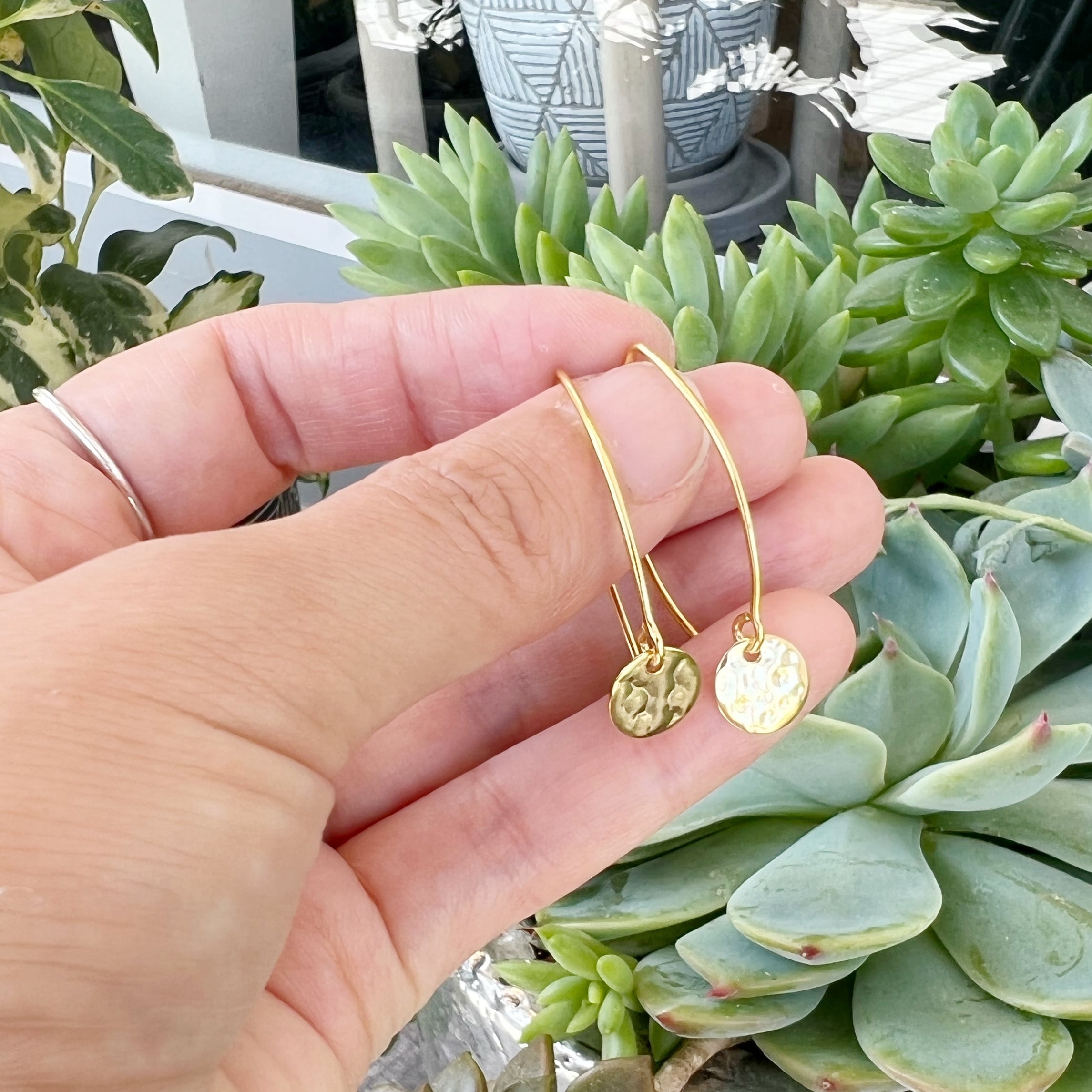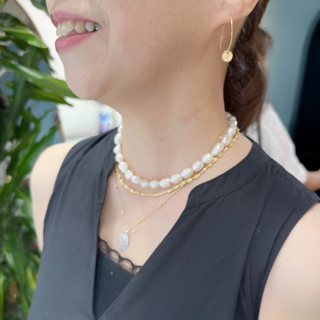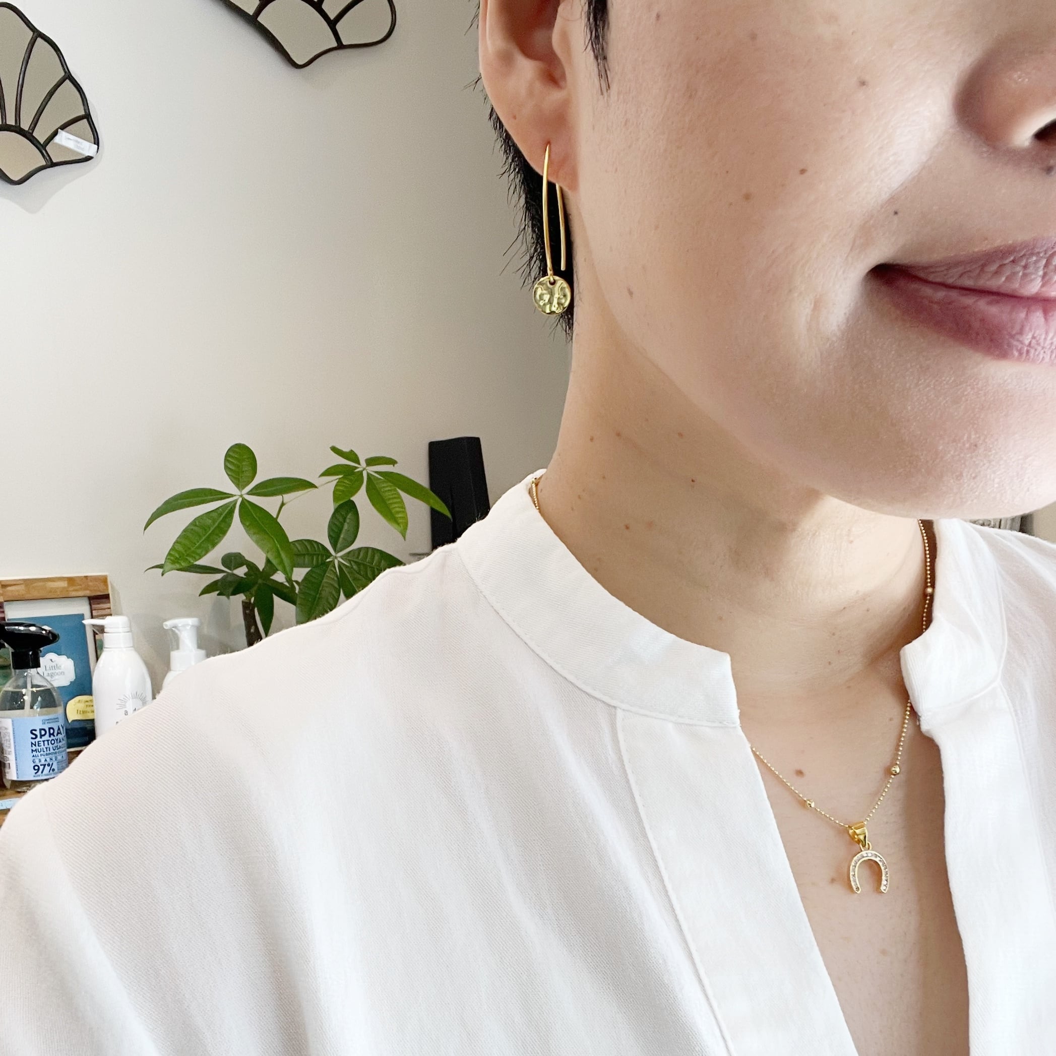とっても小さなコインパーツを首筋が綺麗に見えるロングフックで合わせました。