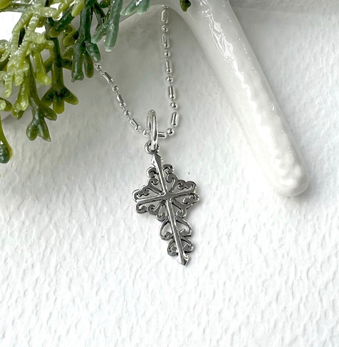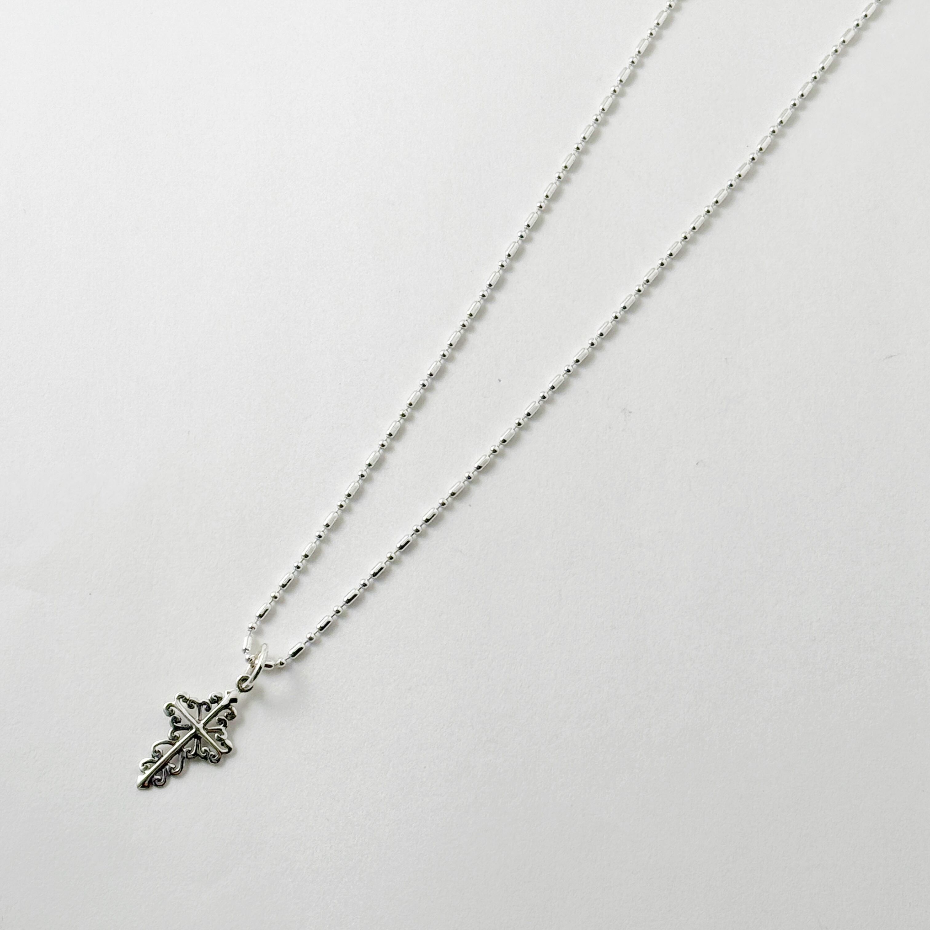 レースのスカシカットの美しさが際立つクロスネックレスです。