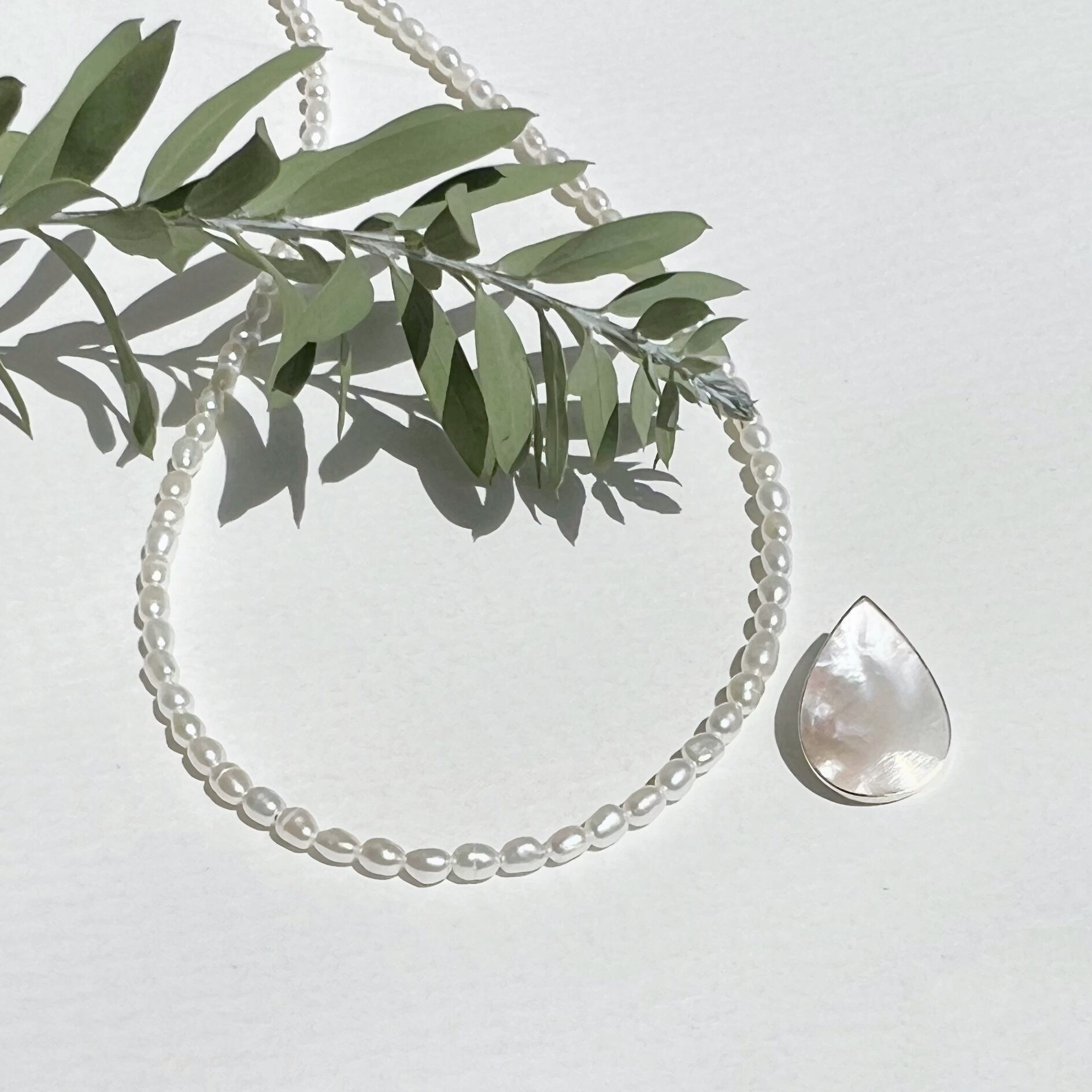 天然白蝶貝を使用したドロップトップと、小粒で使い勝手の良いパールネックレス。軽い着け心地でありながら、エレガントな雰囲気を演出します。