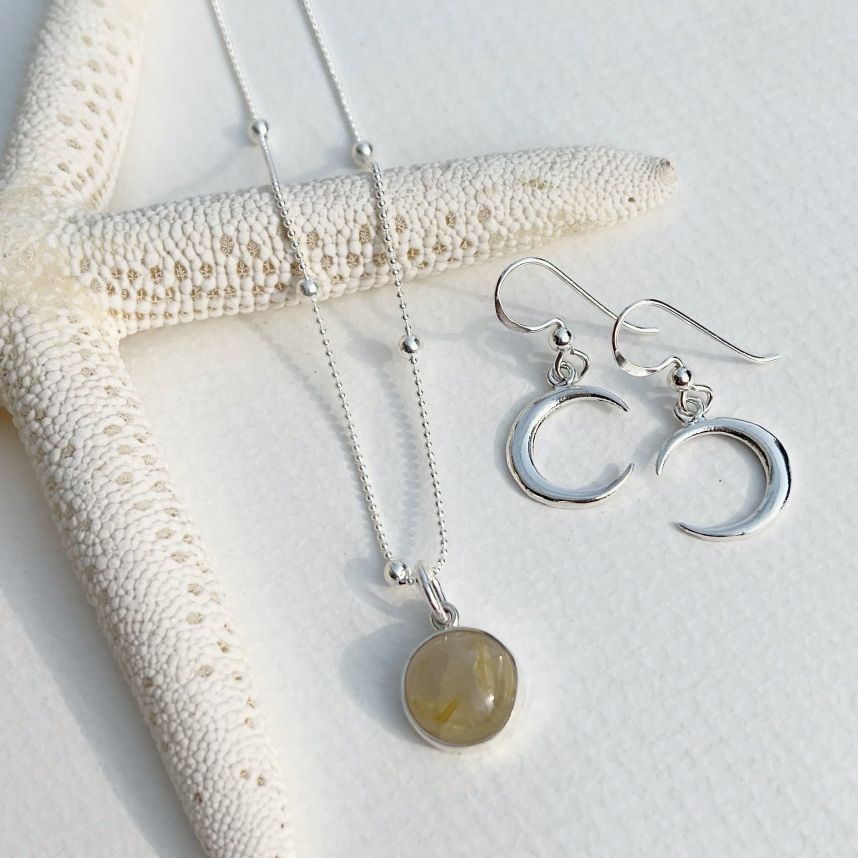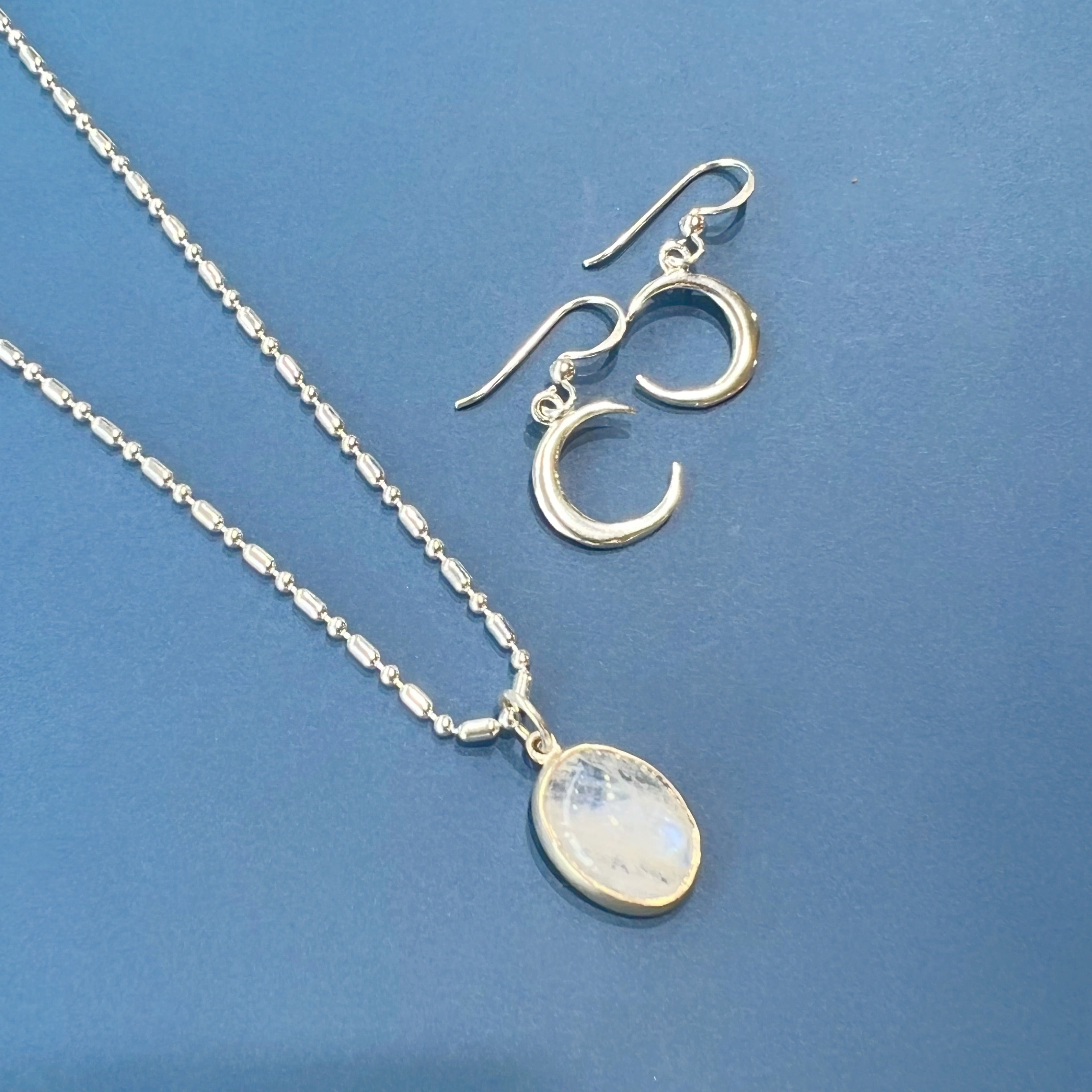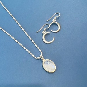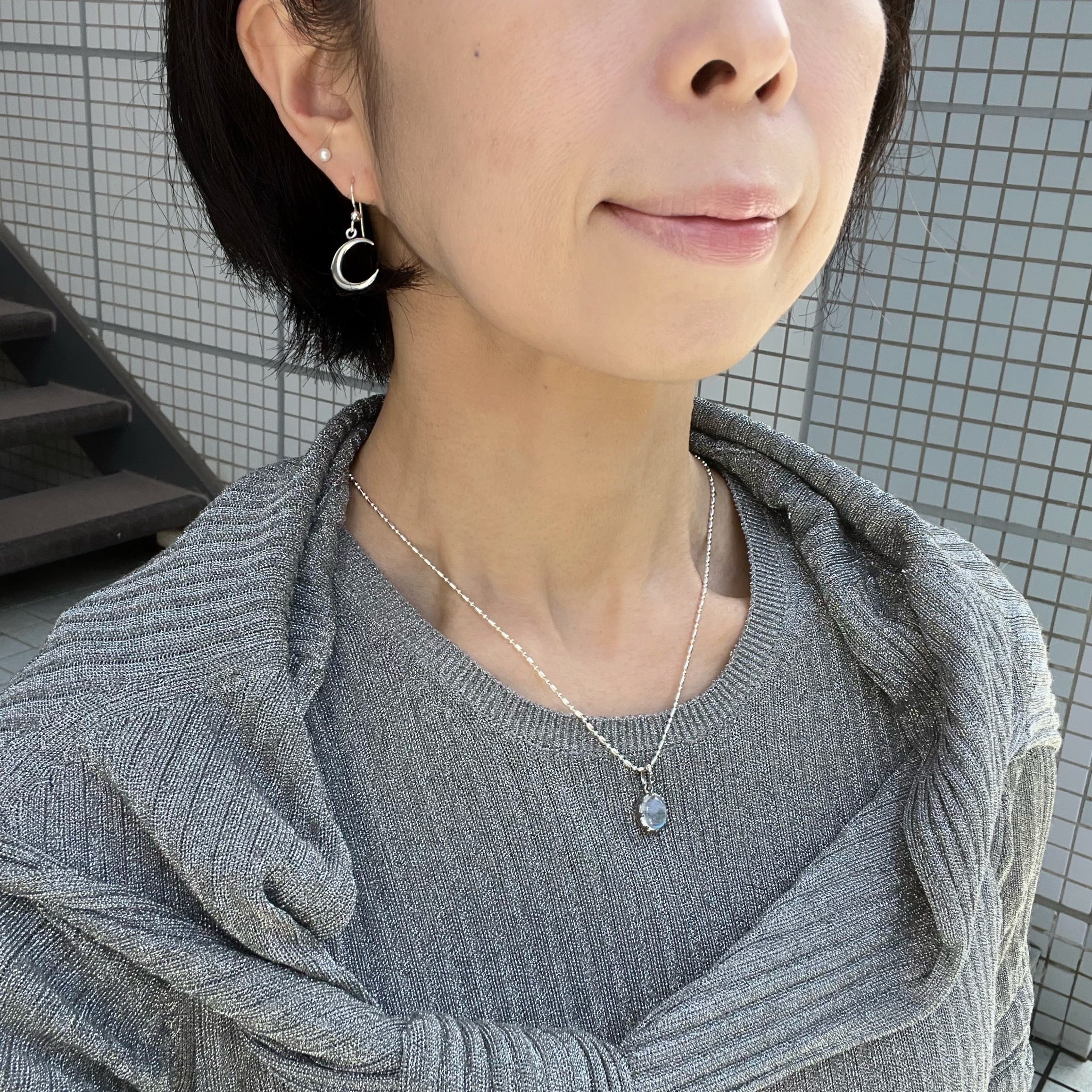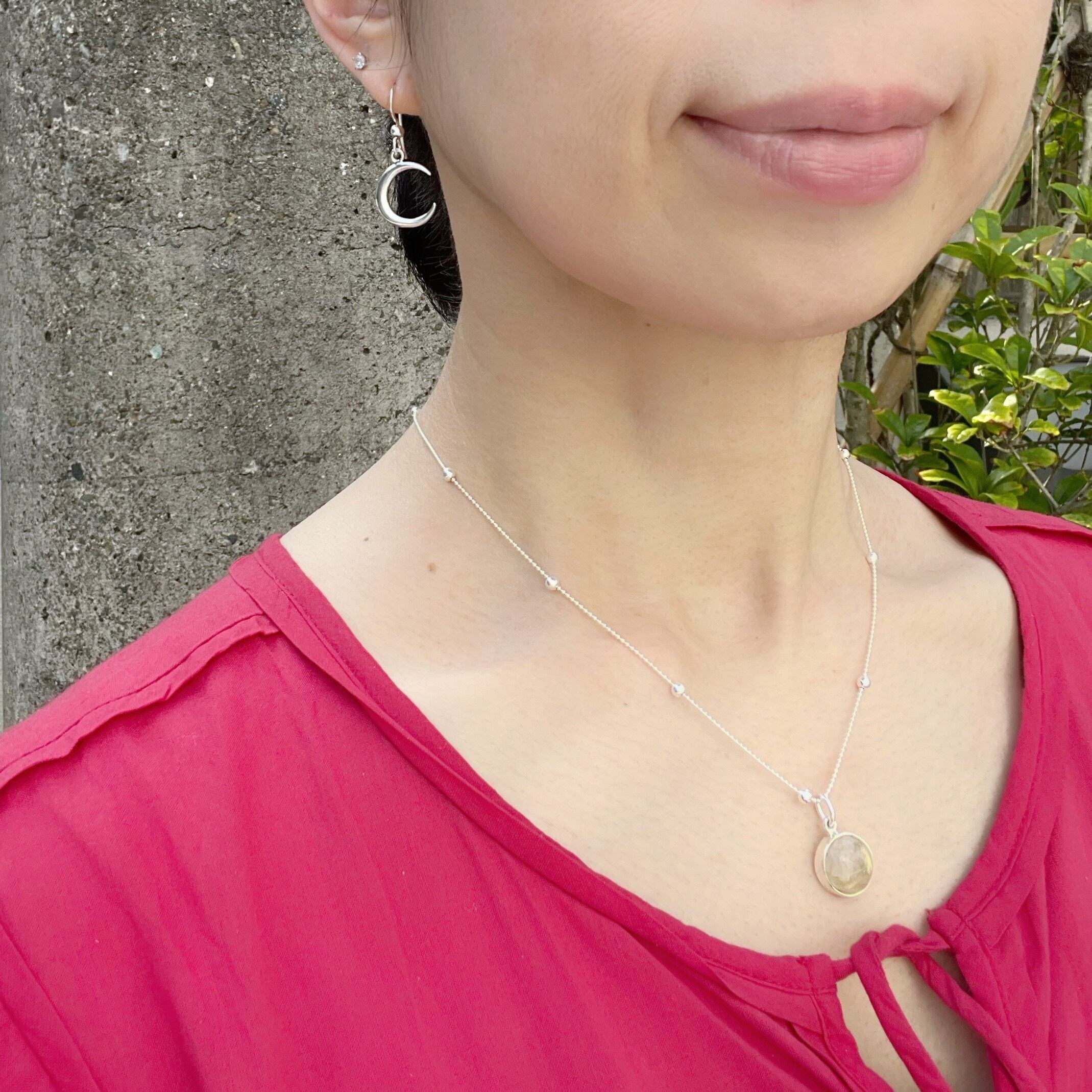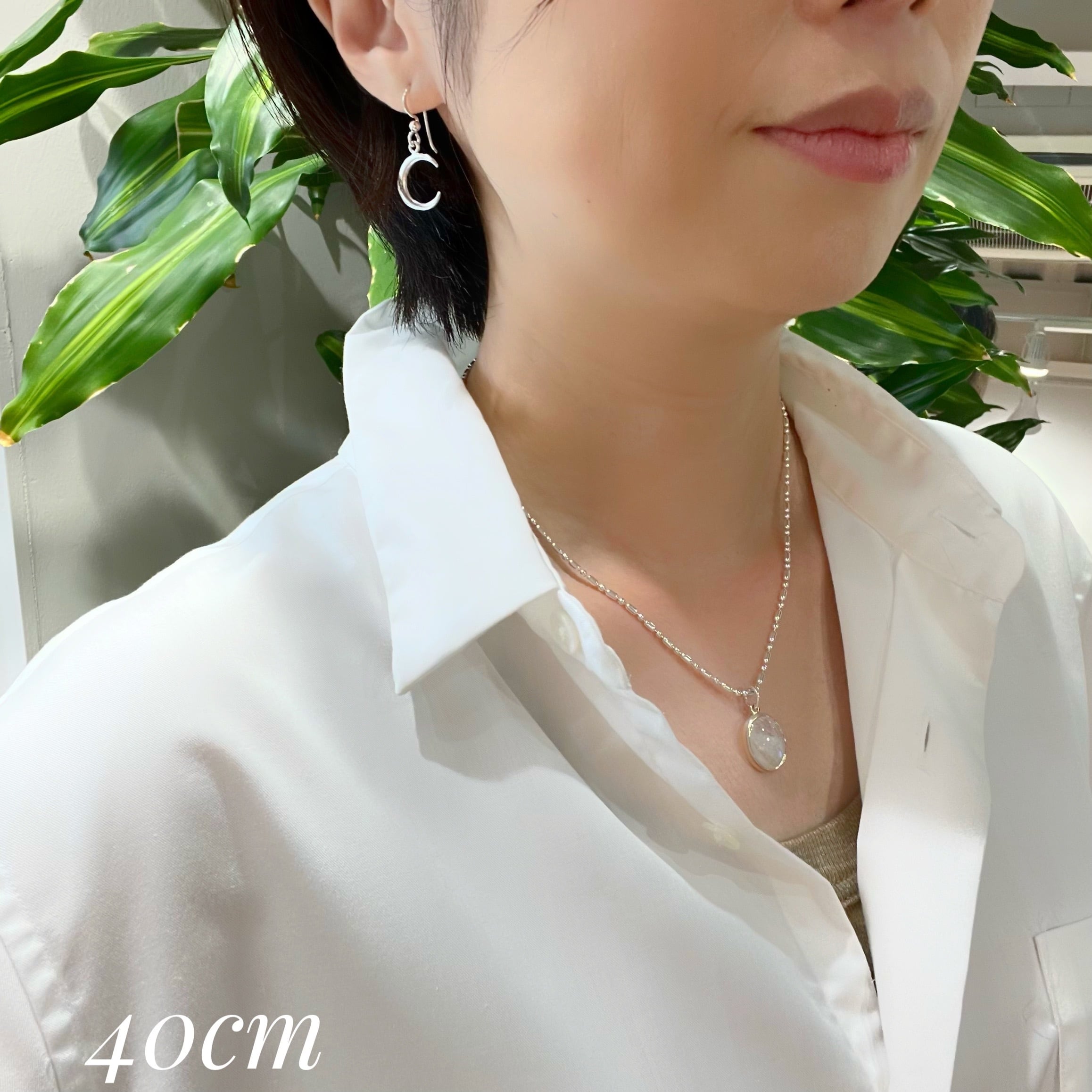 白シャツの着画は、レインボームーンストーンネックレスと合わせています