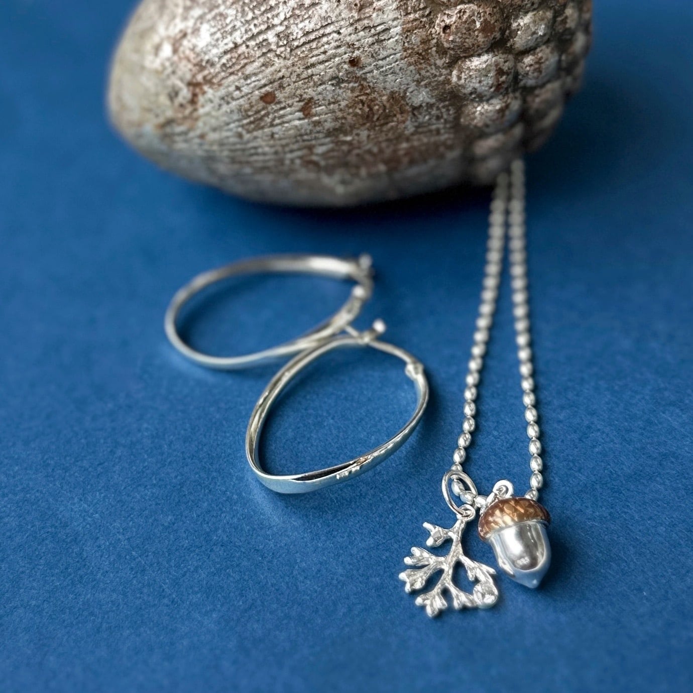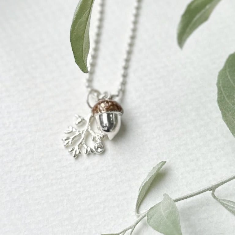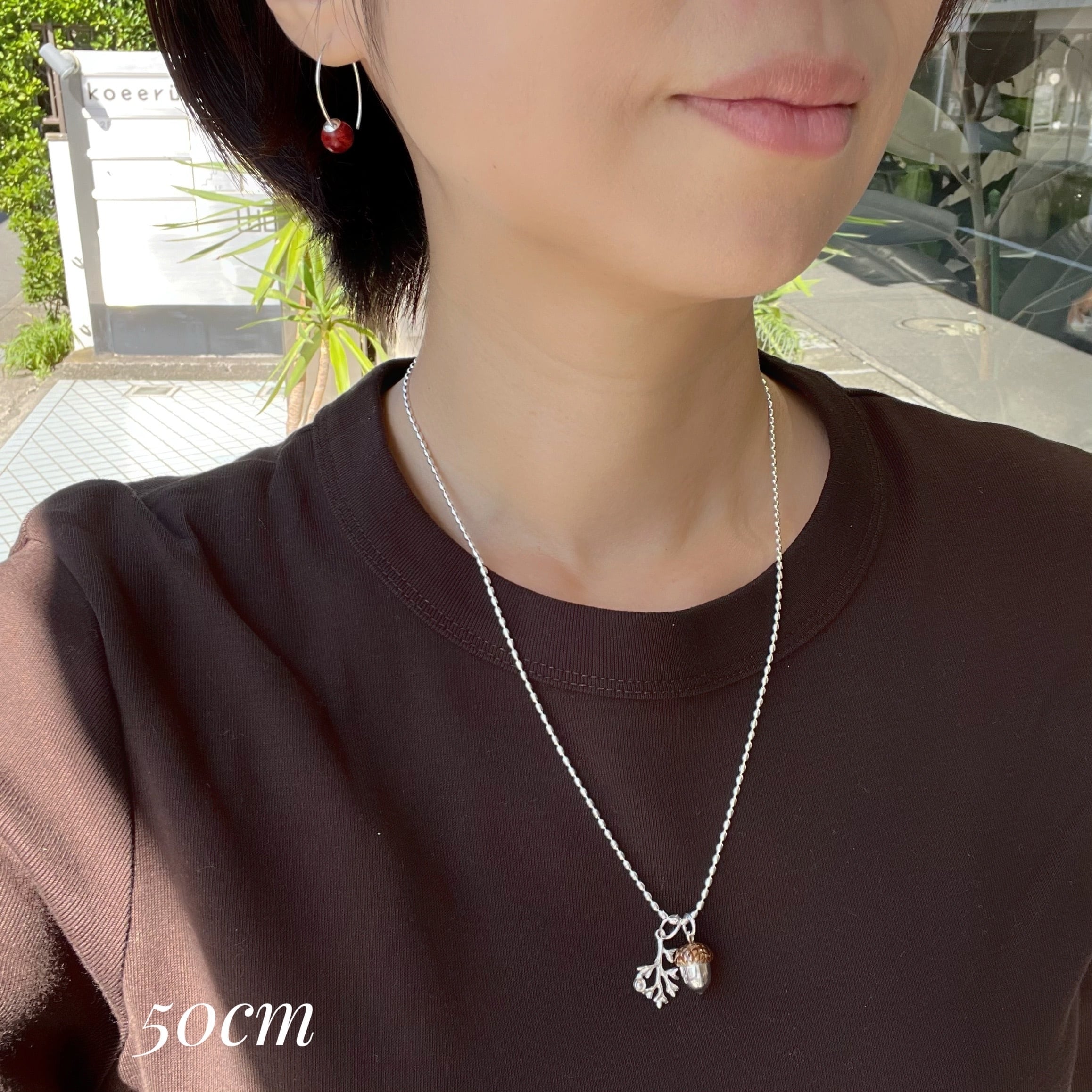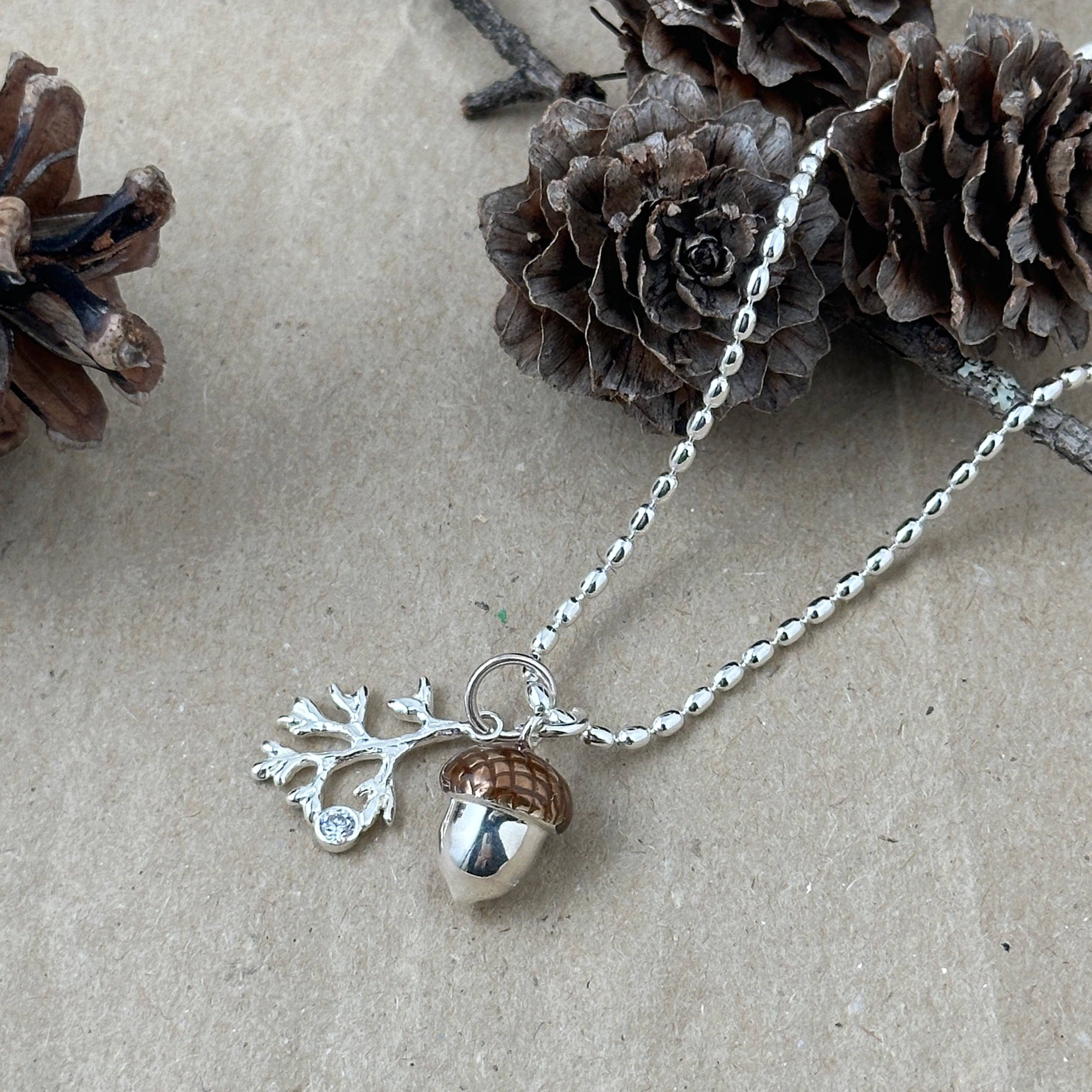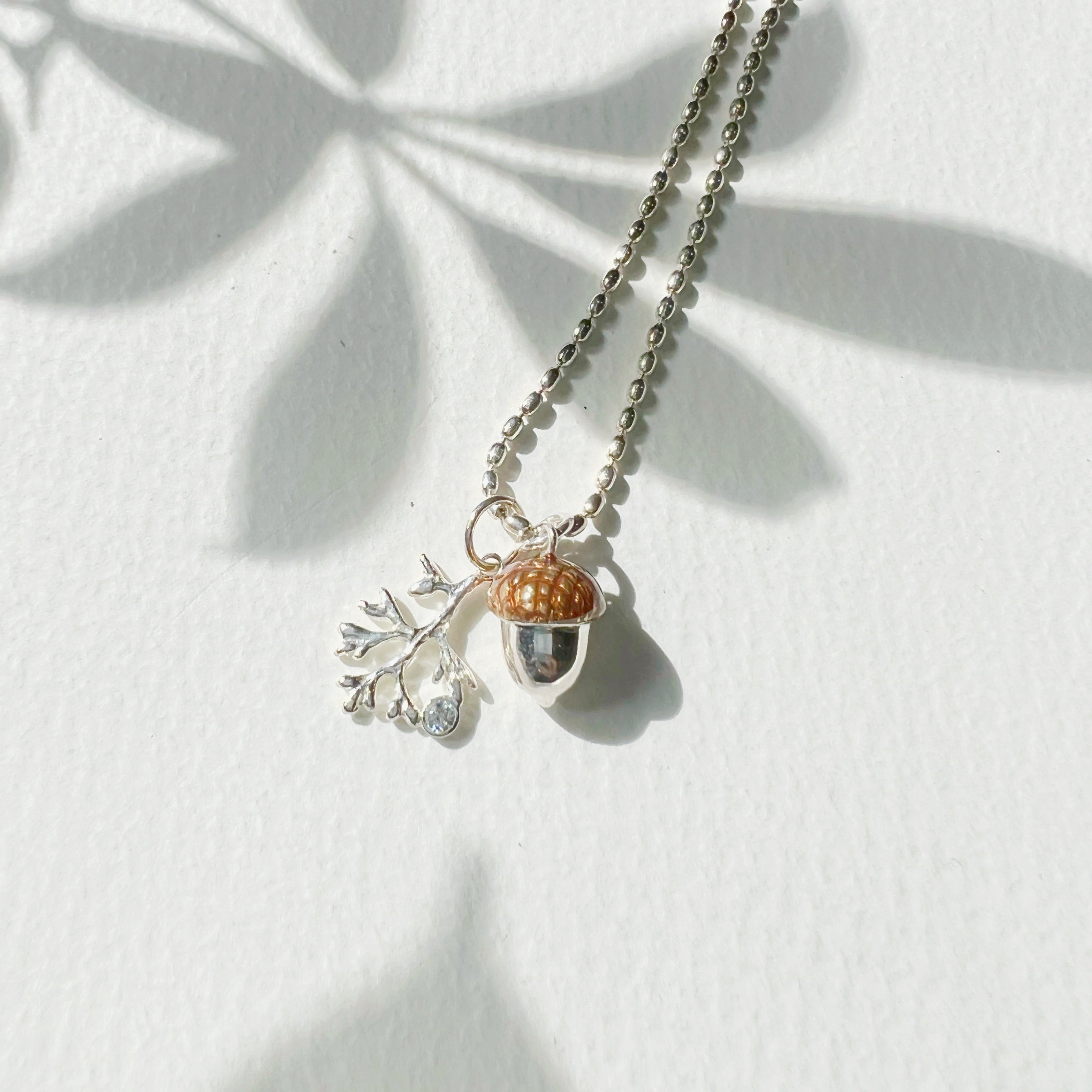 秋冬にも海を感じていたい方の為に、コロンとしたフォルムが可愛いどんぐりと 朝露がキラリと光る(ジルコニア)小枝を一緒にネックレスに通しました。