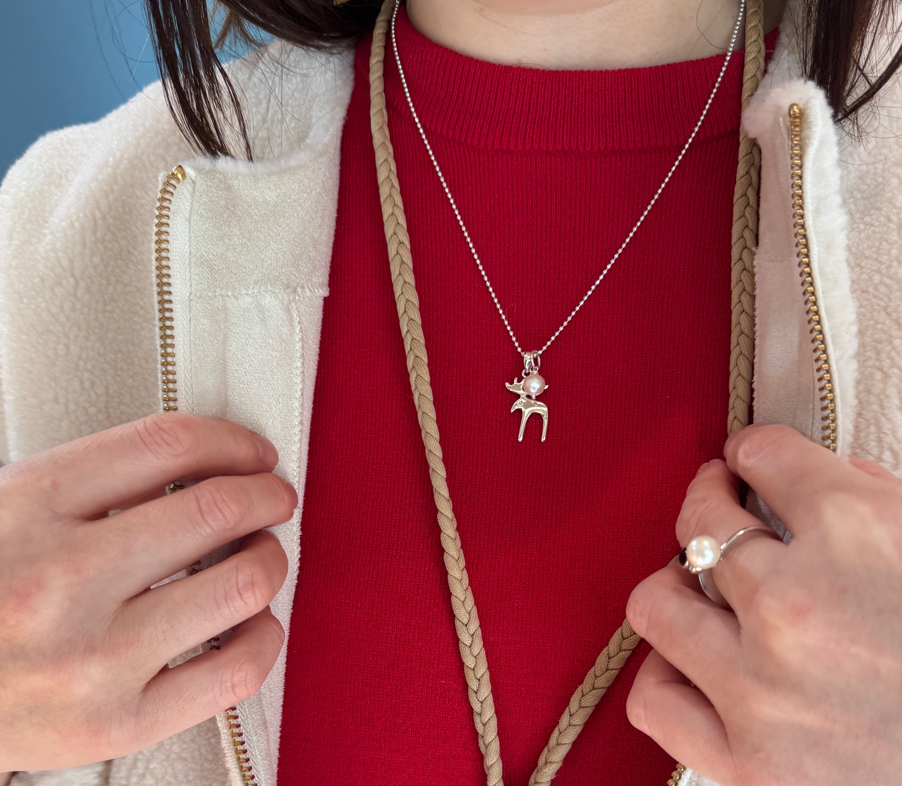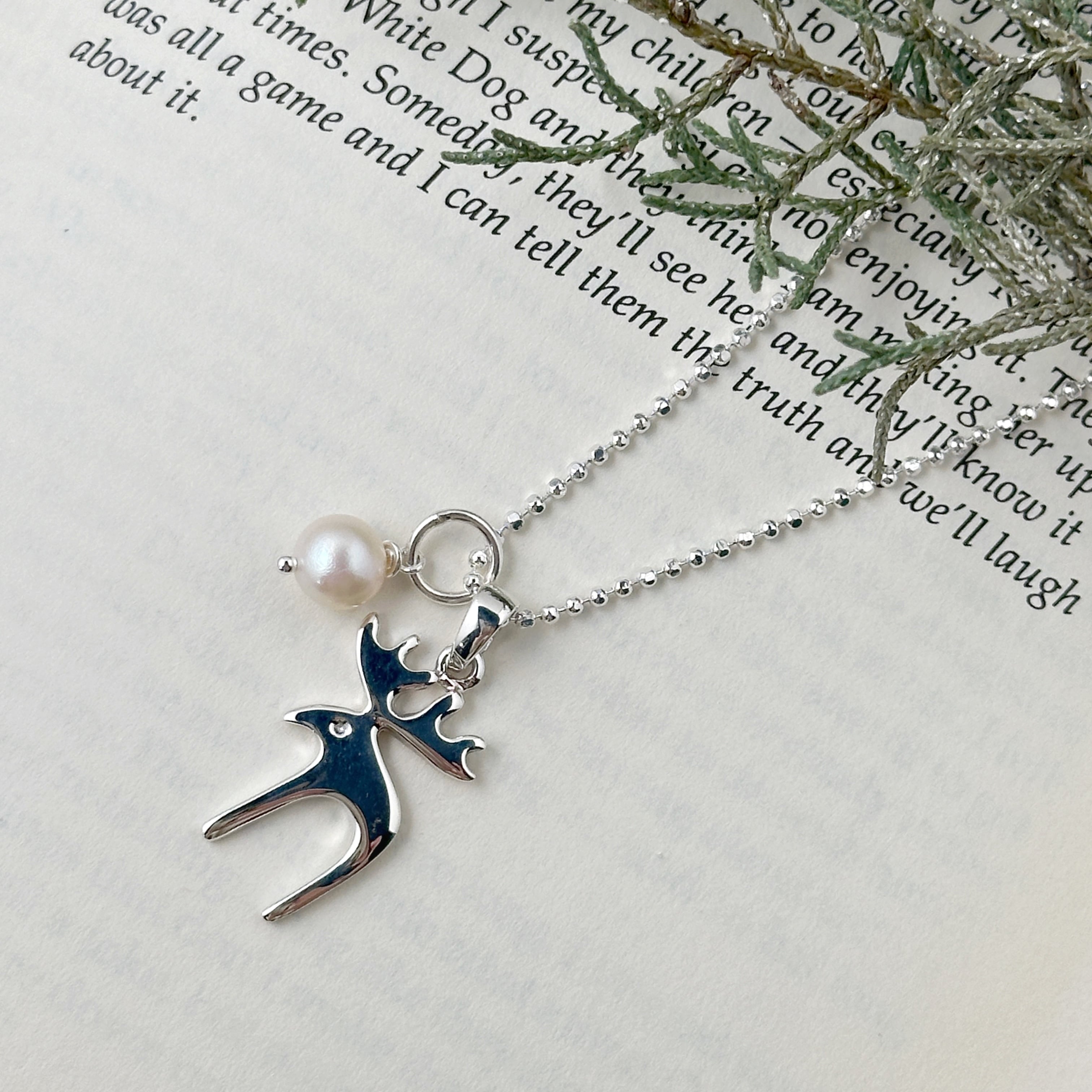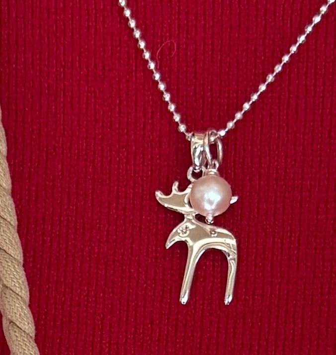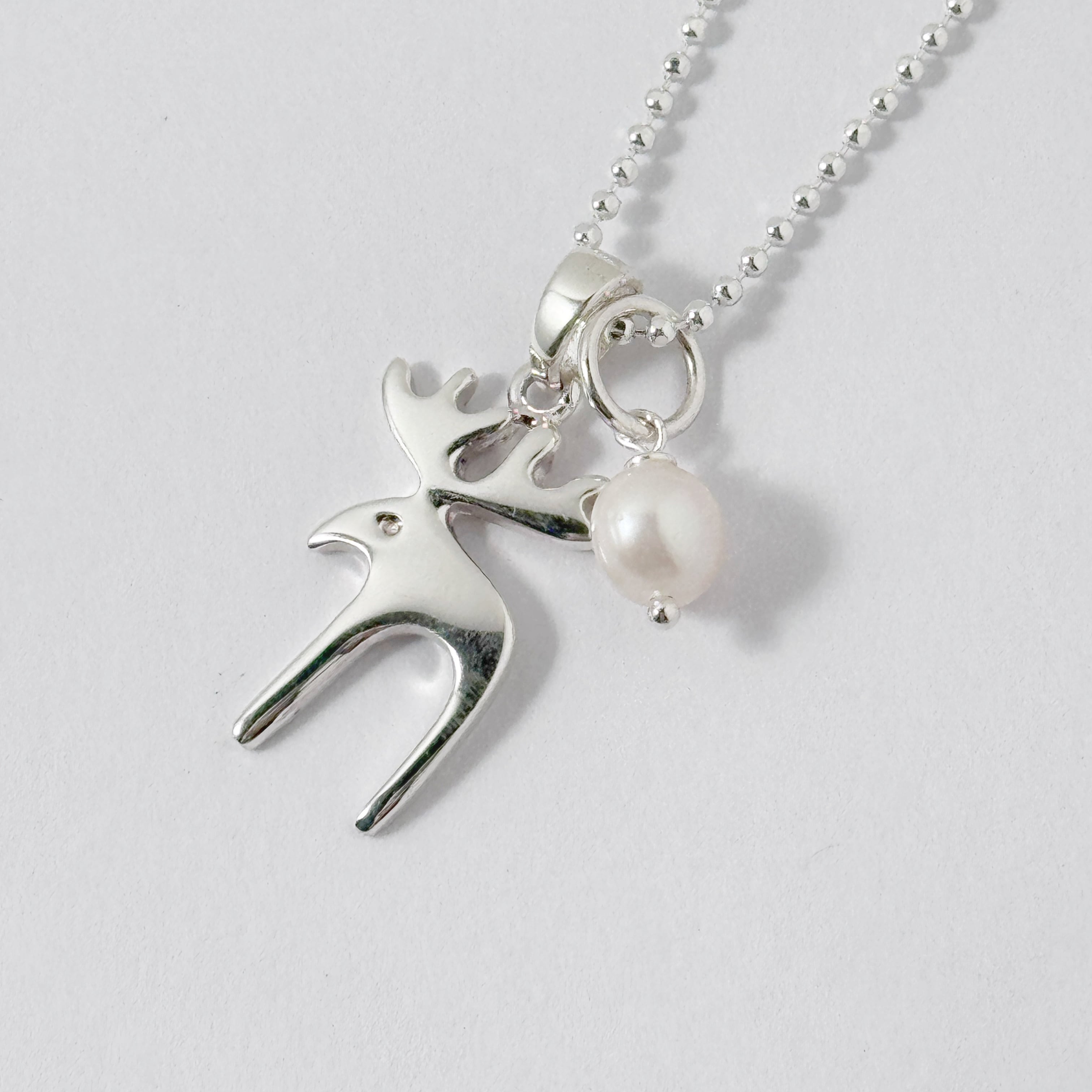 ロングセラーのおとぼけトナカイのネックレスにラグーンオリジナルのちいさなパールをセットして、