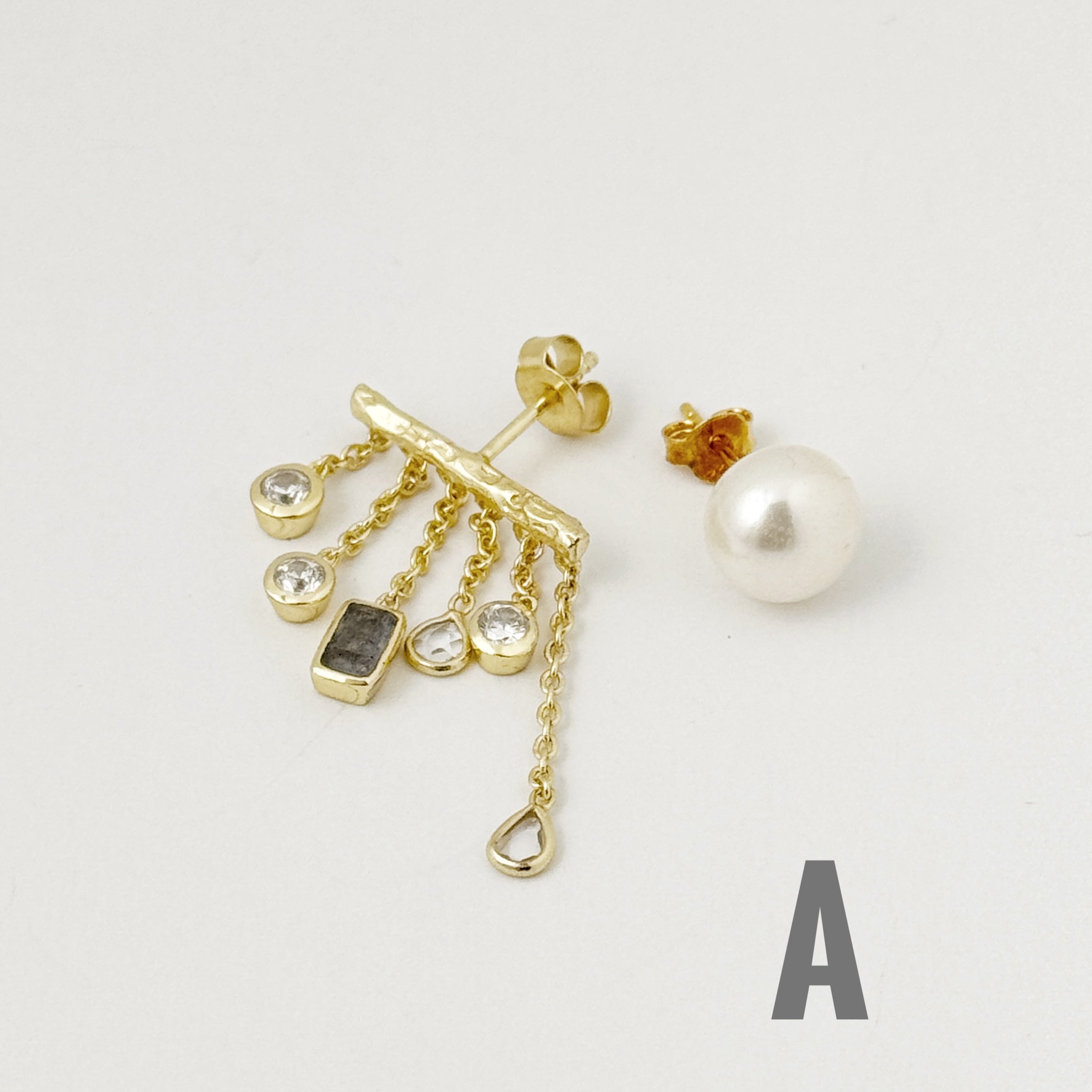 Gold Coating 6ストーン 五月雨 スタッドピアス+ 0.9cm スタッドパール の アシンメトリー ピアス フリンジ