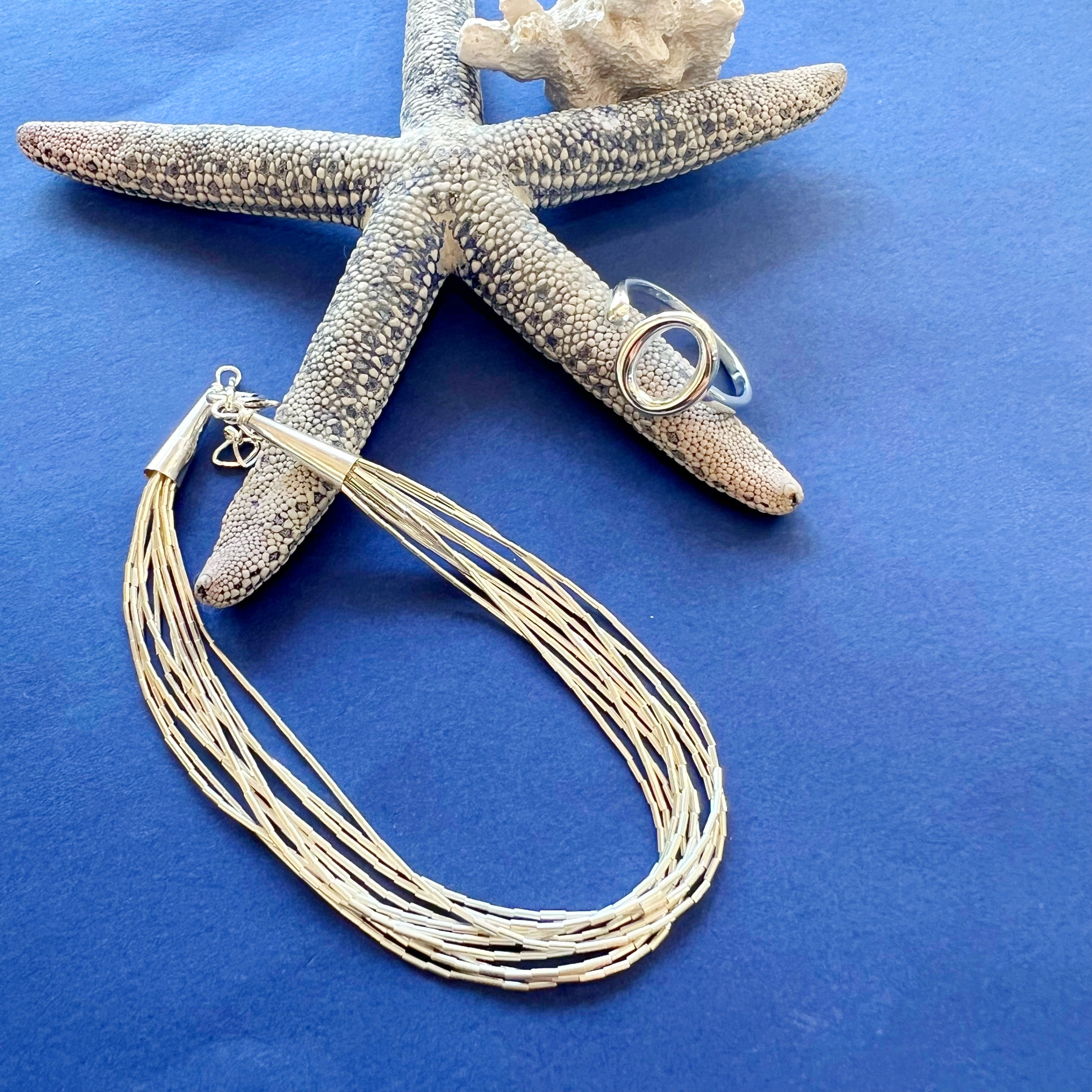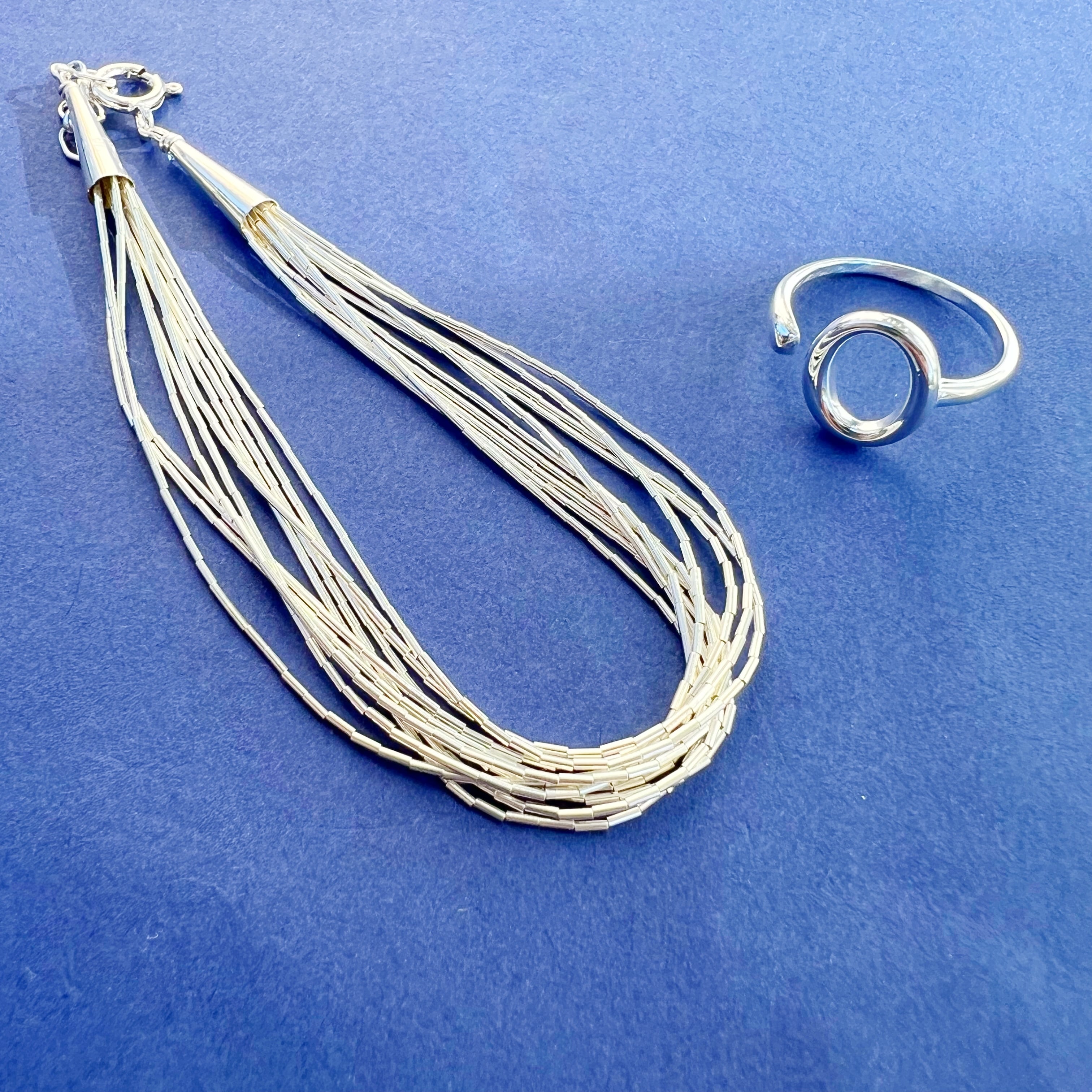 小さな小さなシルバー製筒状のビーズをストリングに通し、幾重にも重ねて作られたジュエリーのことを総称してこう呼びます。