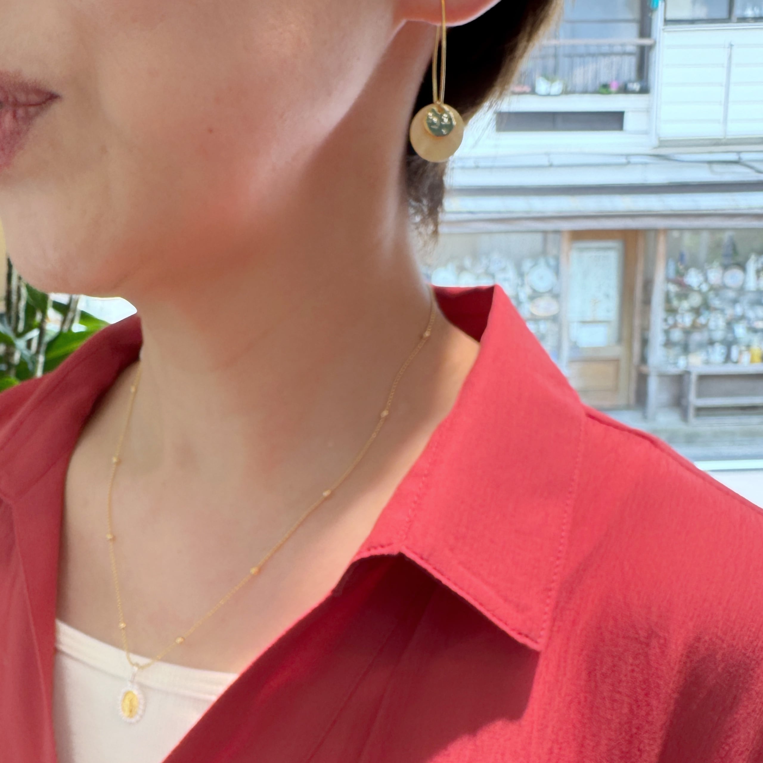 イエローシェルのプレートと、ゴールドを叩いたプレートを合わせて仕立てた大人な雰囲気漂うフックピアス。