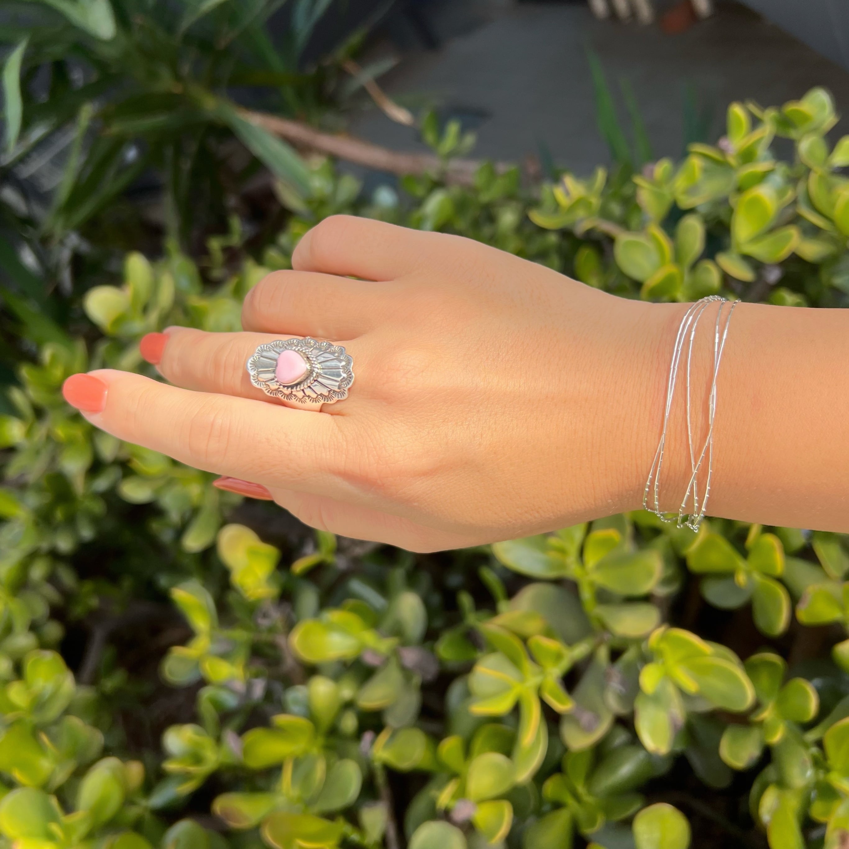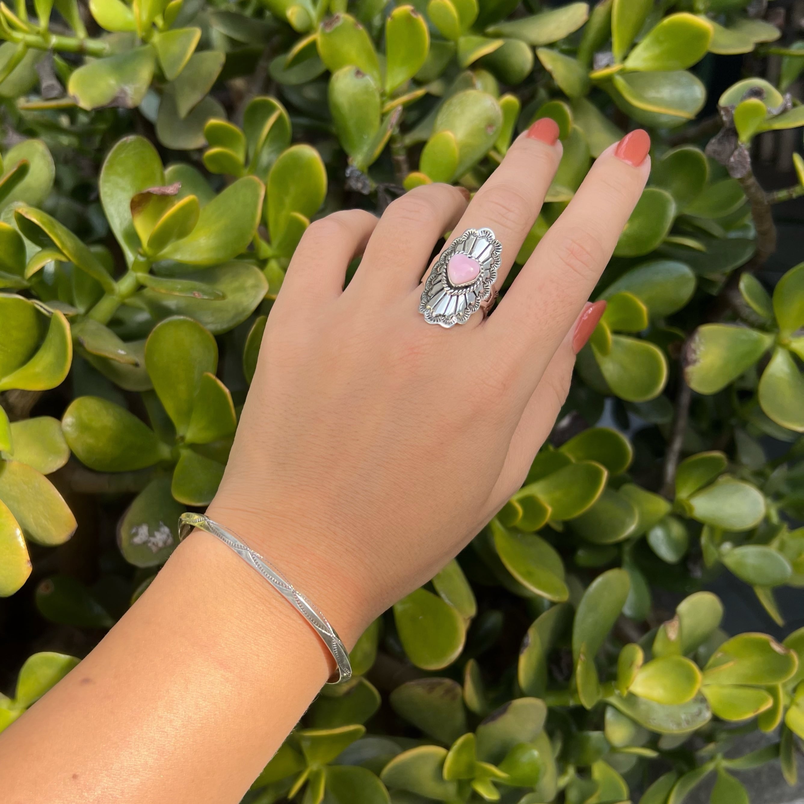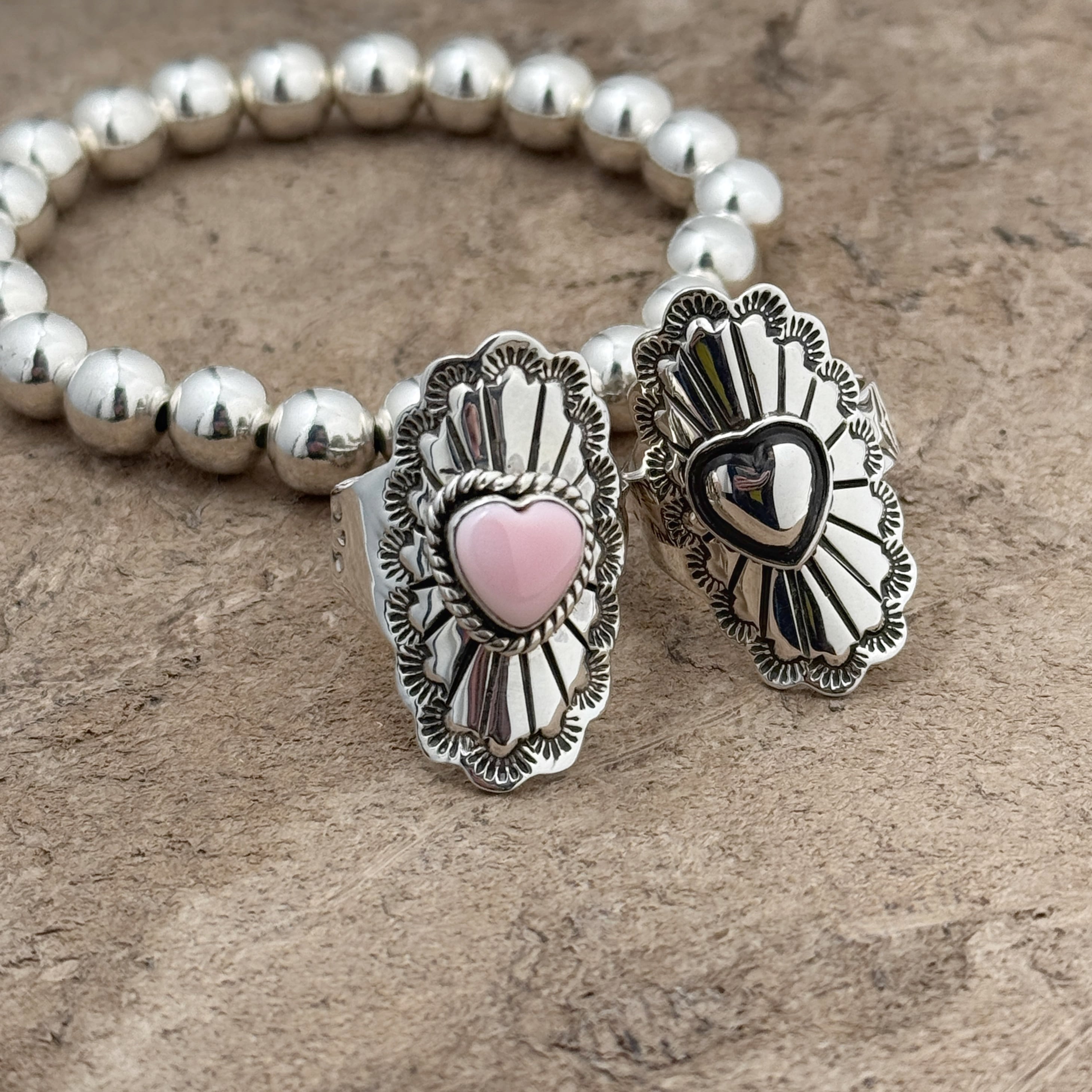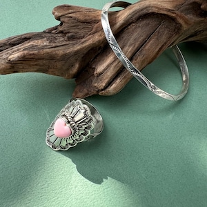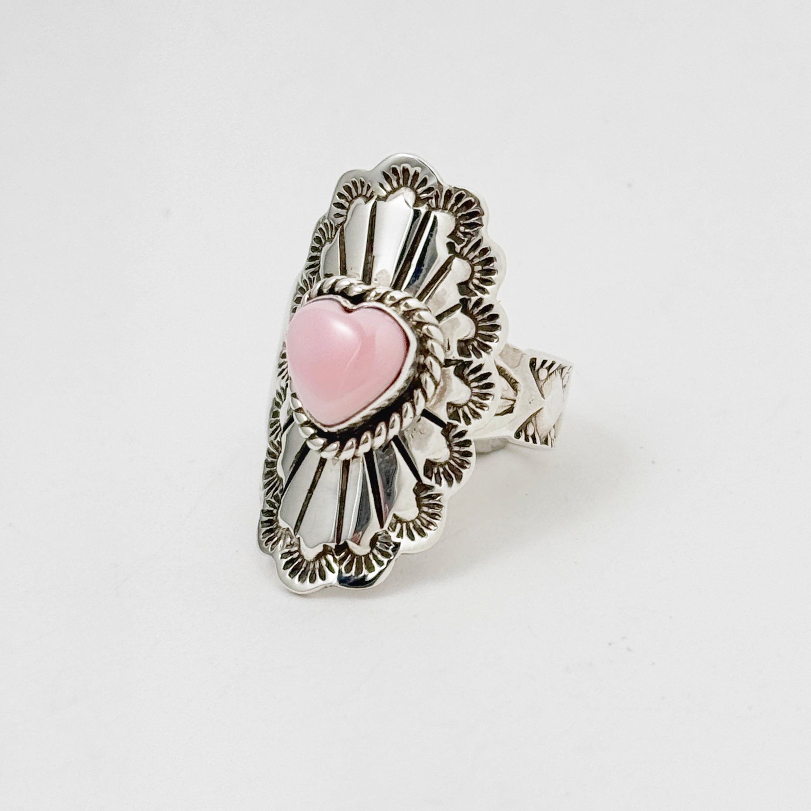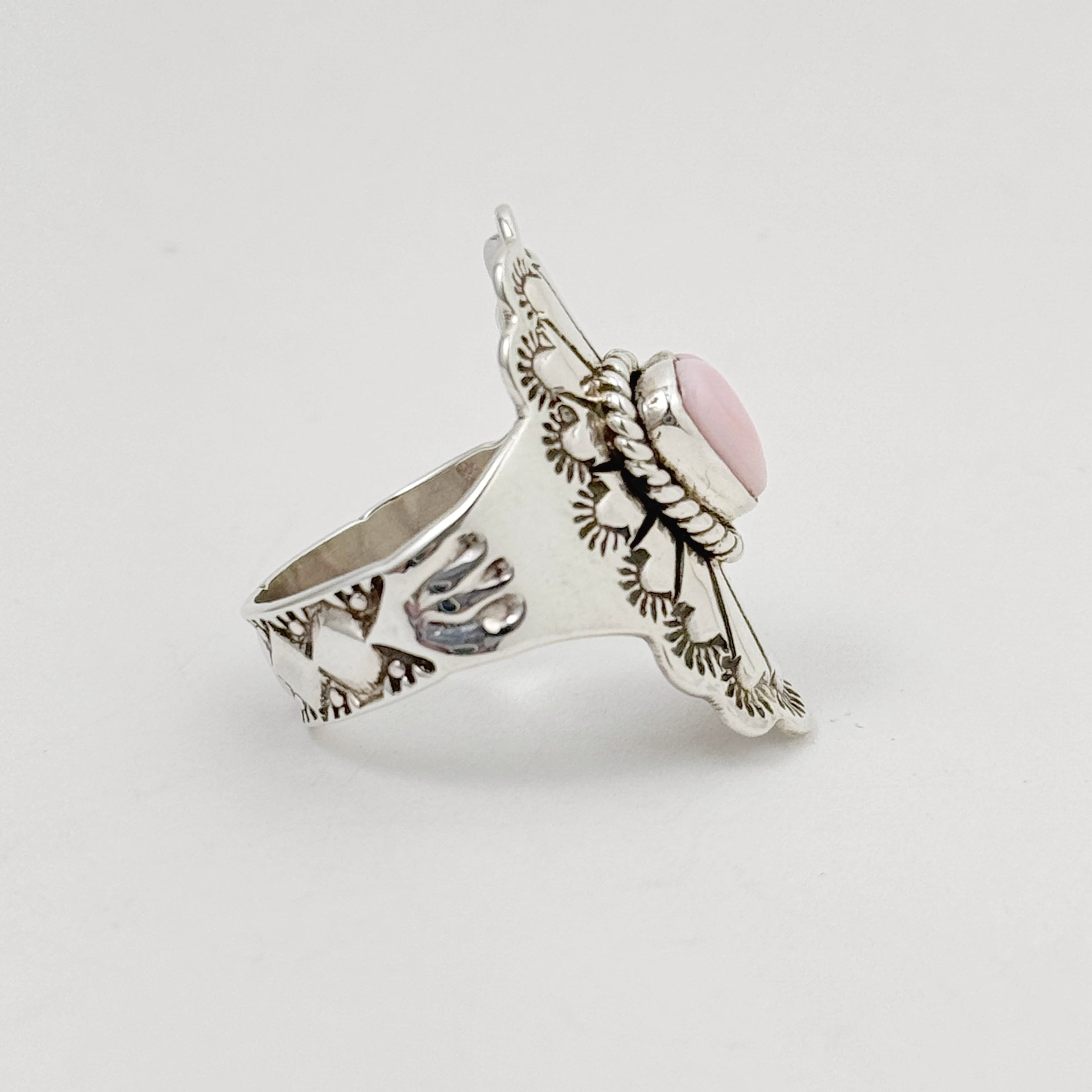 やさしい色味のコンクシェルをセンターにセットし、シルバーには繊細なスタンプワークを施したバホ族 の作品。