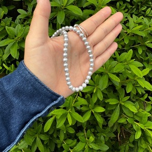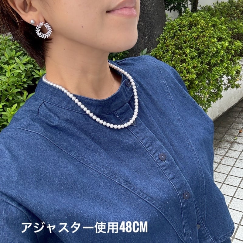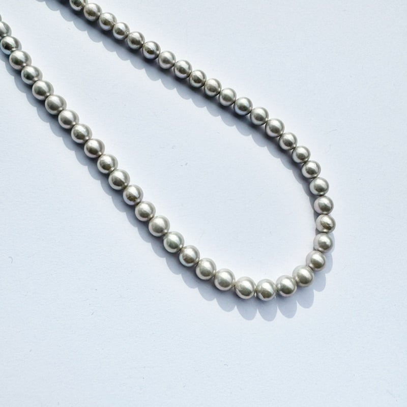 ブラックパールといっても明るめのブラックパールになります。グレーに近いお色なので重くなりすぎず、カジュアルにもデニムシャツやスウェットにも合わせられます。